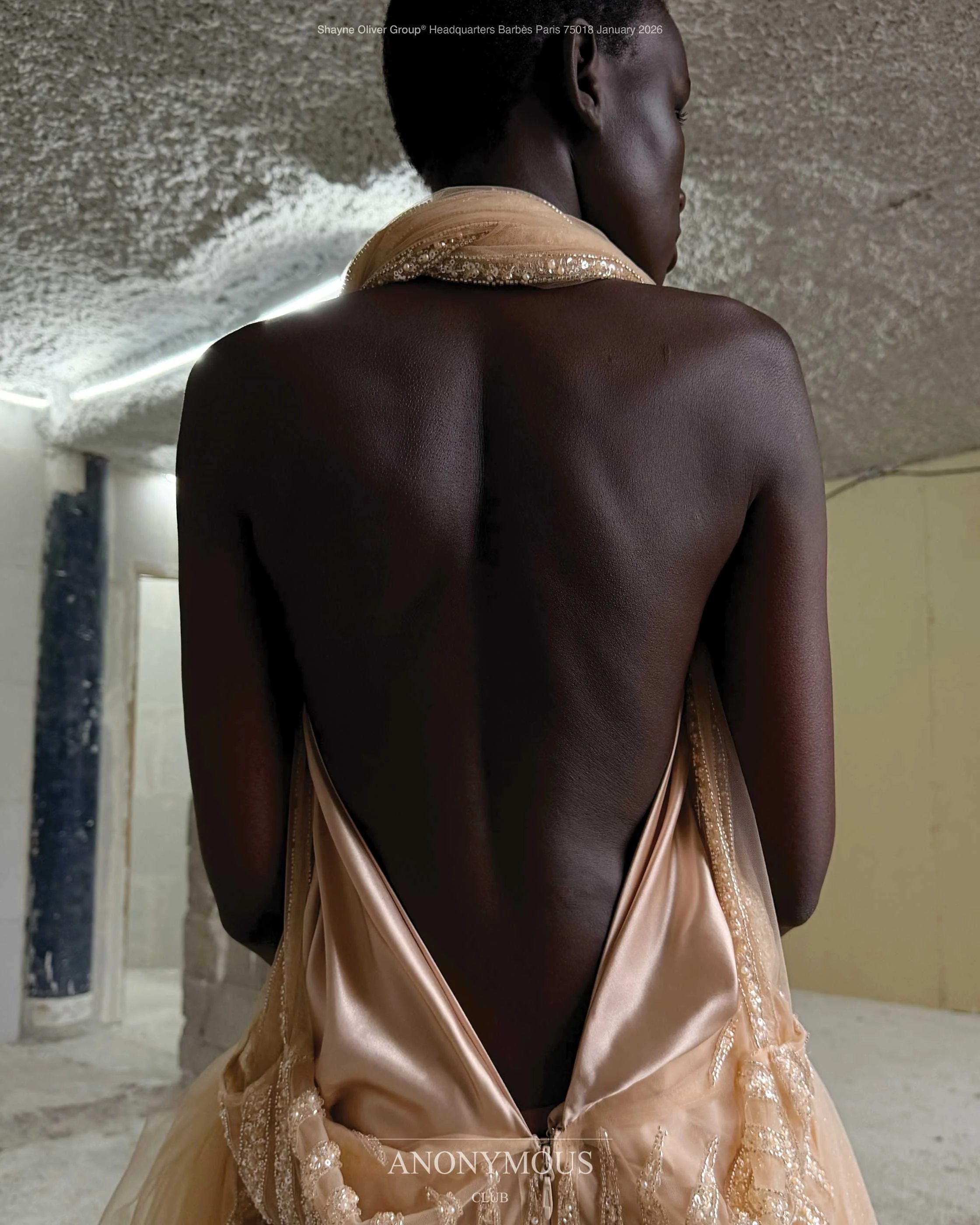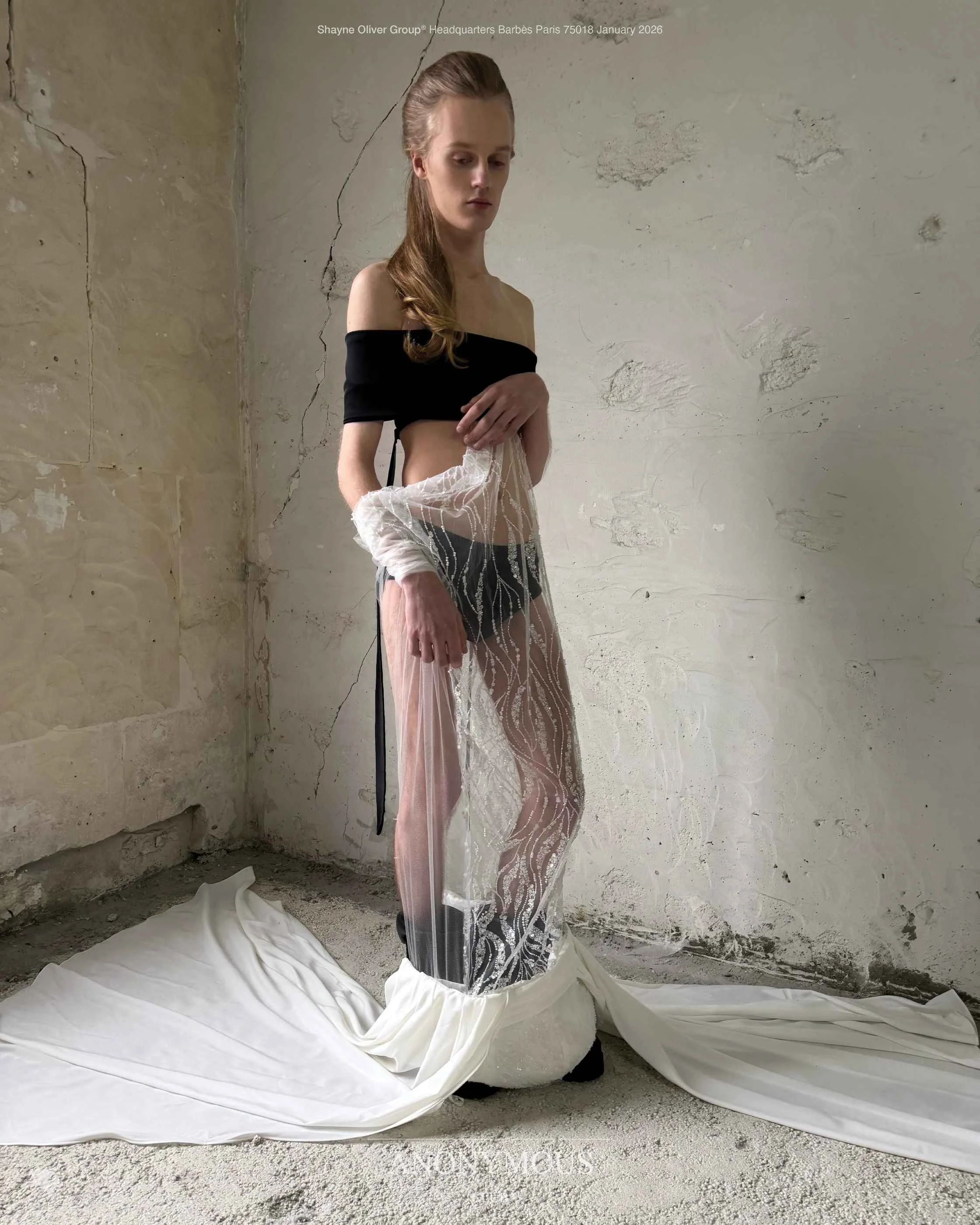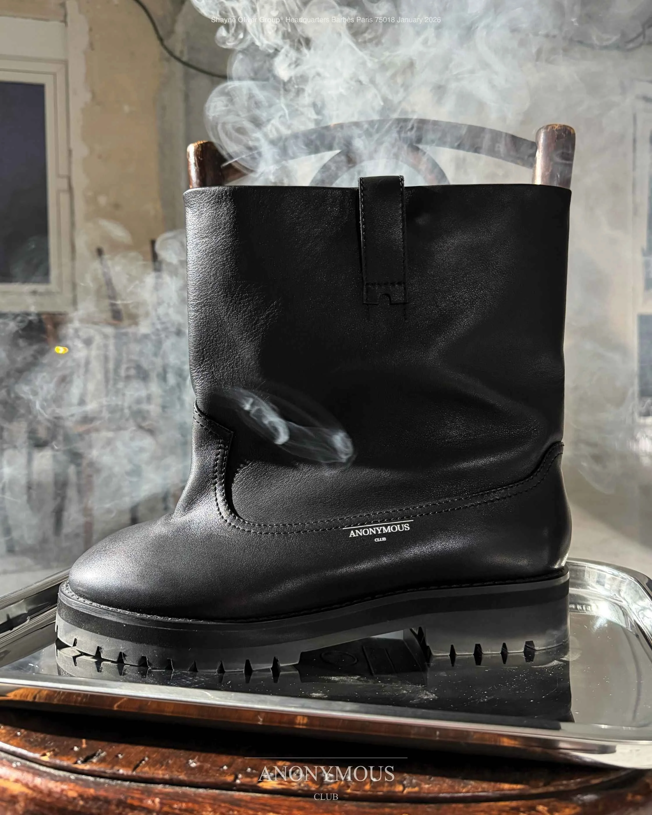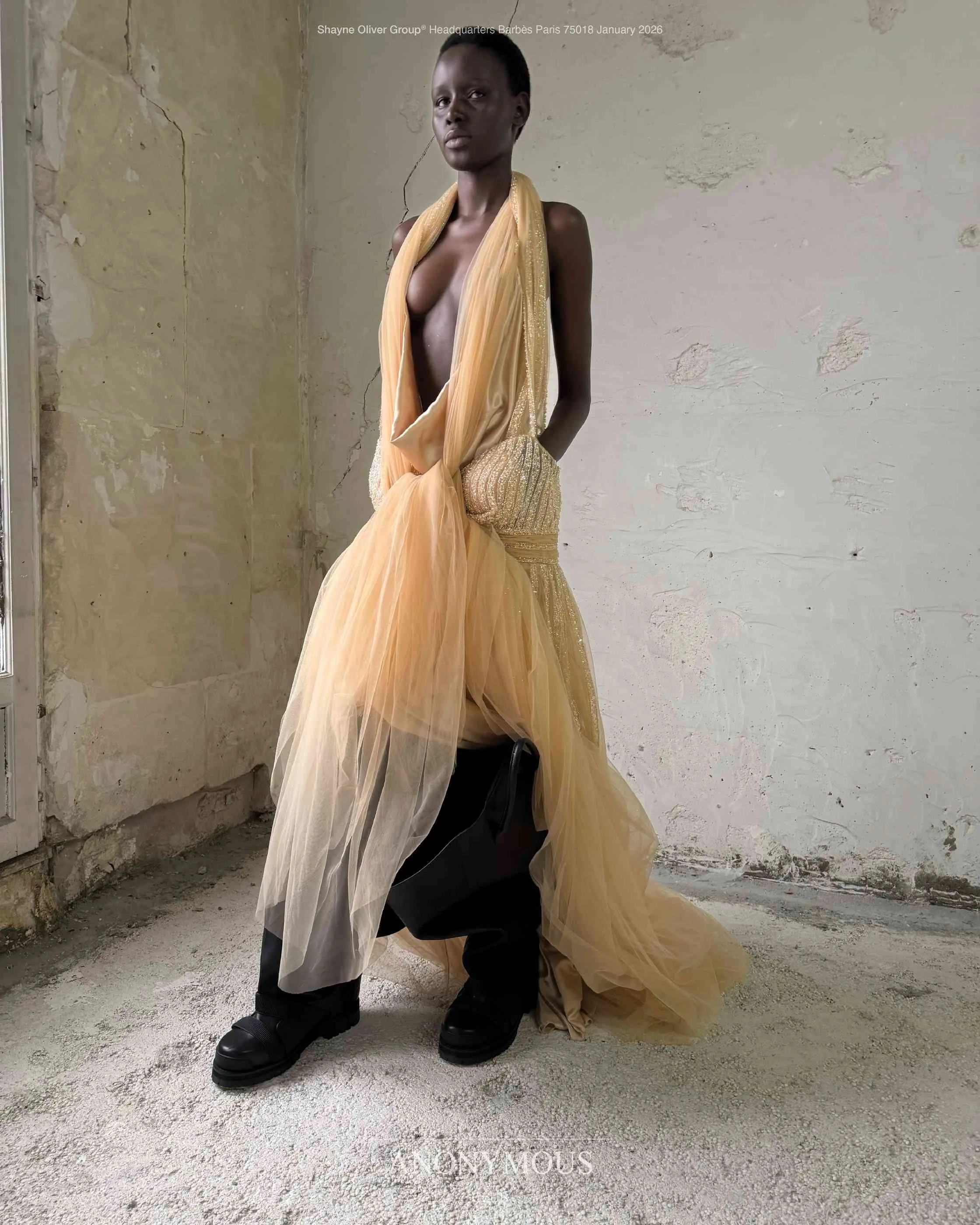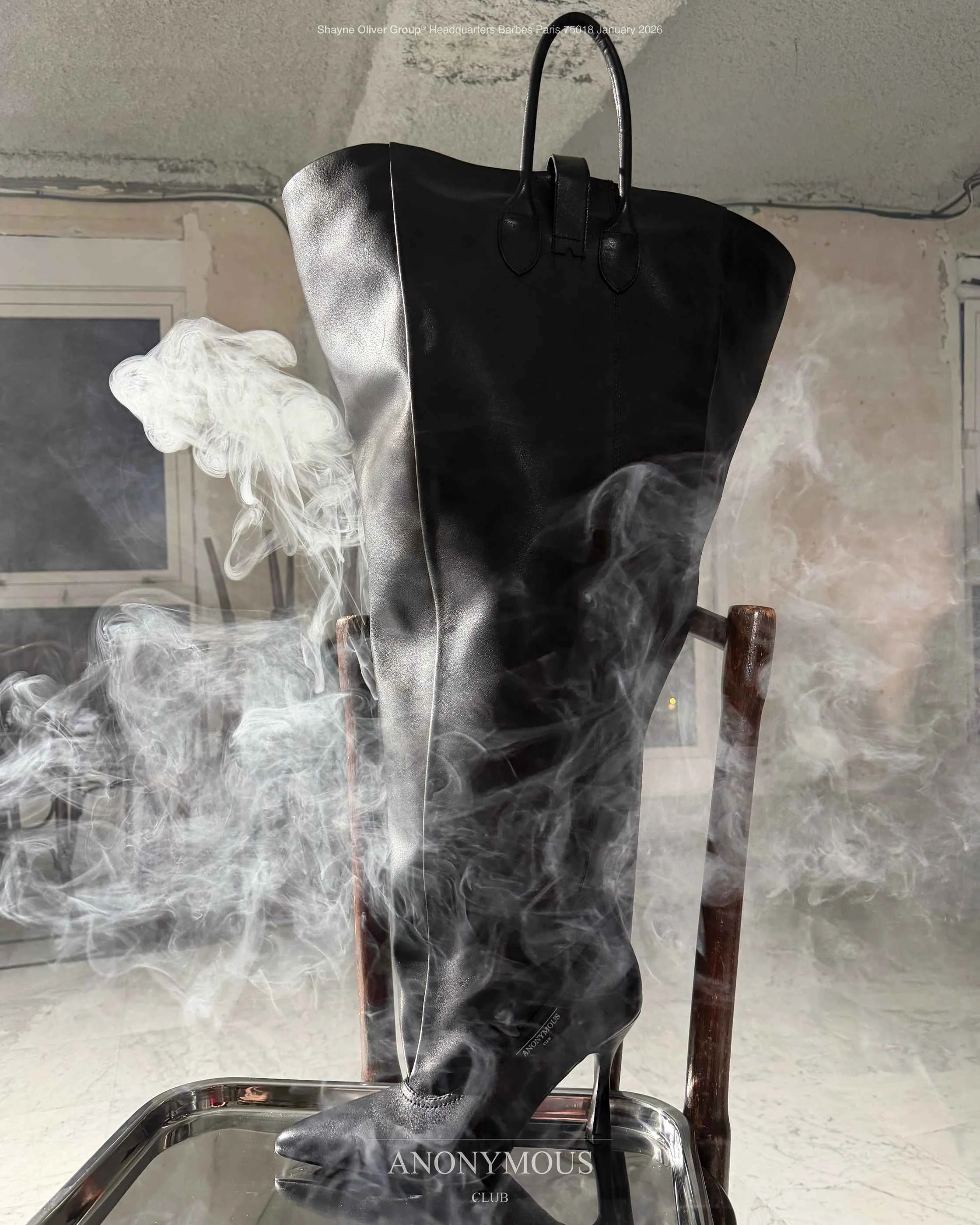 The Shaft Boot arrives not as accessory but as argument. From it, the entire January 2026 collection by Shayne Oliver Group®, staged at Headquarters Barbès, Paris 75018, takes its structural cue. The boot is vertical force made physical: a line drawn from ground to body that tells every other element in the collection how to behave.