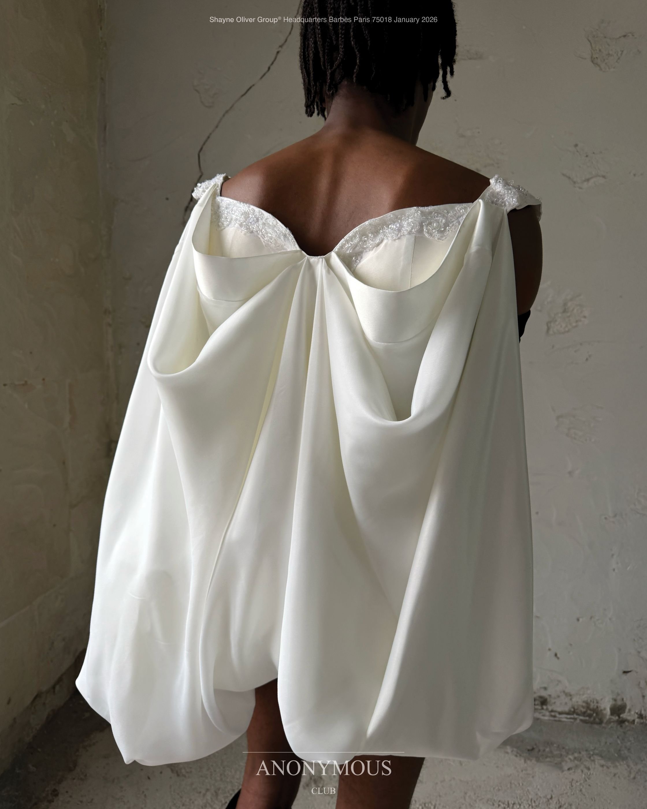 The garments follow with the same logic of controlled undoing. Dresses and formal uniforms, pieces originally made for repetition, for systems, for institutions, are taken back to their component parts. Machine stitching is unpicked. Seams come open. Then, by hand, the material is redraped, reconstructed, returned to the body in a new configuration. What was industrial becomes intimate. What was anonymous becomes considered.