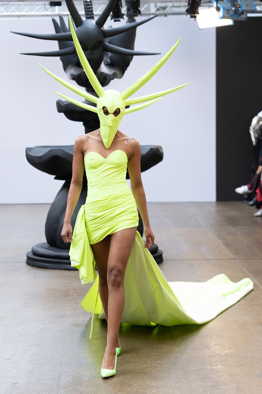 QiQi Yuan was inspired by China's developing young culture; the collection includes masks depicting diverse roles and characteristics of today's youth. The collection's ready-to-wear pieces include basic patterns and appealing methods, as well as the brand's distinctive materials like cotton, silk, taffeta, satin, and PU leather. The collection also includes resin-printed 3D wearable electronics, highlighting the brand's dedication to creativity and innovation.