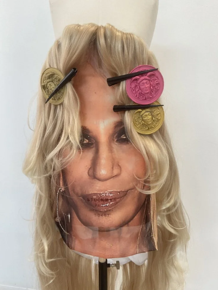 My inspiration came from the house of Versace as a maker of icons. I was pulling from the visual aesthetics of Warhol's face iconography, and pop art to decode what makes Versace so culturally iconic and recognizable. Donatella’s instantly recognizable blonde hair was an obvious choice but I also experimented with other Versace icons. I had a Deep v-neck 90s Madonna slip, a Naomi Campbell corset, and a curly redhead Linda Evangelista with a curler hair train gown.