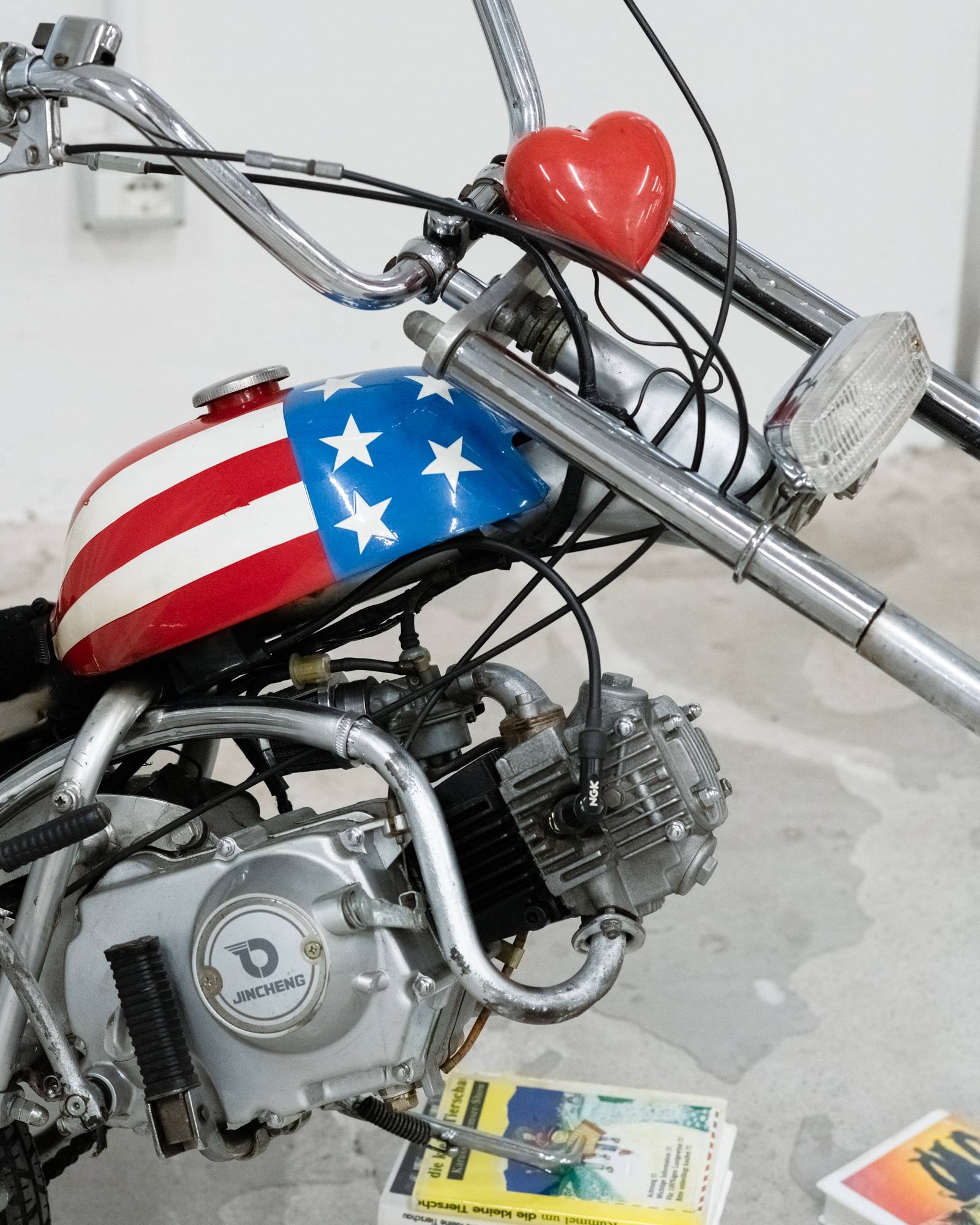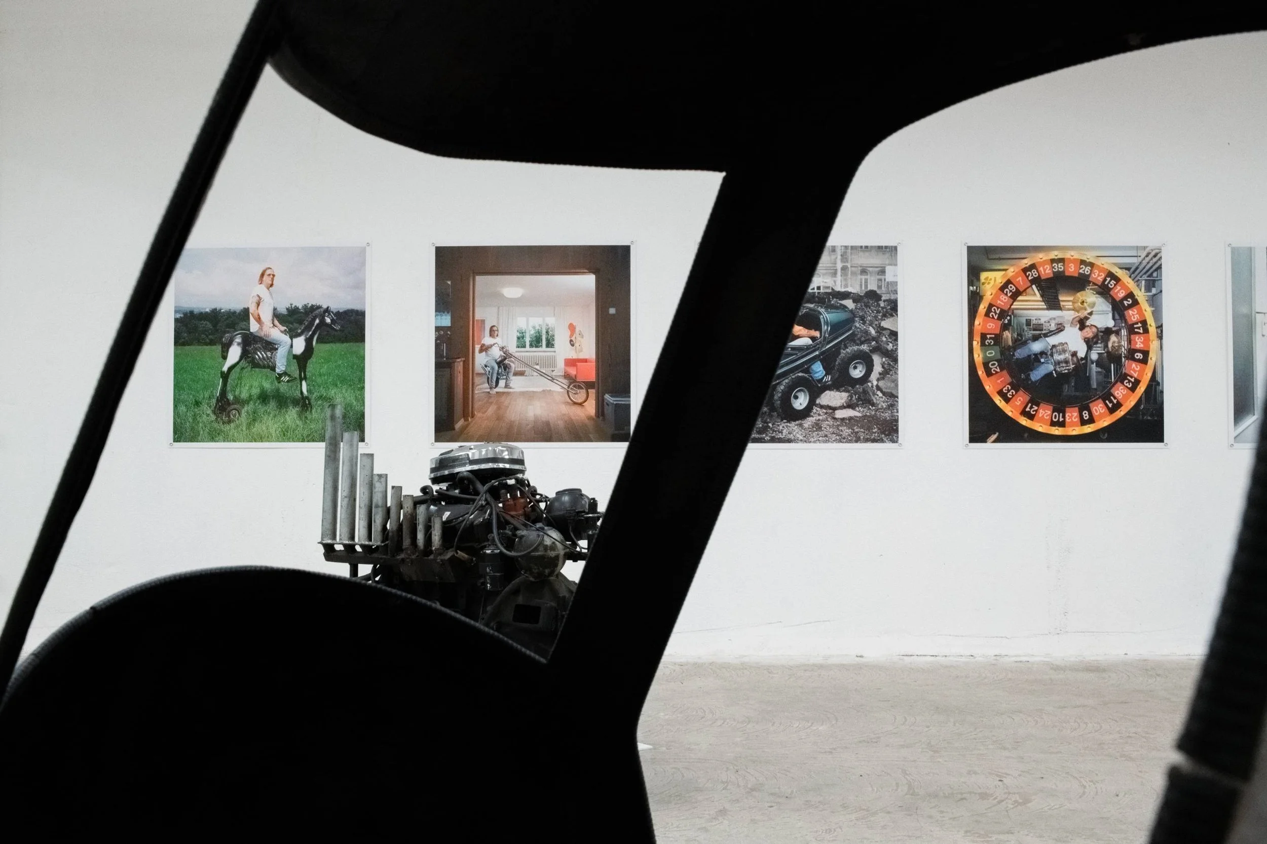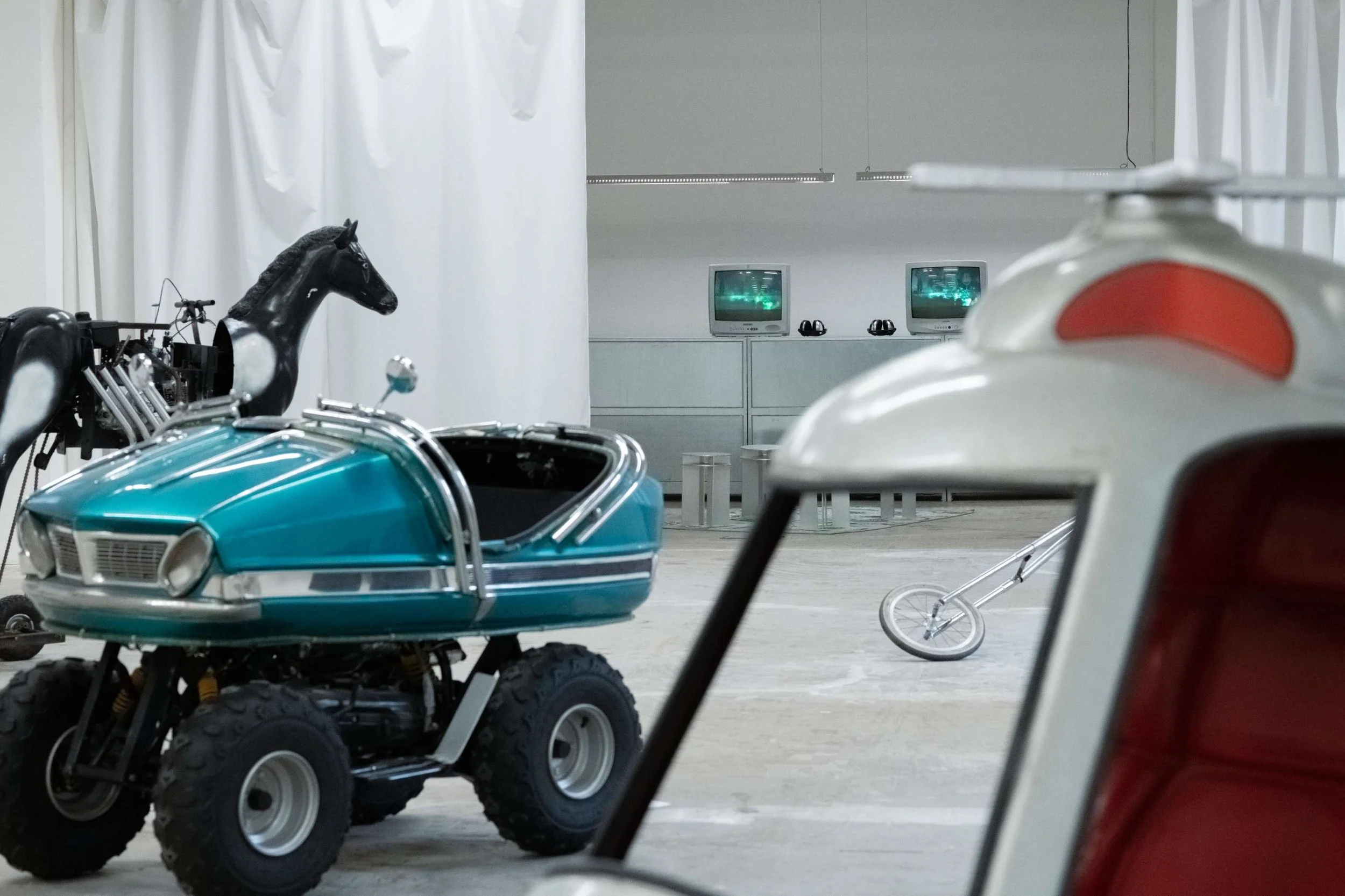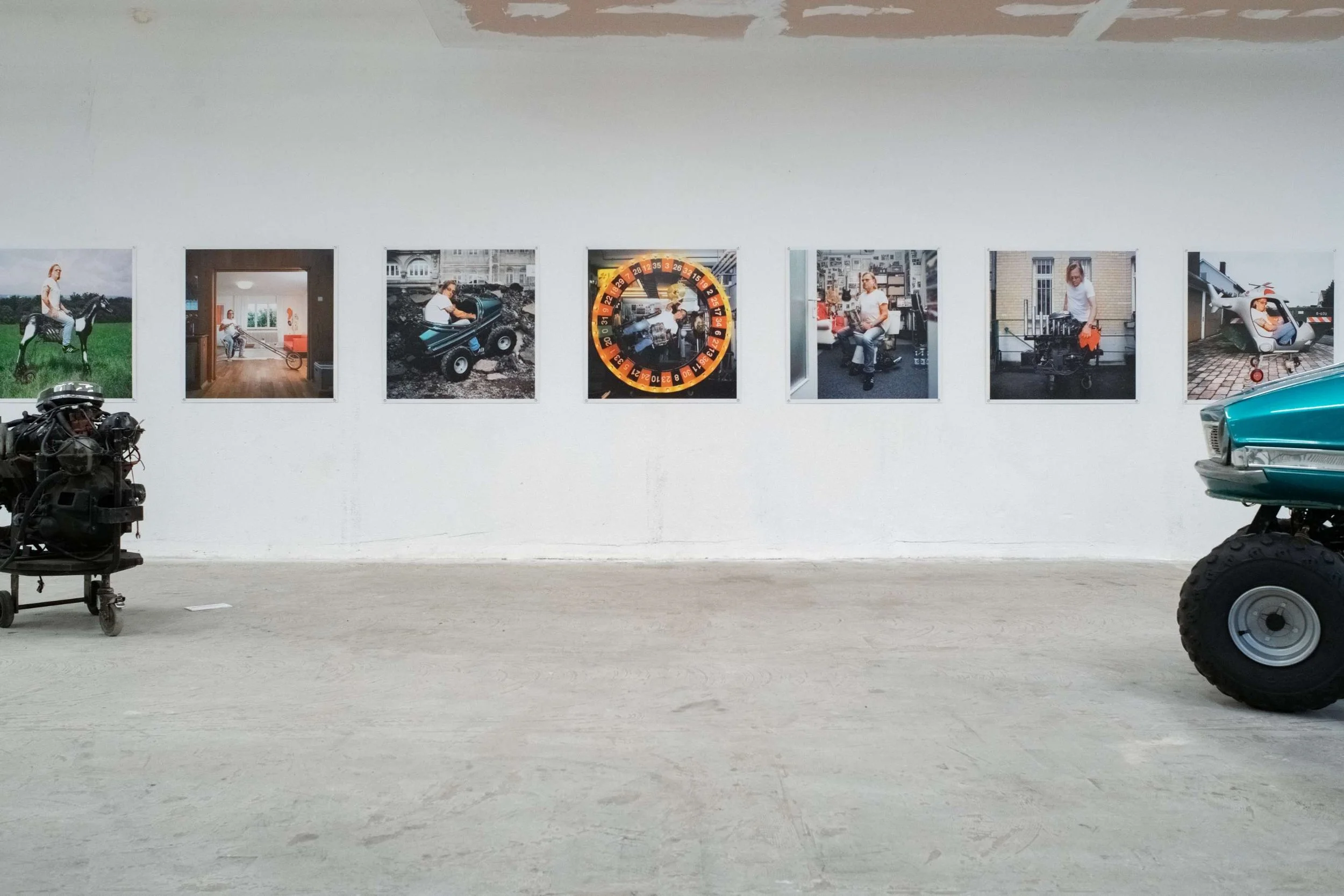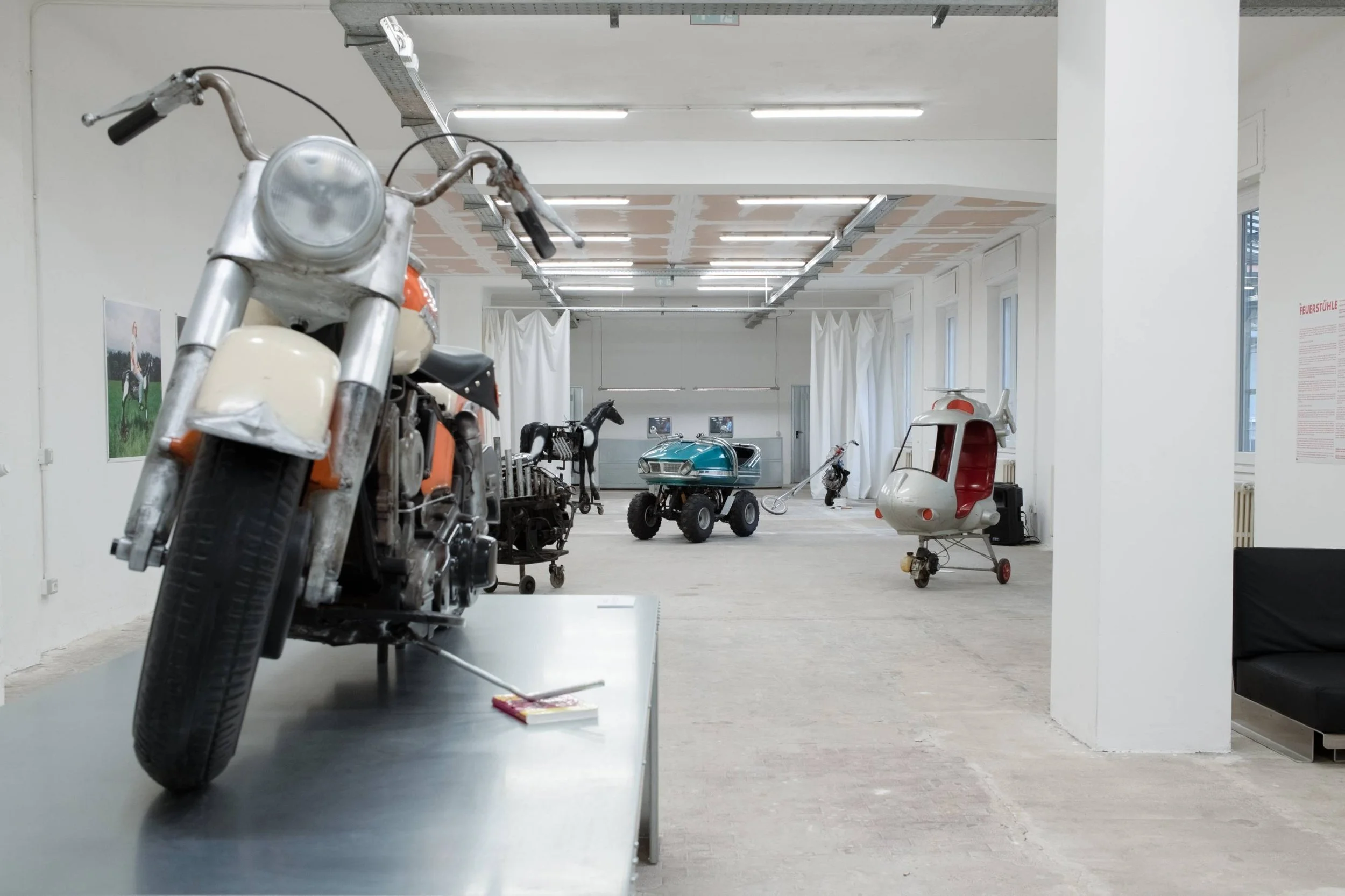 FEUERSTÜHLE gathers a collection of his motorized objects, bumper cars, wheelbarrows, mechanical horses, alongside photographic work by Italian photographer Eric Scaggiante, whose images document these creations in and around Gaedt's Stuttgart studio with the kind of attention usually reserved for portraiture. Which, in a way, is exactly what they are.
