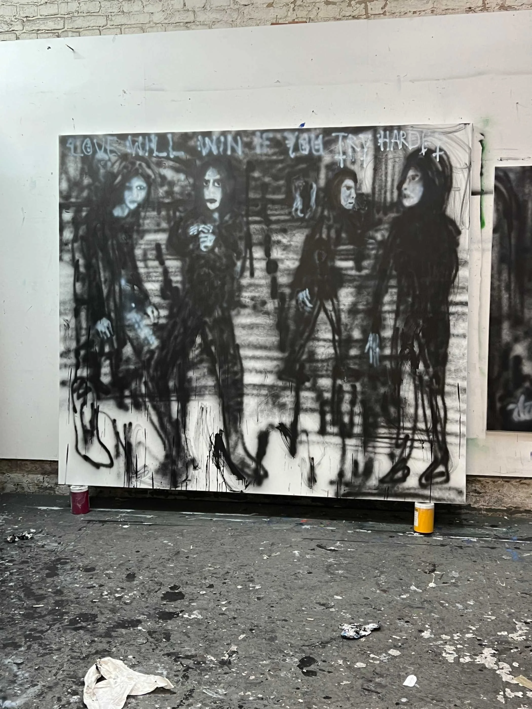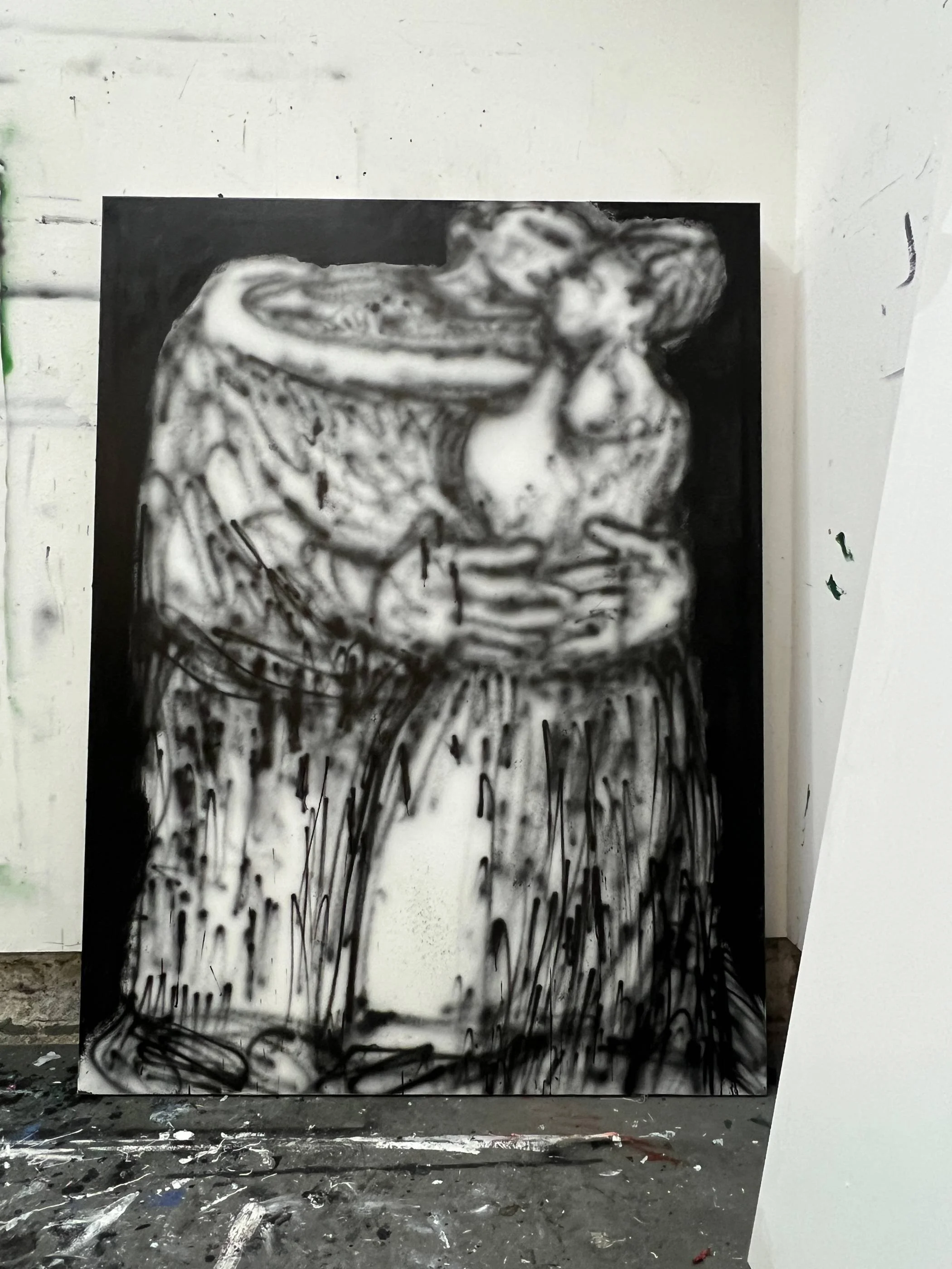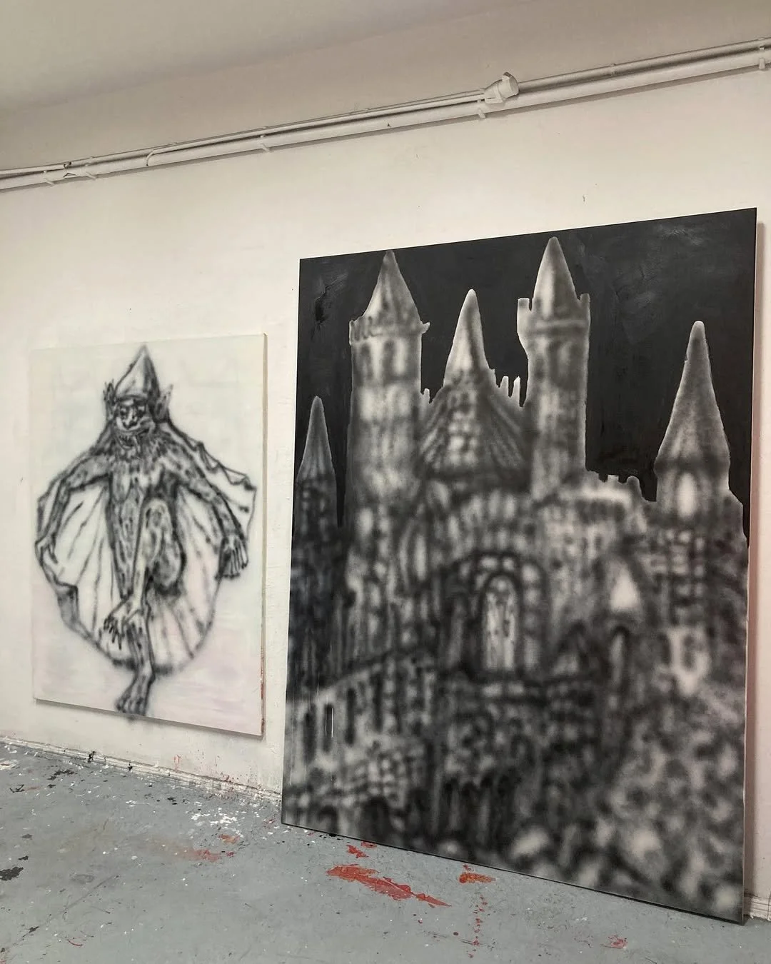 In his Berlin studio, Fjorsk paints with an urgency that feels almost confessional. His canvases, often in stark black and white, reveal an ongoing dialogue with memory, fantasy, and loss. From airbrushed medieval castles to distorted human figures, his work captures the unease of modern existence without trying to resolve it.