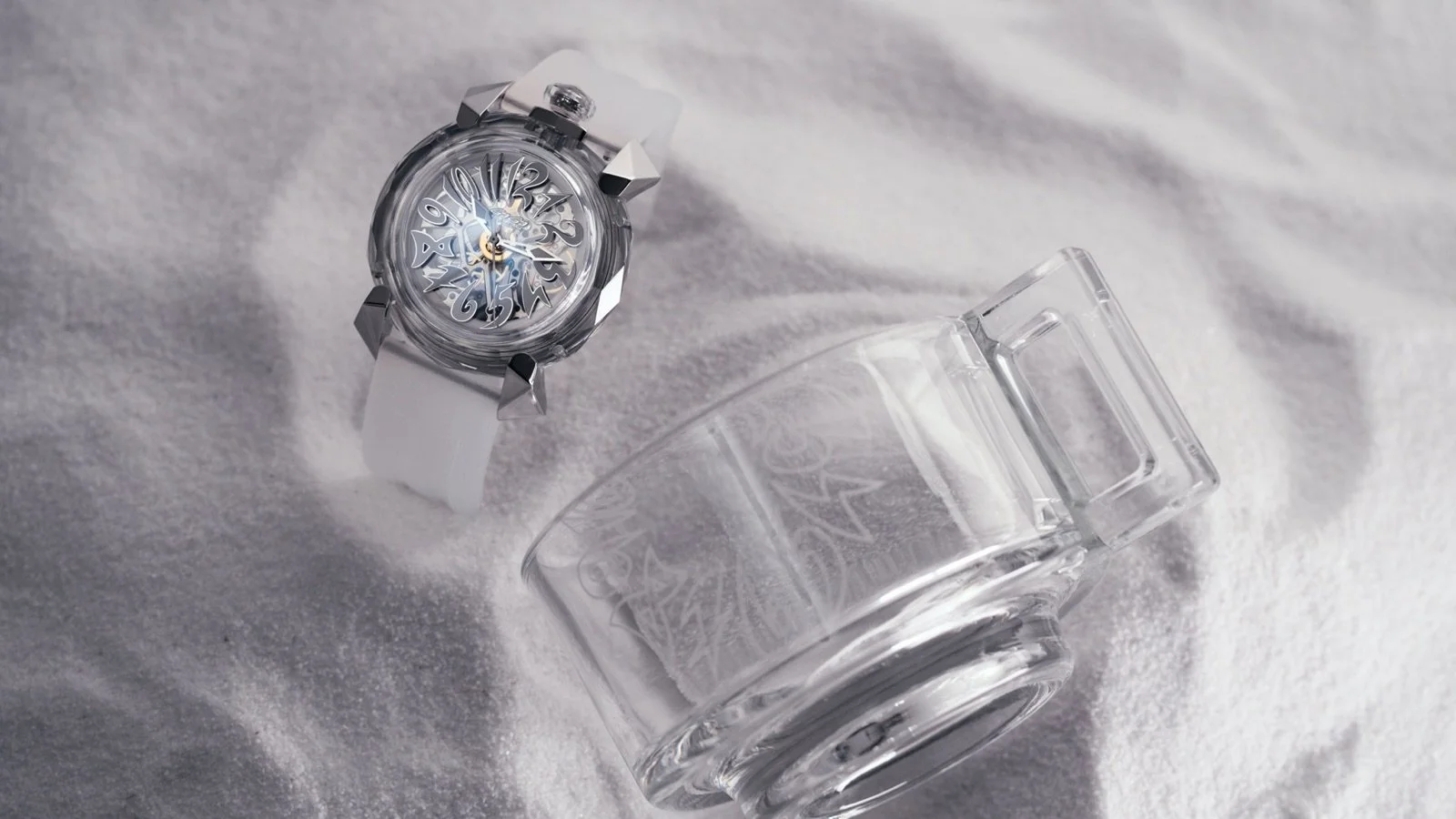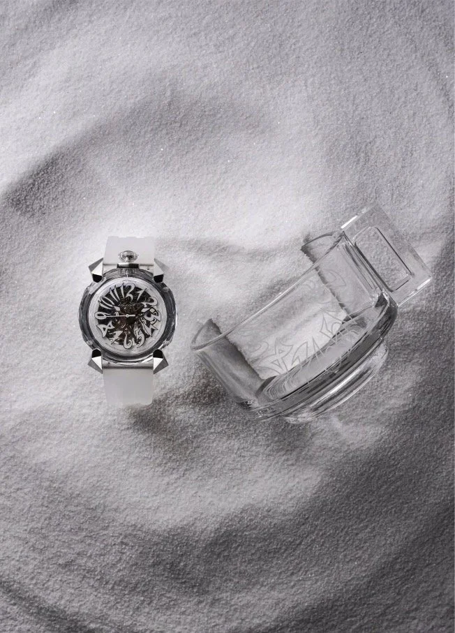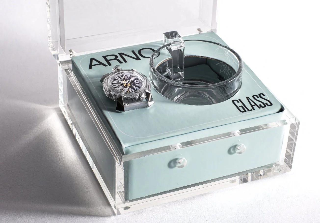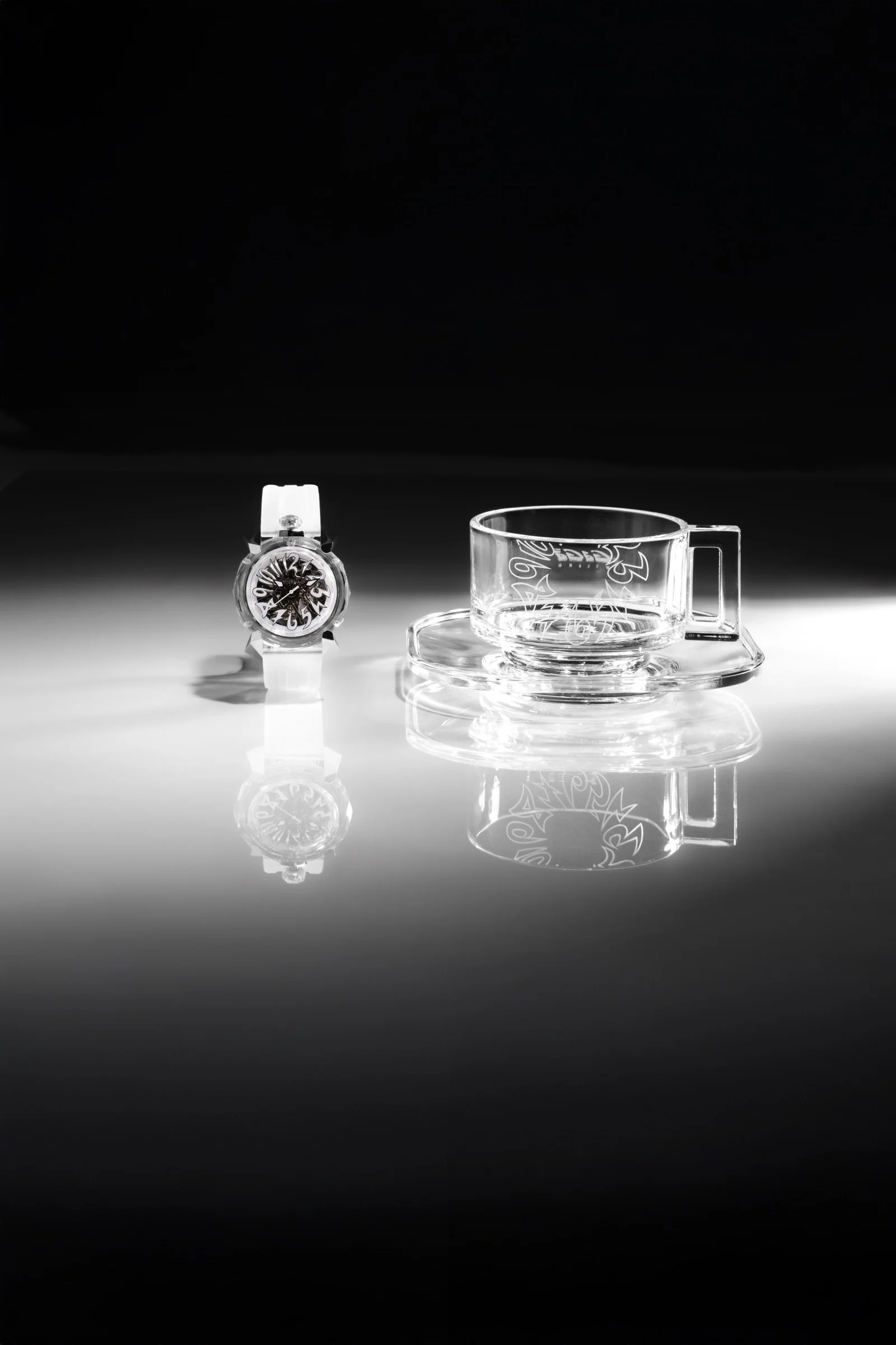 Speaking about the Arno Glass collaboration, the hourglass serves as a potent symbol of the ancient relationship between sand, glass, and time. How does this collaboration between Gagà Milano and Arno Glass reimagine this relationship through the creation of a crystal timepiece and a hand-blown cup?