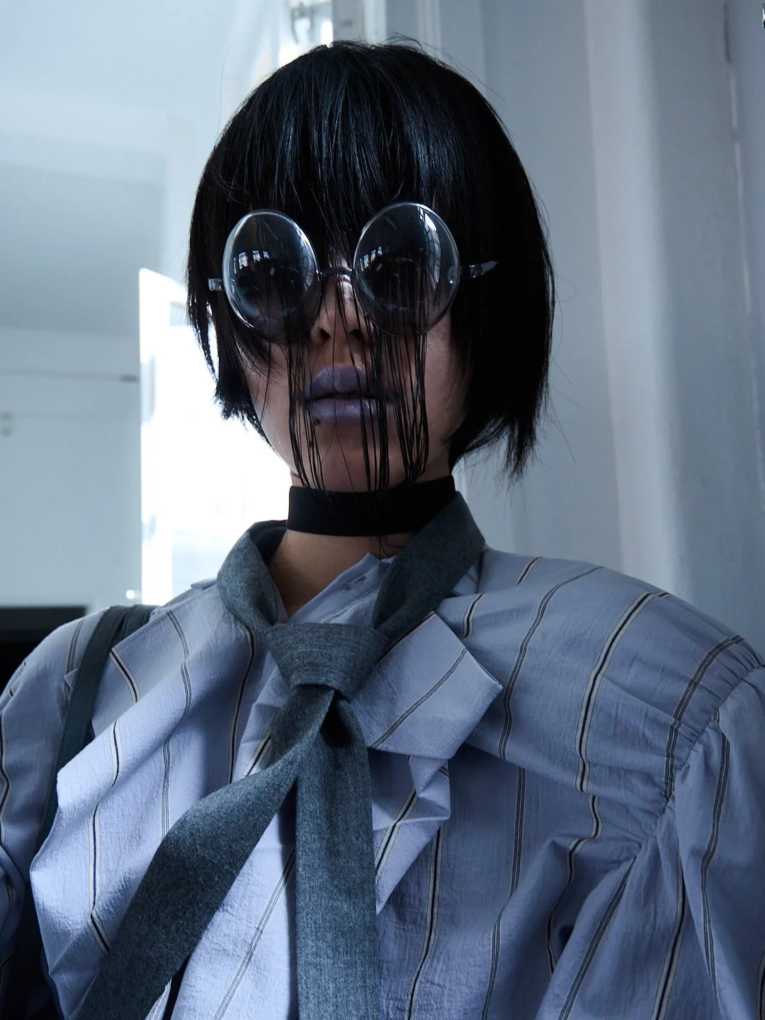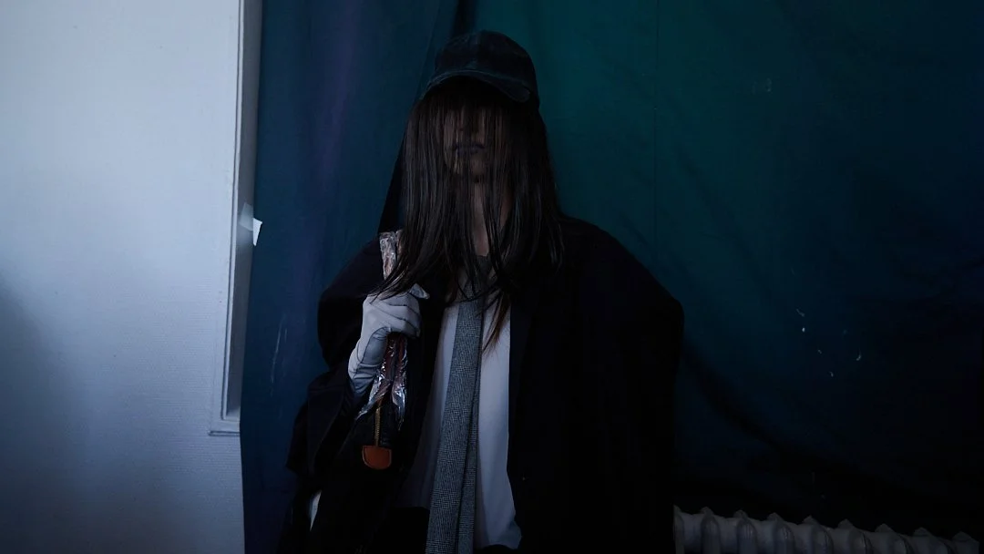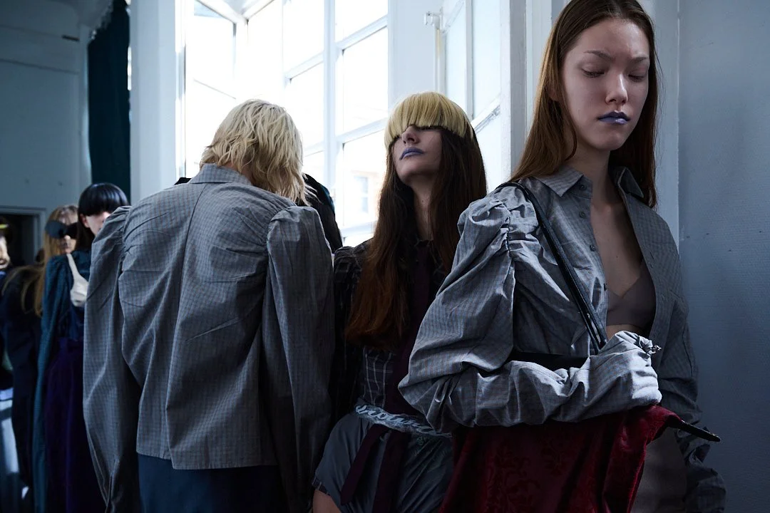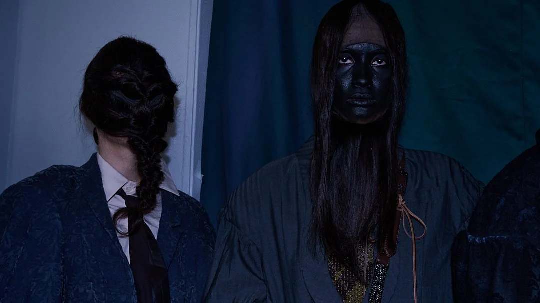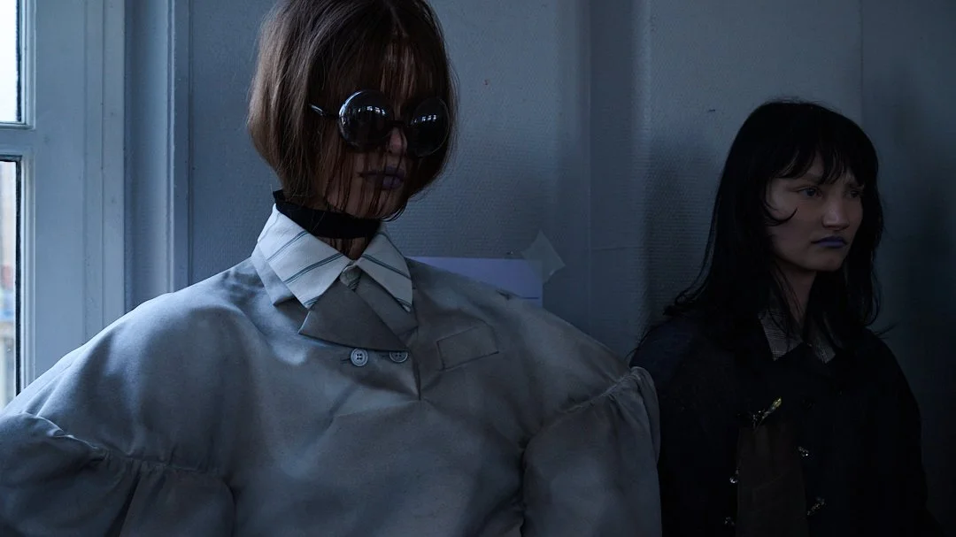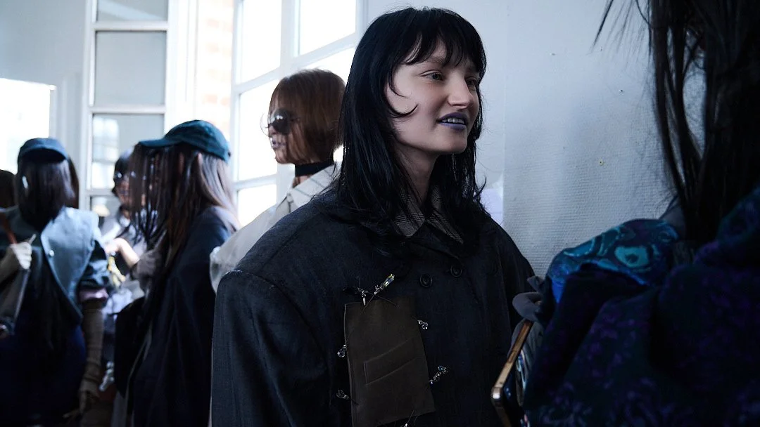 For Autumn/Winter 2026, grounds continues its journey into what Sakabe calls “ergonomic surrealism.” The collection takes a wild ride through uncanny valley, drawing on Japanese horror lore, silhouettes designed to unsettle, with classic tailoring and kimono shapes distorted to feel unfit for standard human proportions, stained materials, and accessories like giant insectoid eyewear.