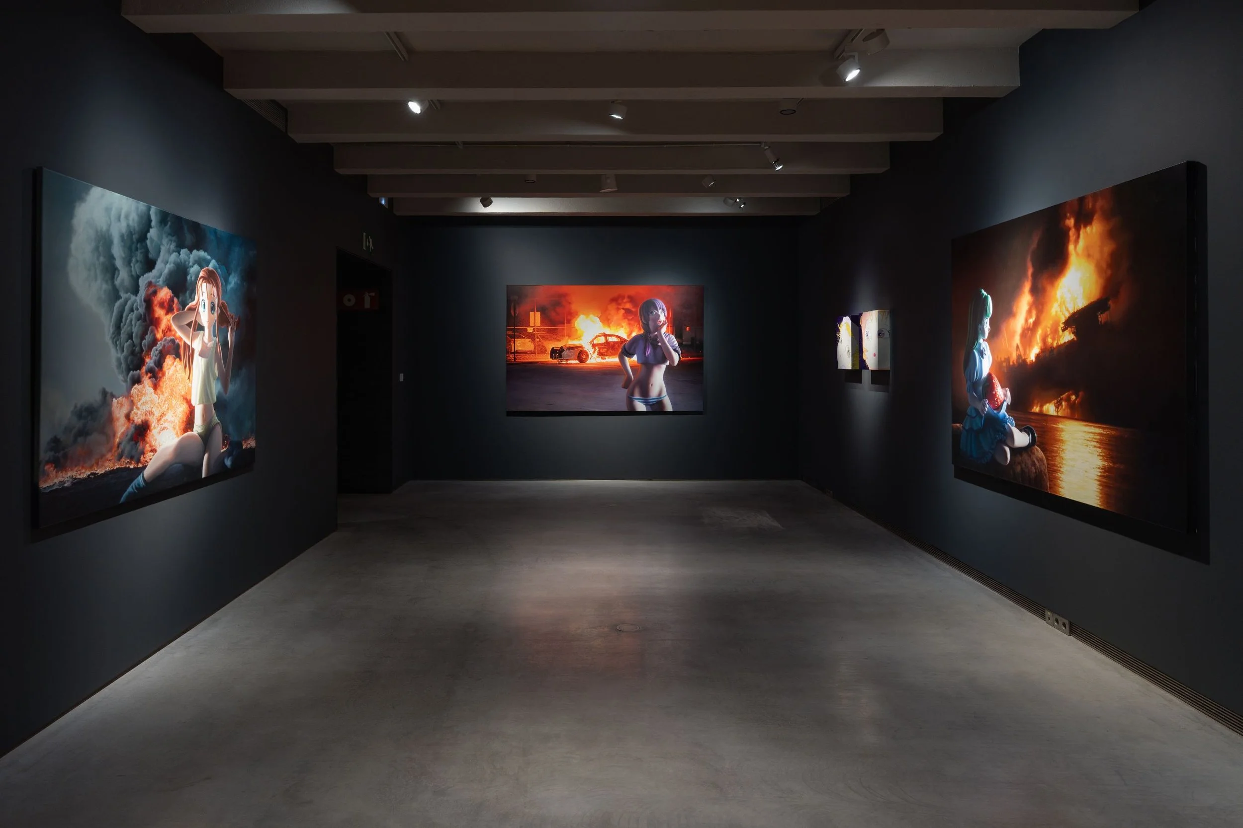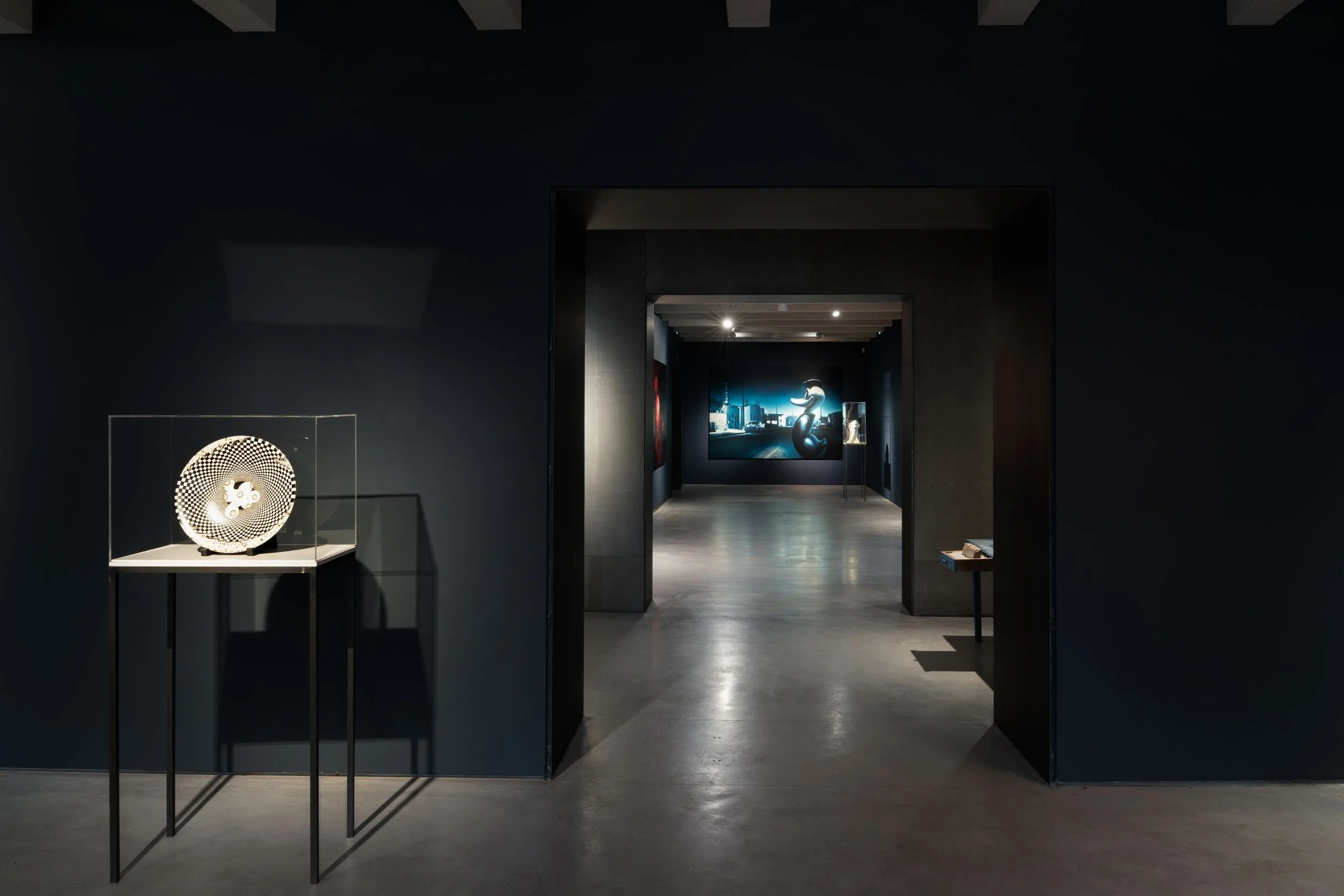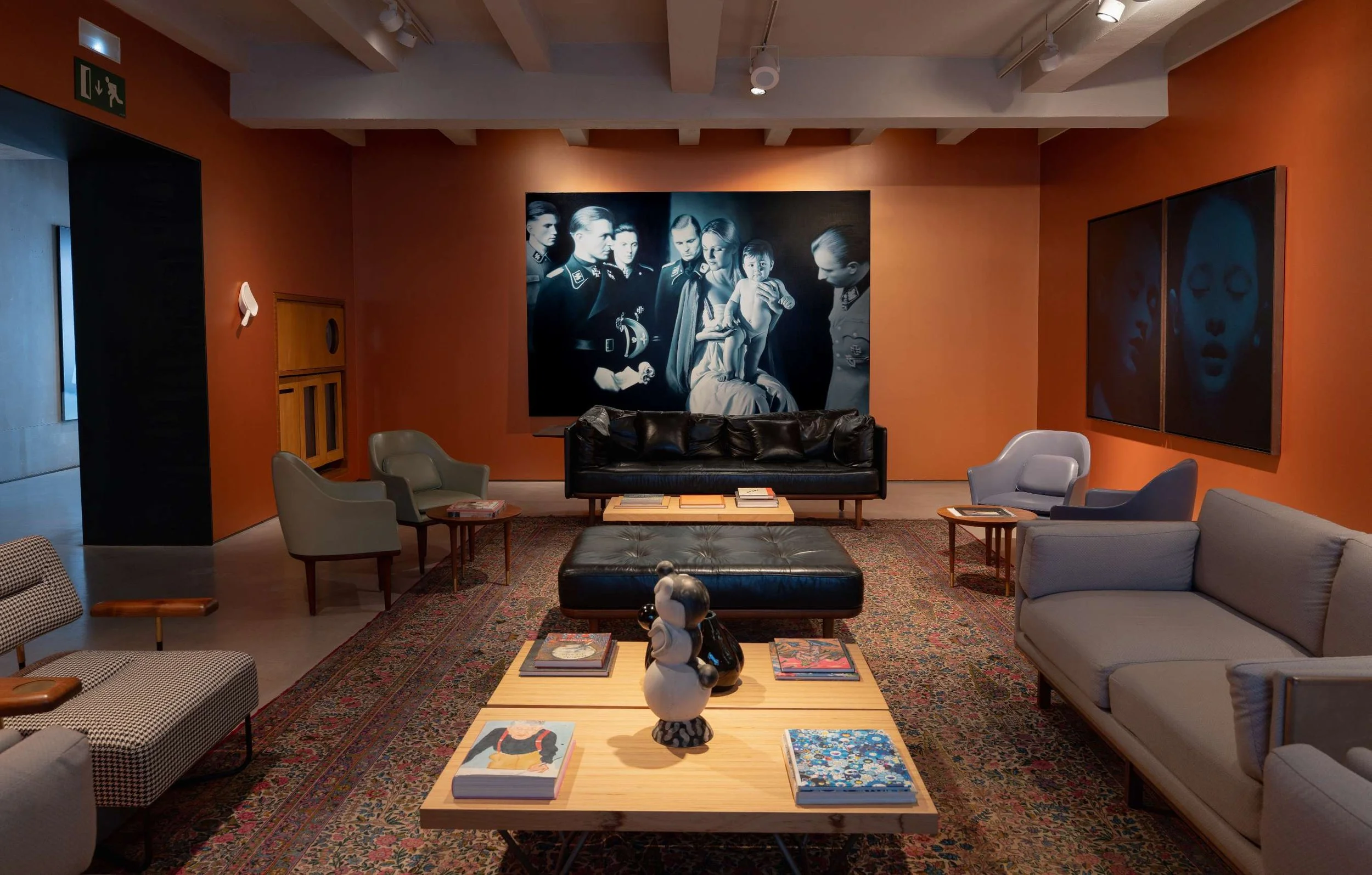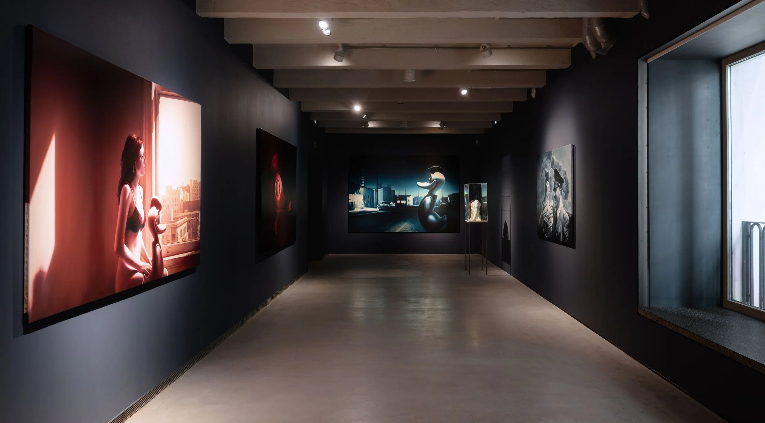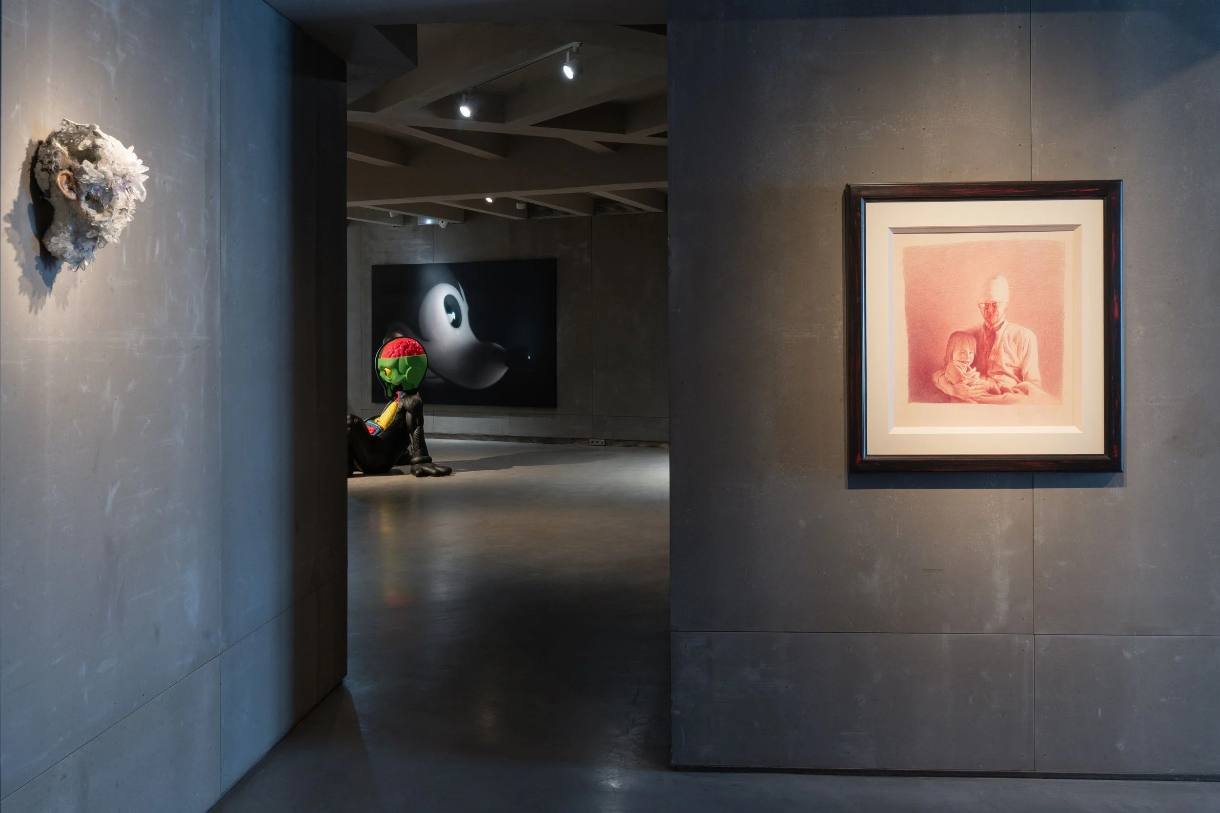 The sensation of moving through the rooms is cumulative. Helnwein's large-format paintings, lit in near-darkness, appear to generate their own light. Characters you recognise from a lifetime of cultural consumption return to you wrong, and the wrongness is the point. Red Duck watches from the corner. A figure from a Los Angeles opera production, now in its first appearance as sculpture, stands in a stairwell. The mural behind it was already there. Nothing in the space is incidental.