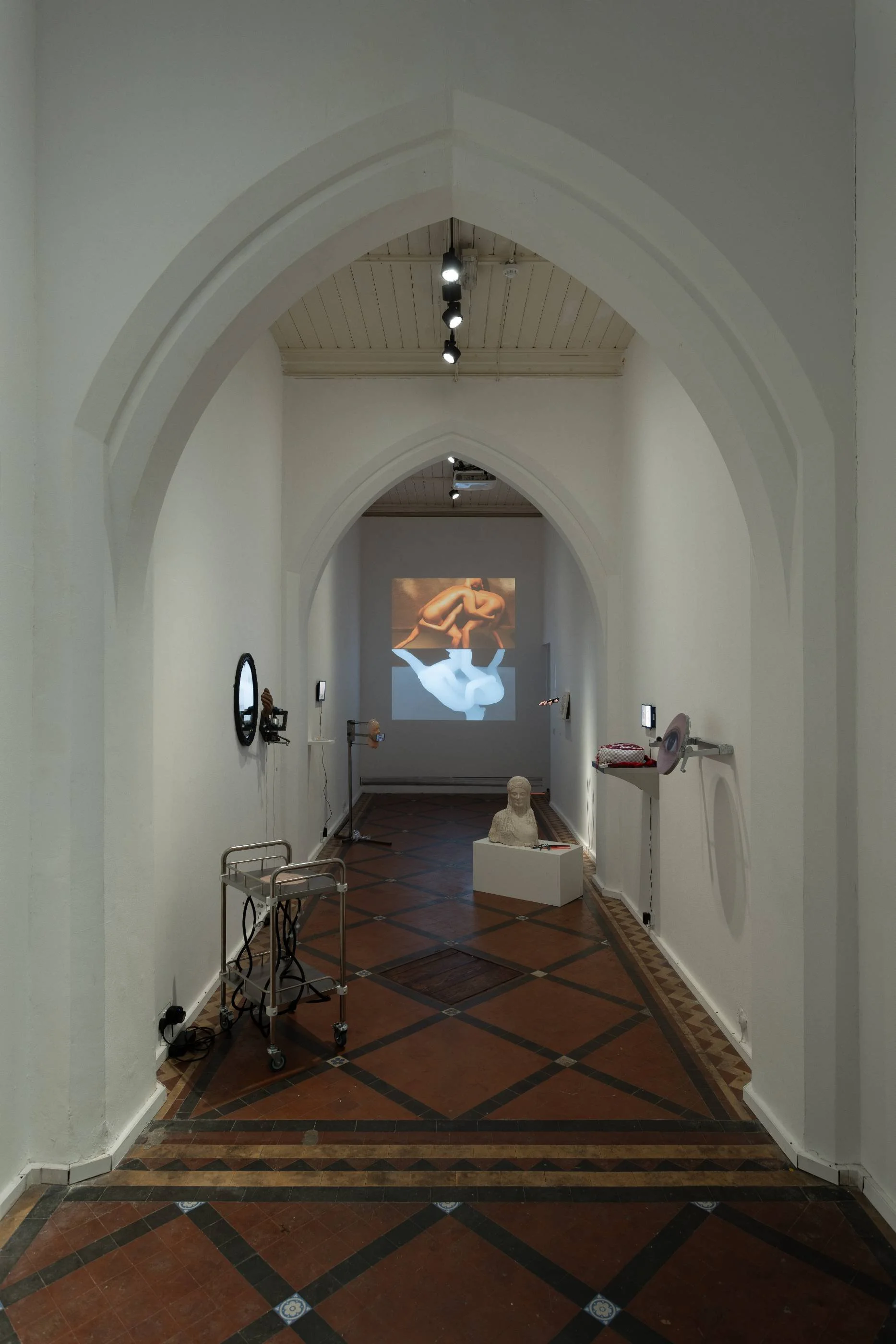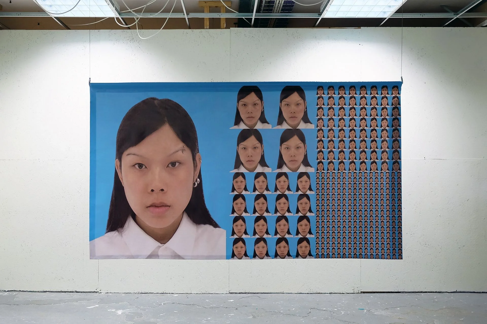 The uncanny has often been associated with digital tools and their failure to render the “real,” from Ed Atkins to Lawrence Lek. For Vo, however, the digital becomes a way of exemplifying the sheer weight of our nerve-wracking physicality. Facelift playfully gestures towards the violent demands of feminine beauty, and the simultaneous desire to be perceived and hidden behind a perfected image. Scanning, then printing her own face onto stretched jersey, Vo produces a ghastly, flattened self-portrait, a Frankensteinian creature cut to the cloth of her maker’s desire. Delicate, yet violent, Vo then offsets the replica’s clinical stillness with servo sensors attached to the installation, which are sensitive to human motion. Beads jingle and screech, while the face itself mimics breathing – waking only to perform in the presence of others. Many of Vo’s works pierce through the tension of a still image, a smooth surface to generate a darker reality.