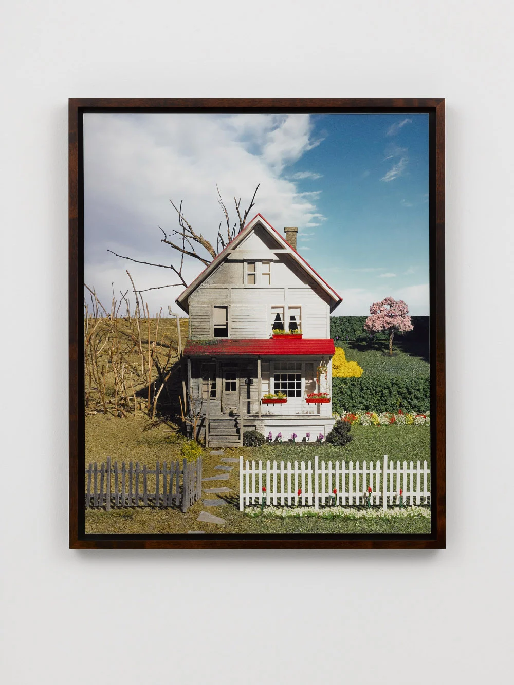Juxtaposed alongside these images are a series of cookie-cutter perfect houses and landscapes. Casebere has constructed and photographed miniature models in his studio for many years; the scenes are largely built and lit to create the perfect landscape. The cinematic nature of the photographers work alludes to an almost unfinished narrative, as if an untold story is about to unfold from the miniature houses and the people within them.