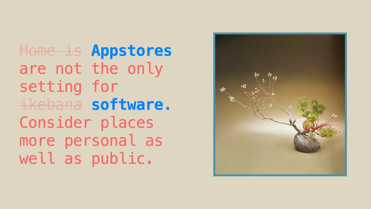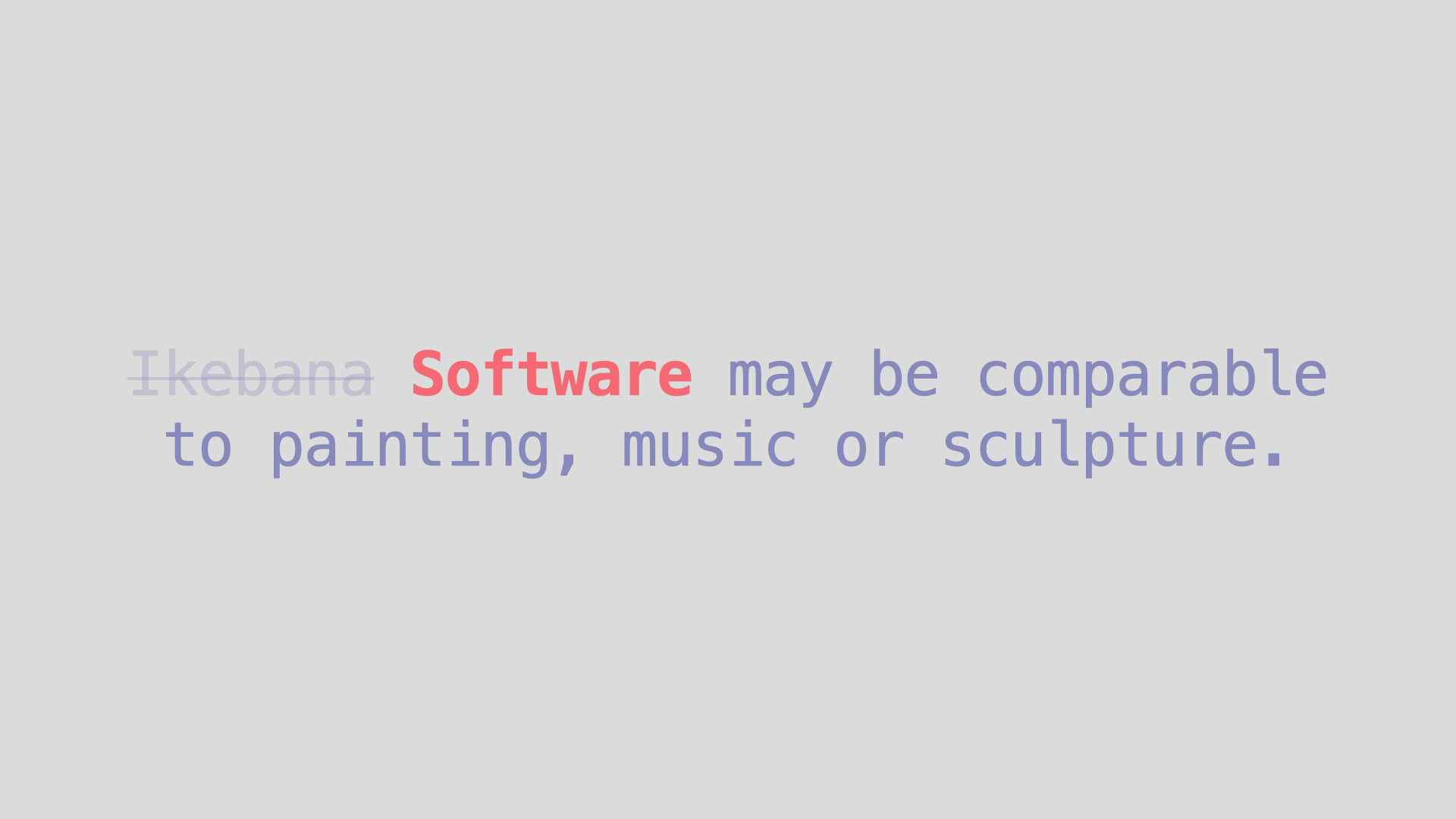 I started thinking more about the natural world and computers when I read Laurel Schwulst’s My website is a shifting house next to a river of knowledge. What could yours be?. It remained in the back of my mind, but those thoughts didn’t really emerge into any artifact until 2019, when I was asked to give a short talk on something I was knowledgeable about. Everyone suggested I talk about ikebana, since I had been studying it for a couple of years at that point, but I felt like an imposter. I was, and still am, a beginner. I wanted to combine that unique interest with something that I actually was knowledgeable about, which was software. I found The 50 Principles of Sogetsu, written by Sofu Teshigahara, and realized that those principles were applicable to any creative practice, so I adapted them to be a talk titled Ikebana Tips for Software Design.
