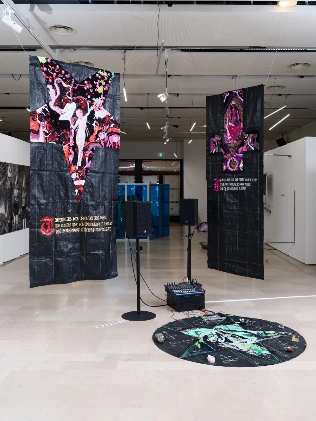 Yes, I think sound has a particular power in desacralizing, because it acts directly on the body, it bypasses language and interpretation, before you can rationalize it. You can disturb the authority while keeping their affective charge alive. The sound is an intuitive medium for me. While composing or performing, I rely heavily on improvisation, which helps make the reinterpretations personal and subjective. In my visual practice, the preparatory work takes much more time and energy. I often start by reading and researching to find a narrative or concept that I want to reinvest in. Then I work on sketches, compositions, and colors, often creating a full-scale paper model of the image, which I later translate into textiles and other recovered materials. The many steps involved make the visual practice less intuitive than sound, but both are ways for me to explore the same concepts.