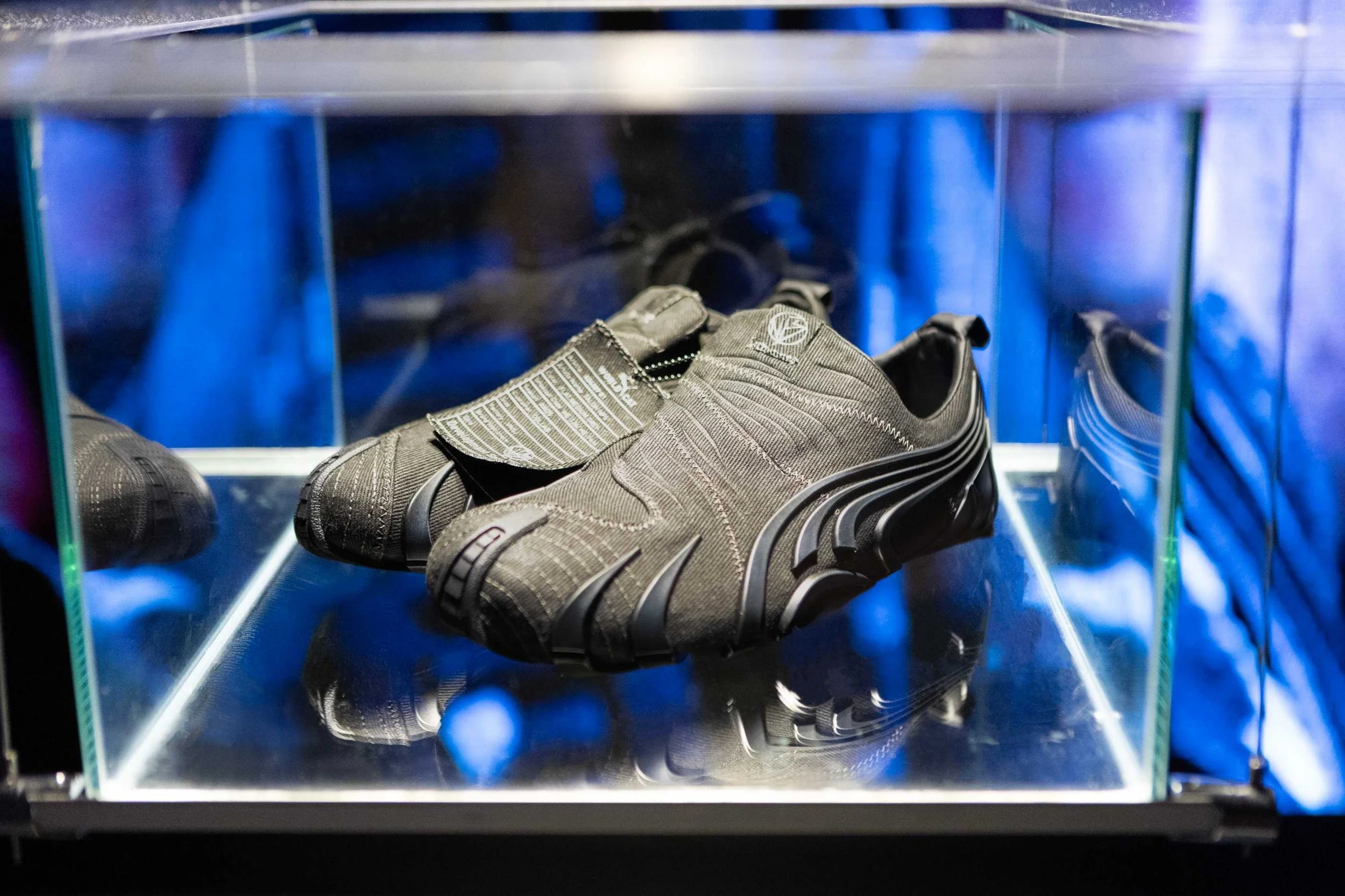 The upper is treated with distressed denim surfaces that recall the patina of vintage garments, balanced with paneling inspired by racing uniforms. A cage structure adds a sense of protection and weight, turning the sneaker into something more sculptural than athletic. The look is neither nostalgic reproduction nor straightforward redesign; it instead communicates the tension between memory and reinterpretation.