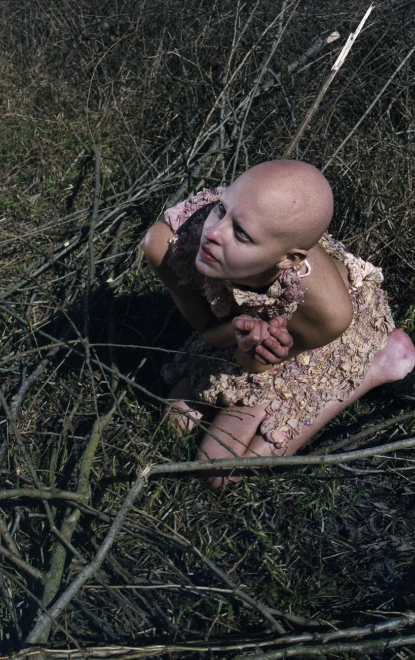 The choice of garments contributes to create ad represent the different characters in the different phases of the ritual: the protagonist initially wears a white pleated dress by Emilia Genova and her face is covered by a mask made by Dara Silva to conceal her identity in transition. At the completion of the ritual the protagonist undresses and reappears in the form of a “rebirth”: Devocka's dress is presented as an evolution of the body, a second skin symbolic of the achievement of a new balance.
