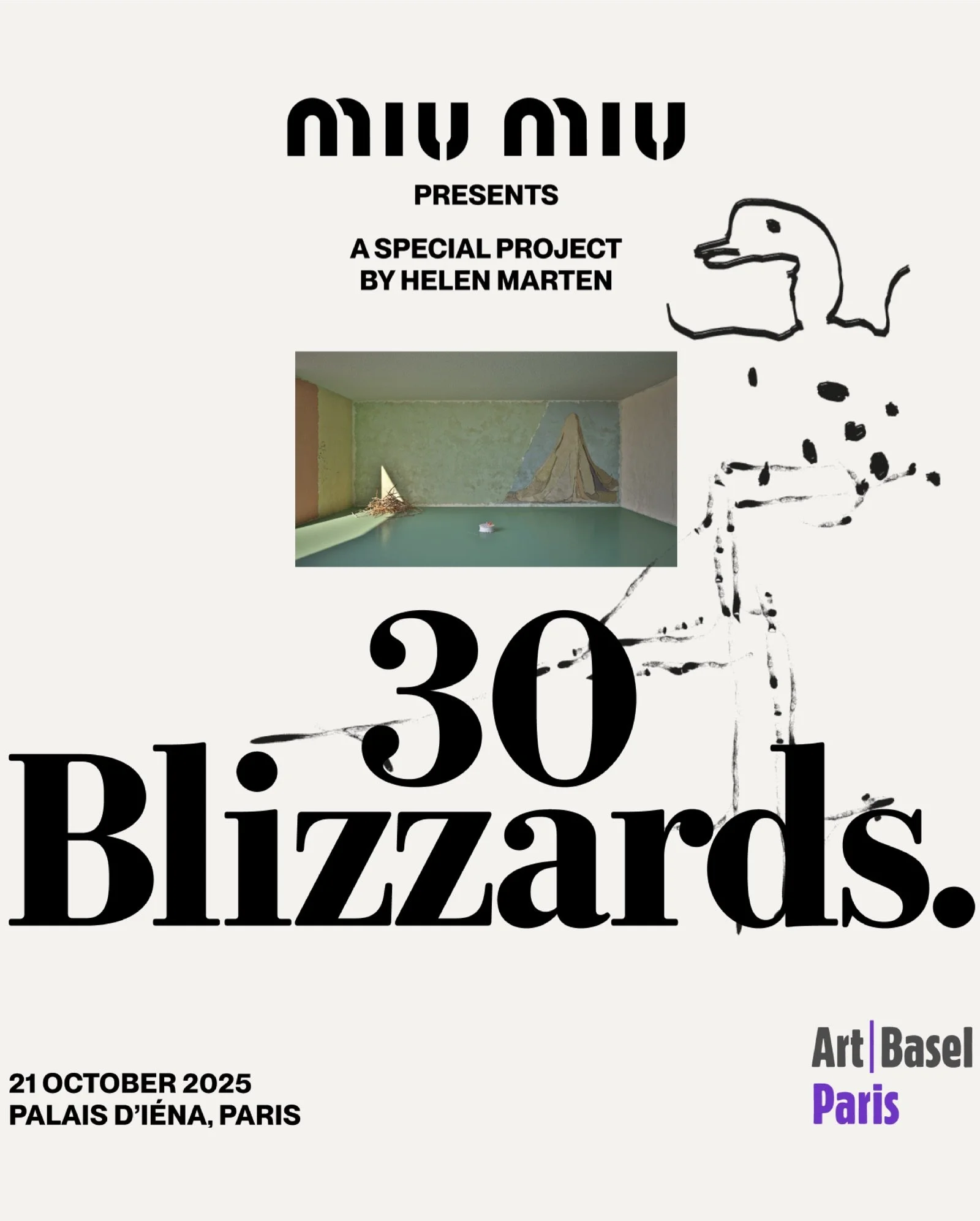 30 Blizzards presents Helen Marten’s mature vision of what installation can be when theatre, sculpture, sound and writing convene in one space. The project, commissioned by Miu Miu for the public programme of Art Basel Paris and located in the grand Palais d’Iéna, arranges five sculptural platforms and five video works as structural markers in a room inhabited by thirty performers.