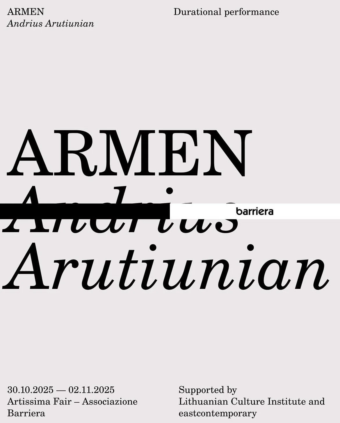 The performance is presented as a collateral event to the group exhibition Stories we carry — curated by Sergey Kantsedal and Agnieszka Faferek and featuring Andrius Arutiunian, Nikita Kadan (@nikita.kadan), Aziza Kadyri (@aziza.kadyri), Mila Panić (@panic_mila), Ala Savashevich ( @ala_savashevich), Slavs and Tatars (@slavsandtatars), and Anastasia Sosunova (@anastasia.sosunova) — at Associazione Barriera (02/11–02/12/2025). It also complements Arutiunian’s solo presentation with eastcontemporary at Artissima.
