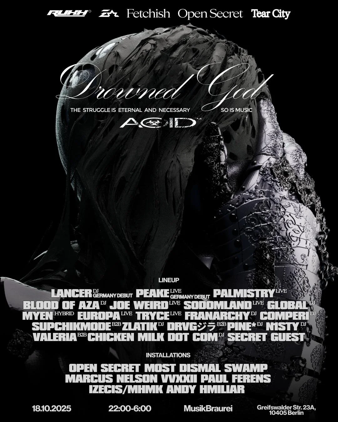 ASID, Fetchish, Ewaaste, Tear City and Open Secret have signed a subconscious contract and are welcoming you at the industrial complex of sound and thought.