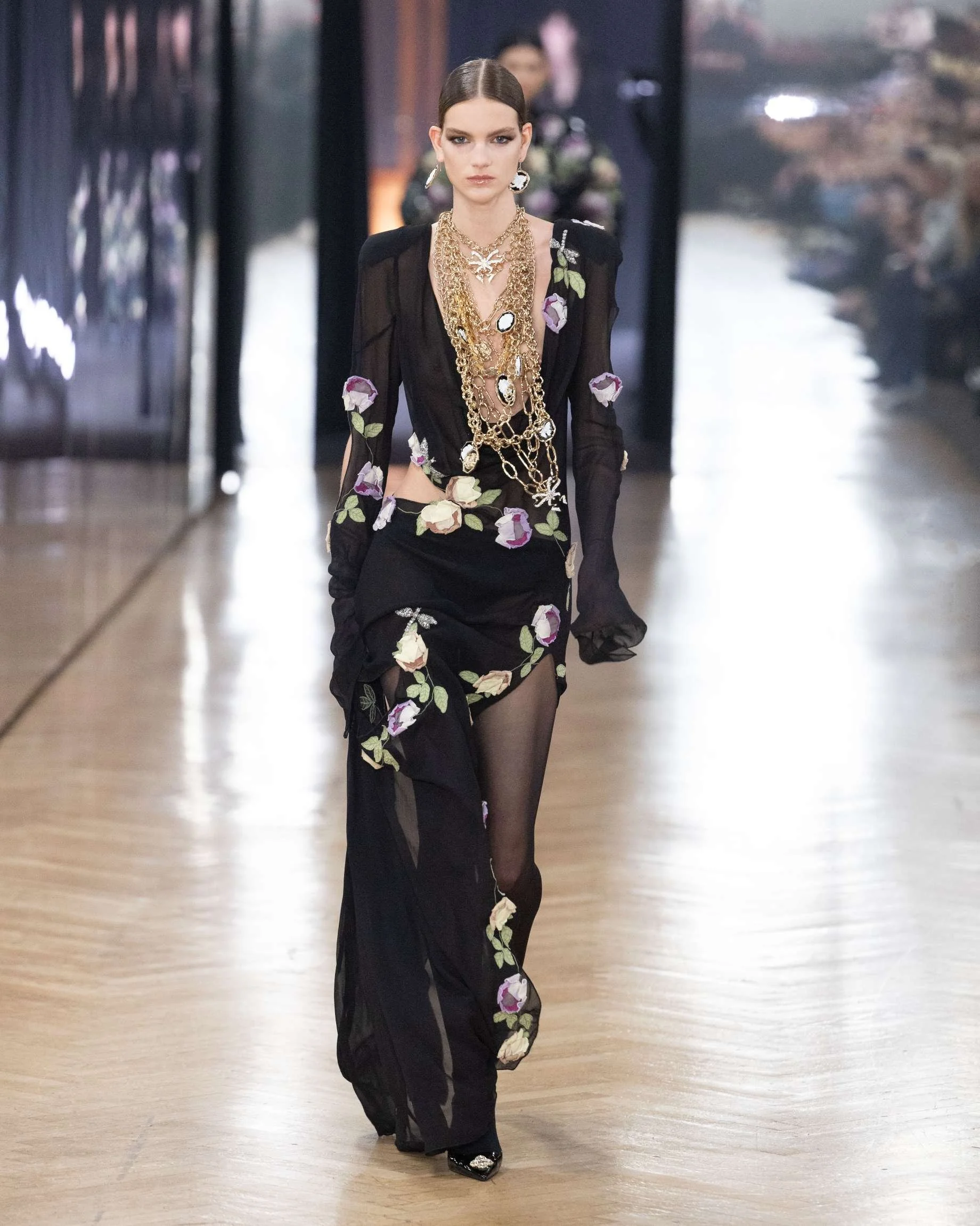 The rose, Blumarine's most enduring symbol, commands the collection. Printed in red and black on taffeta, embroidered in silver across Chantilly lace, wreathed in plissé soleil rosettes on gold lamé, pressed into chainmail. Petal ruffles fray at hemlines and collar edges. The rose is romantic, certainly, but here it also reads as a warning.