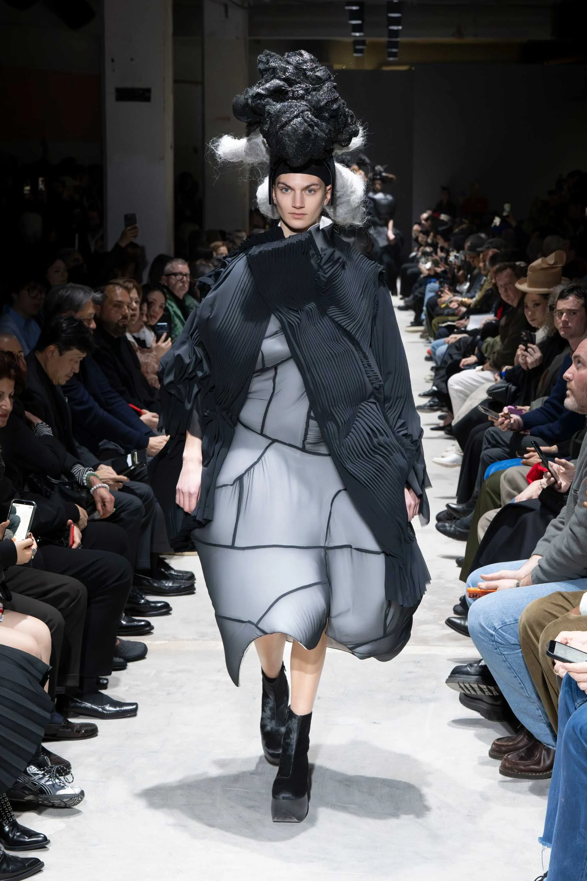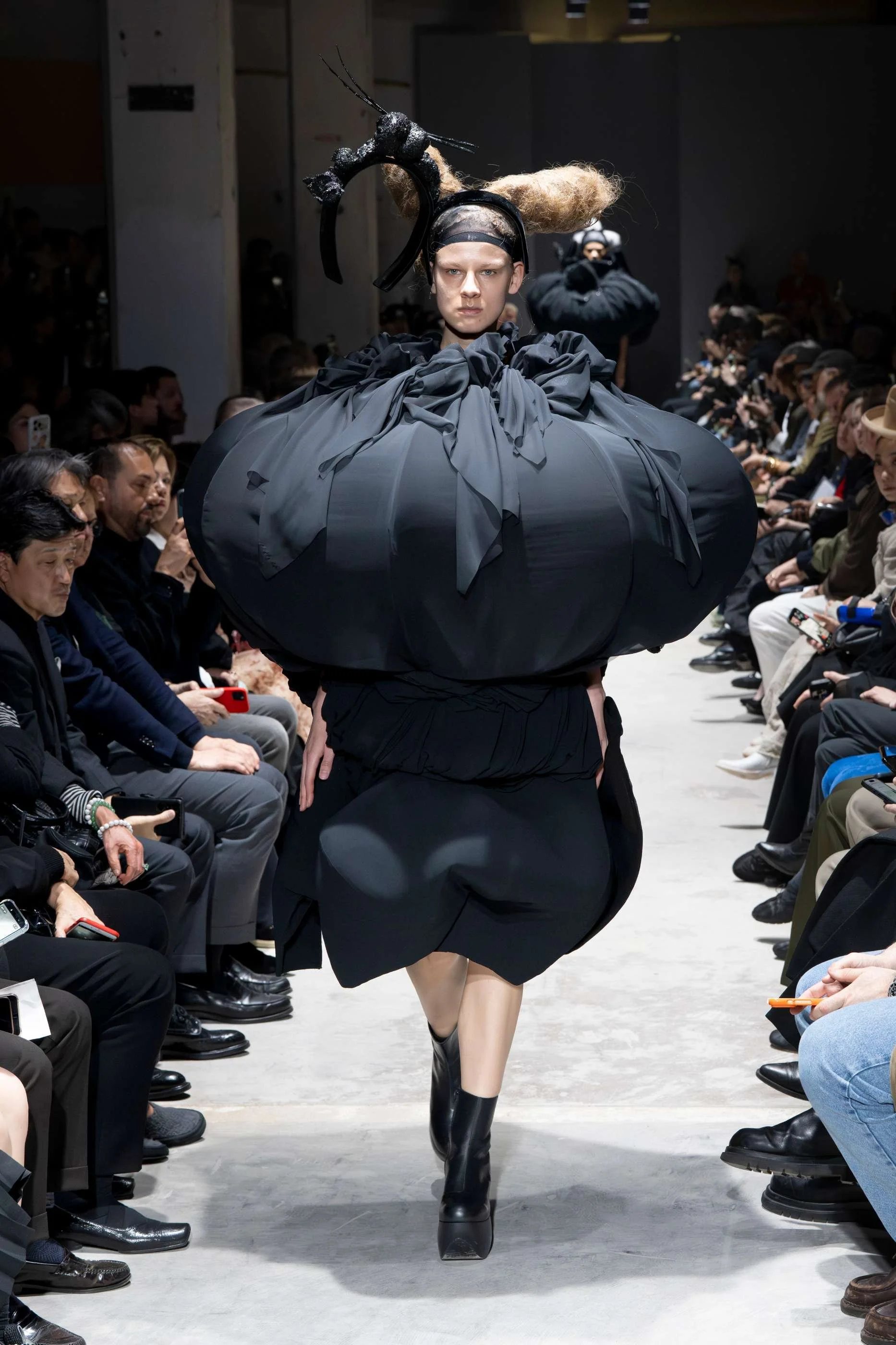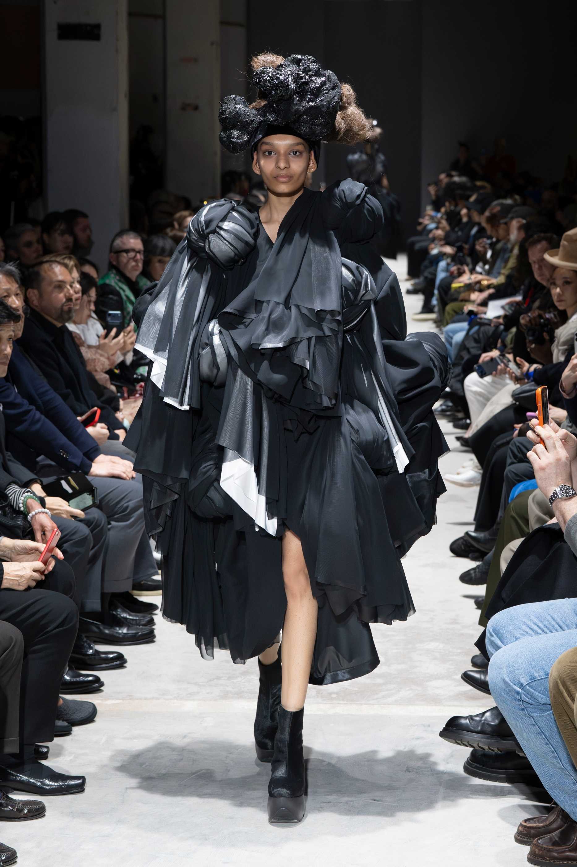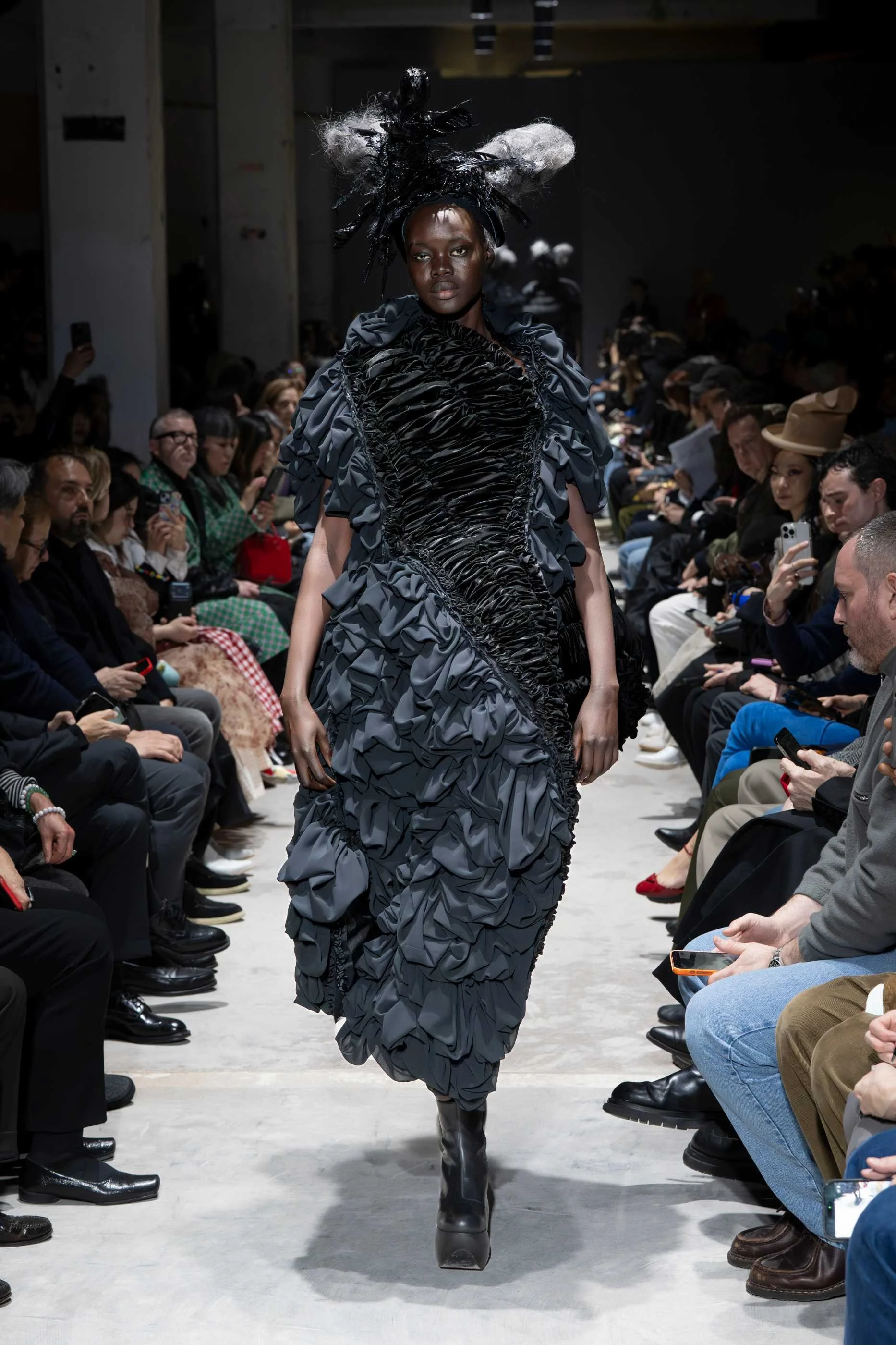 There is a particular kind of authority that comes from a designer who stopped seeking approval decades ago. Rei Kawakubo arrived at FW26 with a collection titled "Ultimately Black," and the title functioned less as an aesthetic statement than as a philosophical position. Black, in her words, is the strongest medium for creation, the colour that carries the universe and the black hole simultaneously within it. The runway took her at her word.