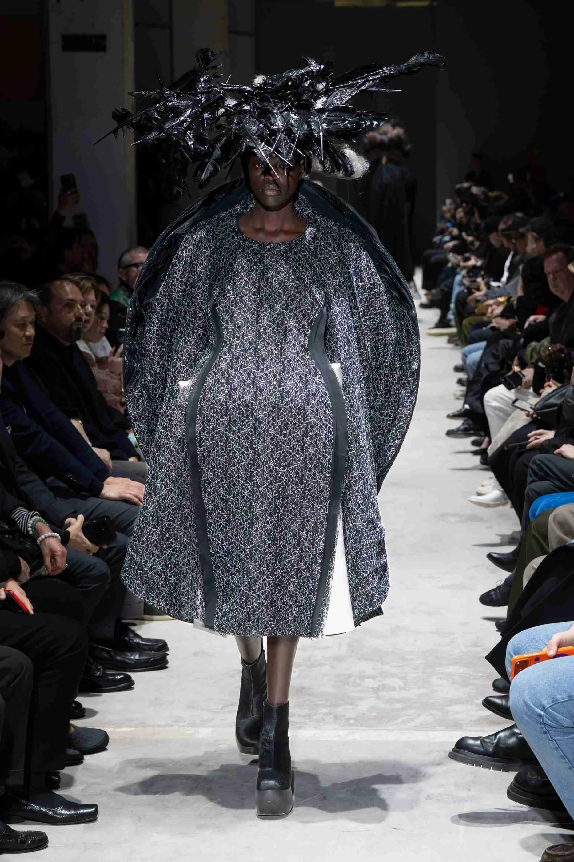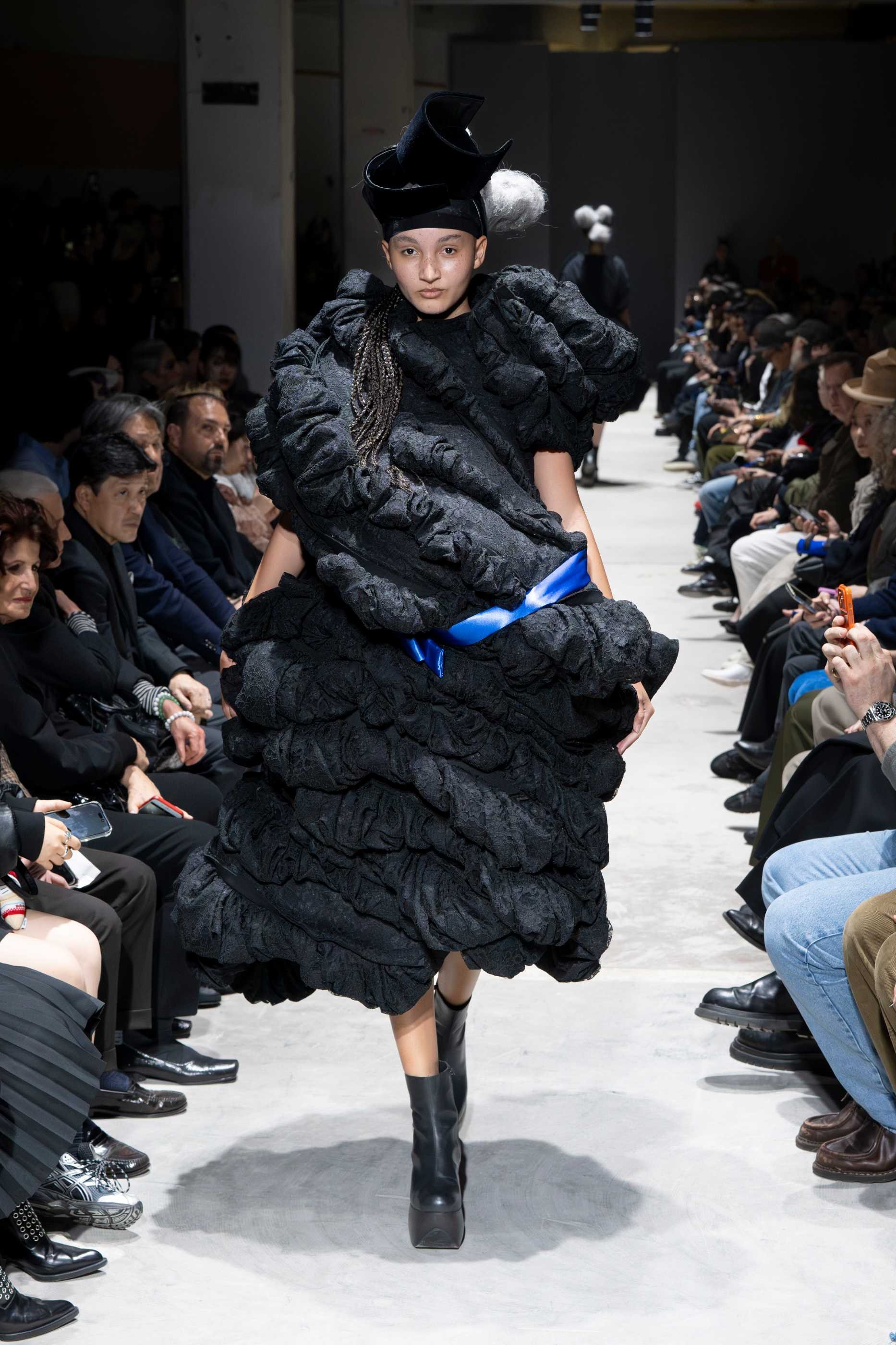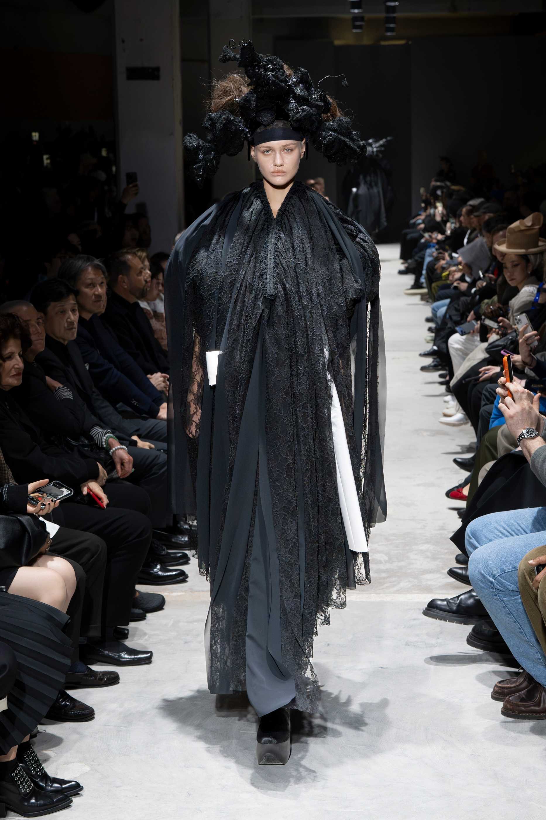 Sixteen all-black ensembles opened the show in near-silence. The silhouettes were massive, intricate, and governed by Kawakubo's long-established formal obsessions: side-mounted protrusions resembling rocket engines, stalactite volumes dripping from structured panels, orbs of fabric stacked in configurations that defy conventional proportion. These forms arrived not as novelties but as refinements of a visual language she has been developing for decades, each one more internally coherent than the last. The fabrication was rich without being indulgent. Lace, brocades, chiffon, sequins, and fringe appeared throughout, shirred, knotted, and draped into forms that evoked jellyfish tentacles, architectural ruins, and meteor trails in equal measure. Spidery embroidery traced its way across padded panels, adding a sense of minute, almost scientific precision to garments of otherwise monumental scale.