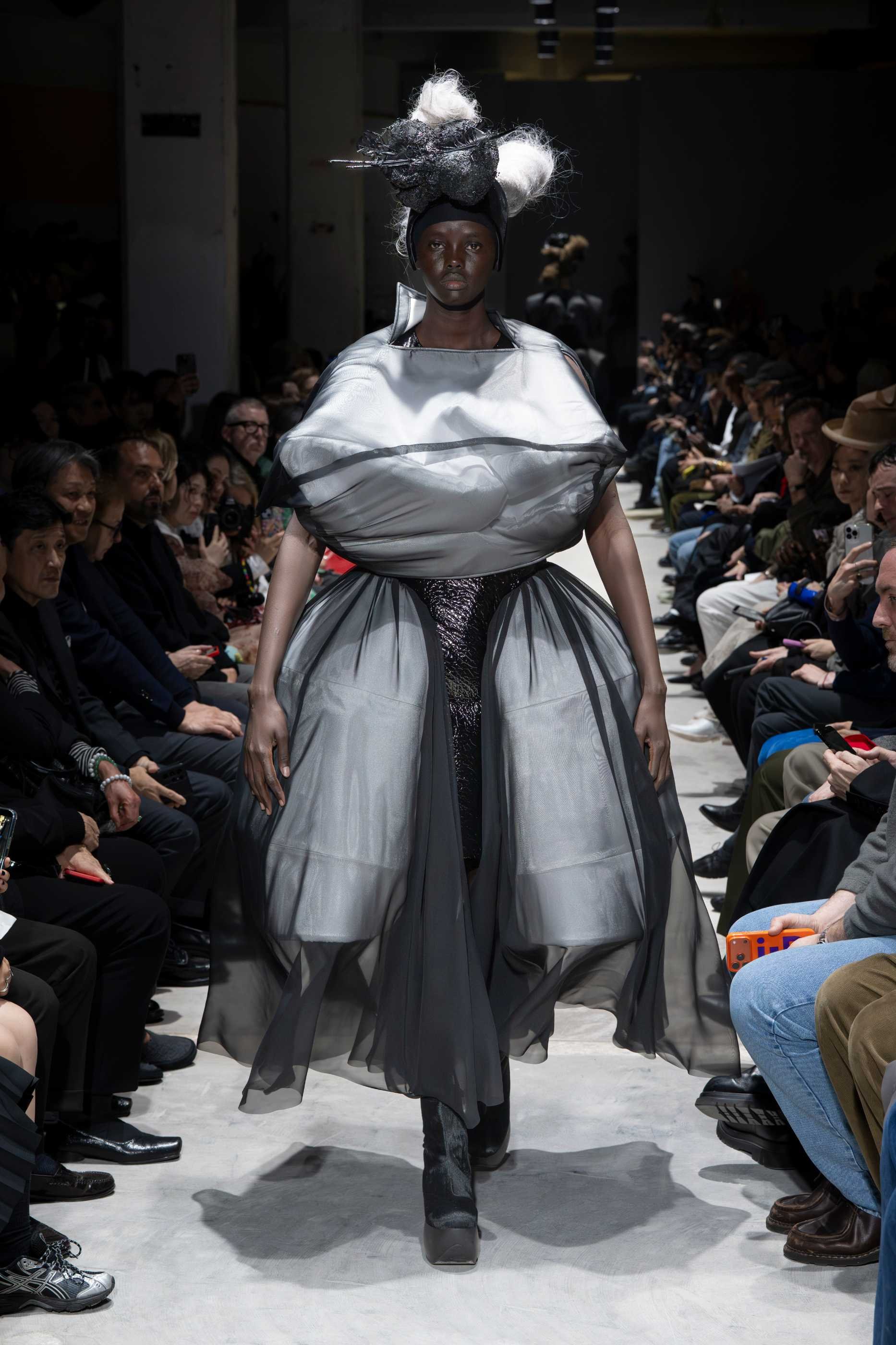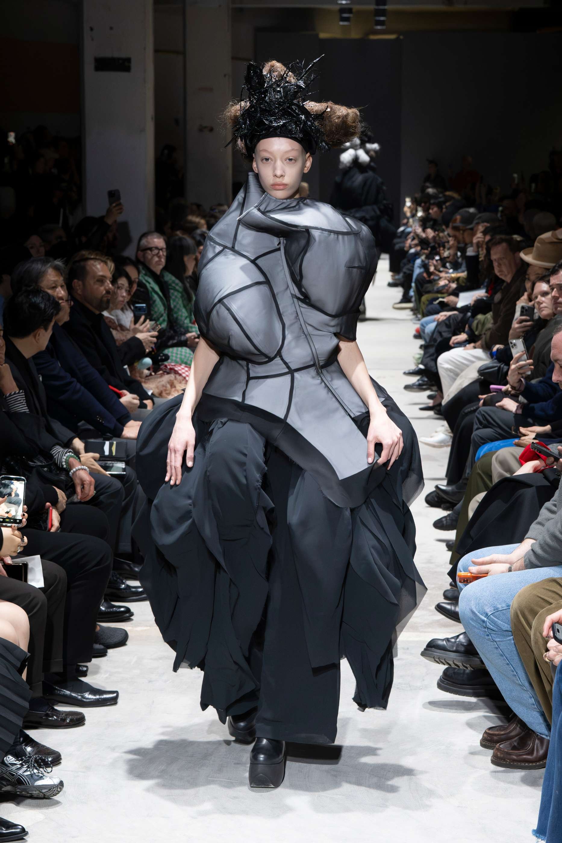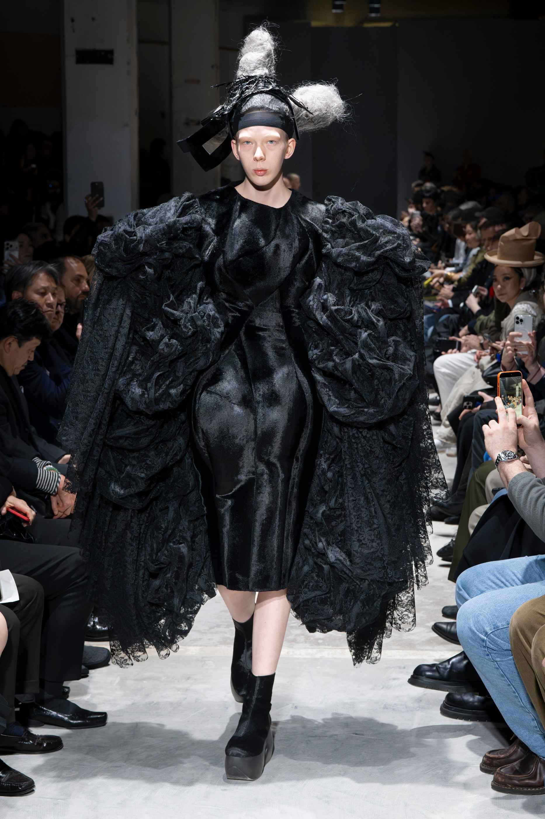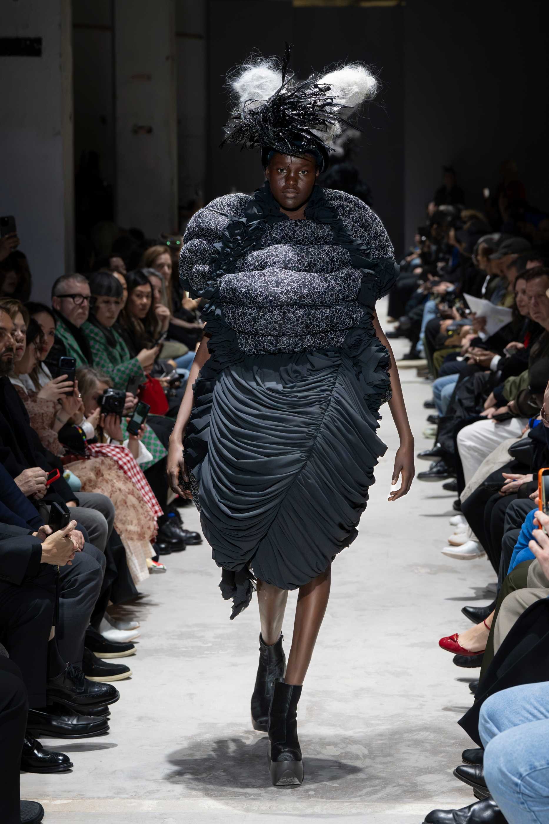 Sixteen all-black ensembles opened the show in near-silence. The silhouettes were massive, intricate, and governed by Kawakubo's long-established formal obsessions: side-mounted protrusions resembling rocket engines, stalactite volumes dripping from structured panels, orbs of fabric stacked in configurations that defy conventional proportion. These forms arrived not as novelties but as refinements of a visual language she has been developing for decades, each one more internally coherent than the last. The fabrication was rich without being indulgent. Lace, brocades, chiffon, sequins, and fringe appeared throughout, shirred, knotted, and draped into forms that evoked jellyfish tentacles, architectural ruins, and meteor trails in equal measure. Spidery embroidery traced its way across padded panels, adding a sense of minute, almost scientific precision to garments of otherwise monumental scale.