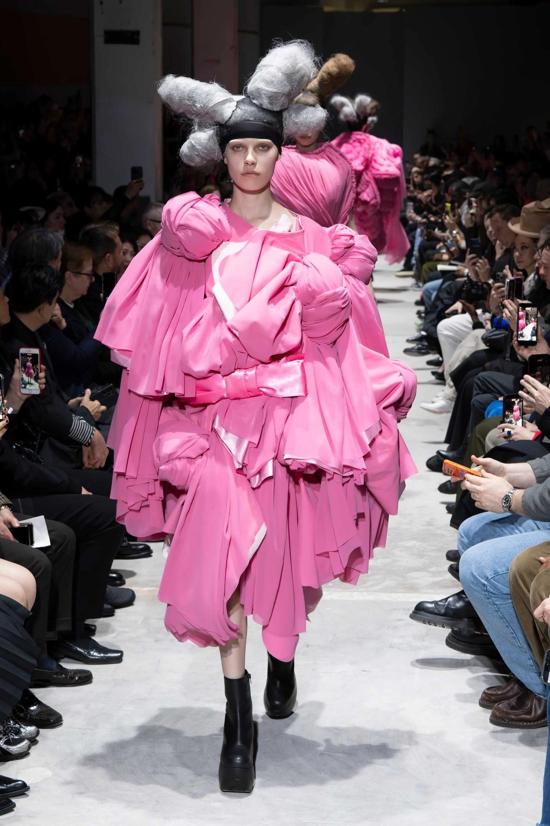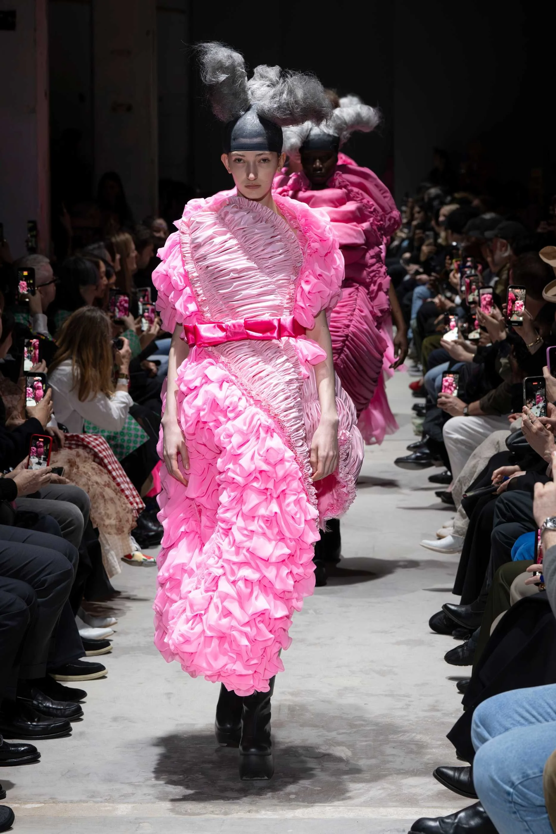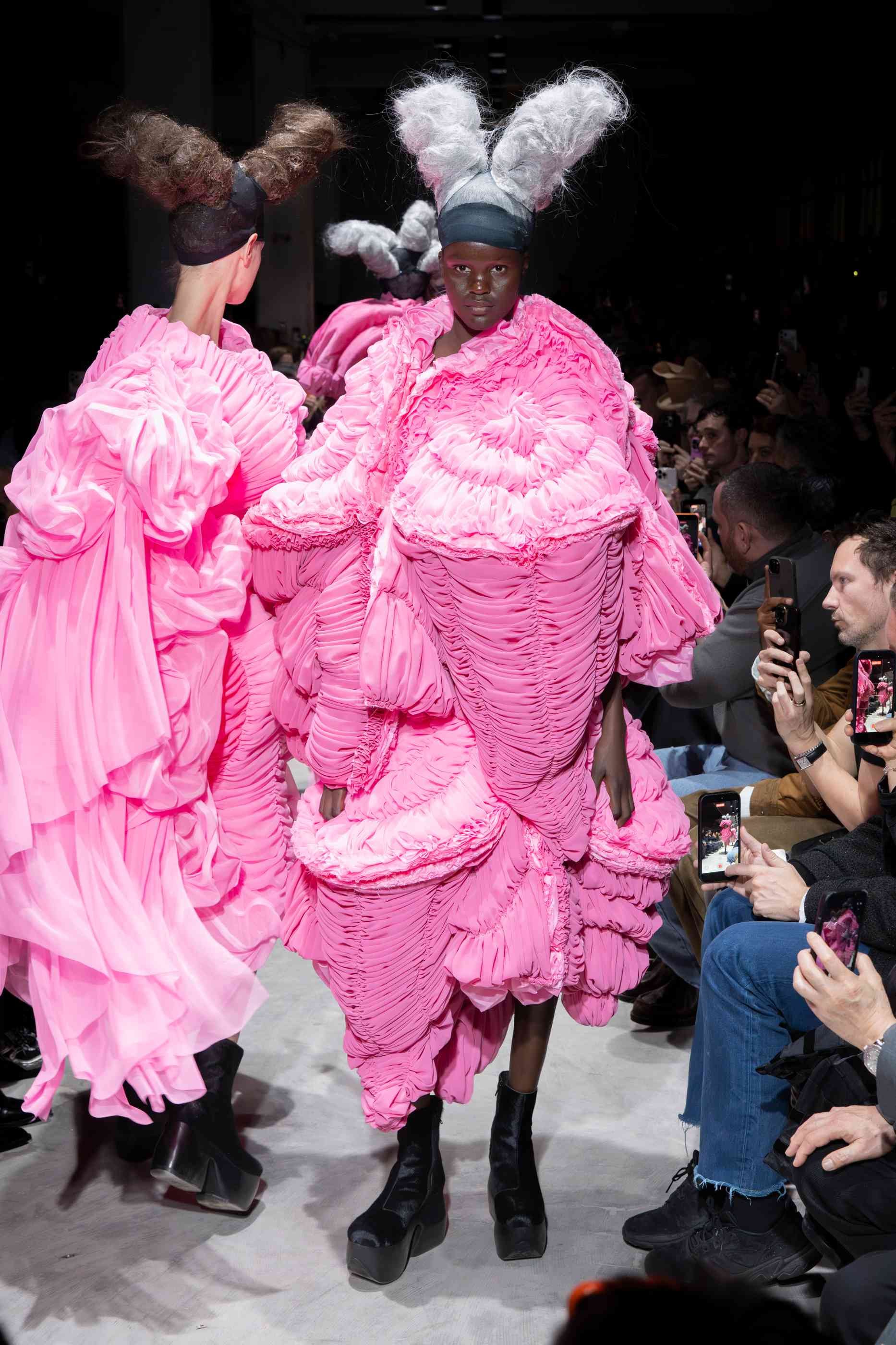 The interruption, when it came, was jarring by design. Six saccharine-pink looks stormed the runway mid-show, reworkings of earlier black silhouettes now saturated in the colour most opposed to the surrounding void. The tension was deliberate. Rei Kawakubo has always understood that the most effective statement arrives through contrast, not confirmation. John Fluevog's chunky wooden platform boots, reunited with the house after years apart, planted the entire vision firmly on the ground. Cosmic in concept, physical in presence. That balance, the metaphysical made wearable, is the particular achievement Kawakubo continues to pull off, collection after collection, without apparent effort and with enormous, sustained intelligence.