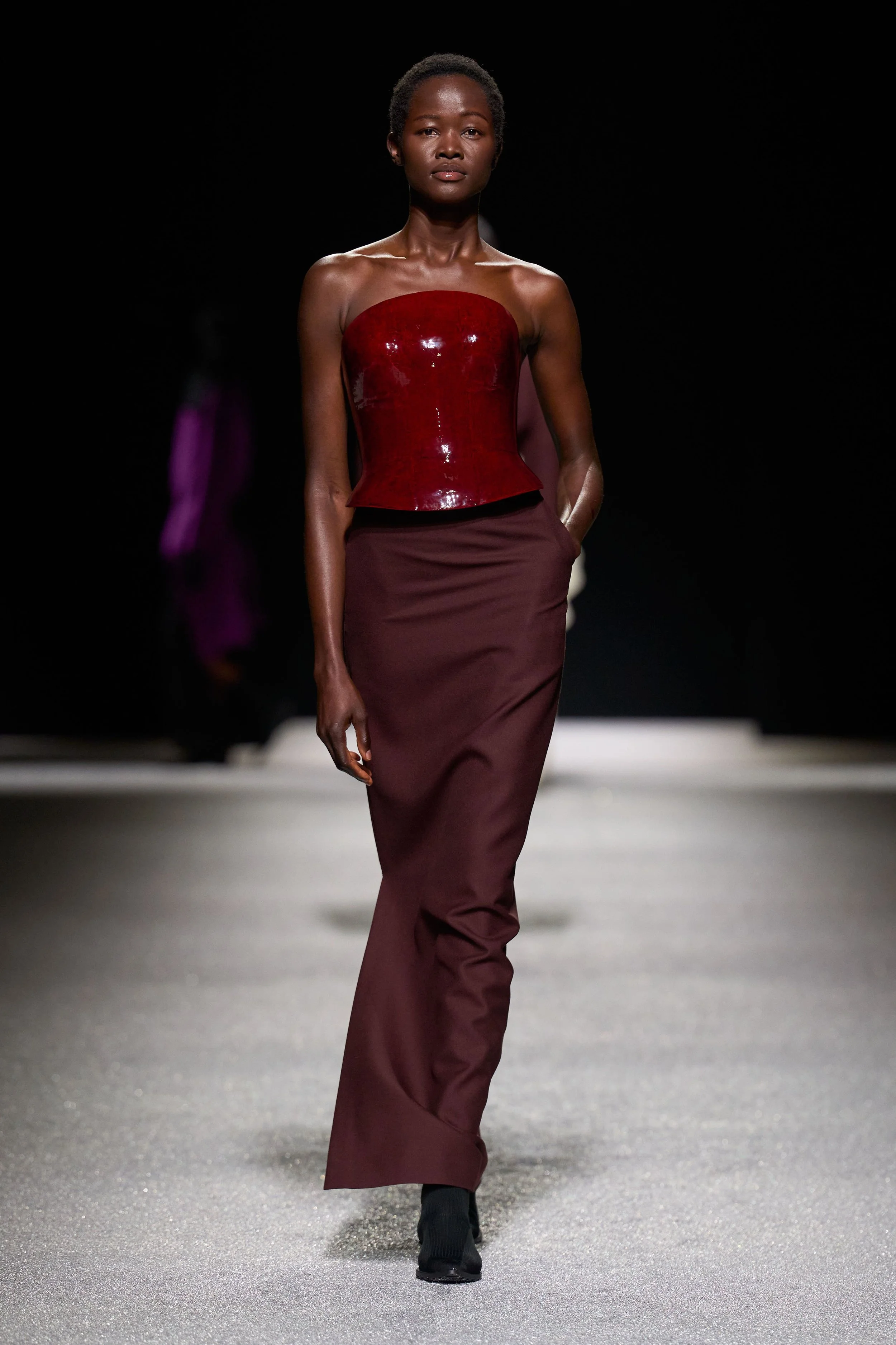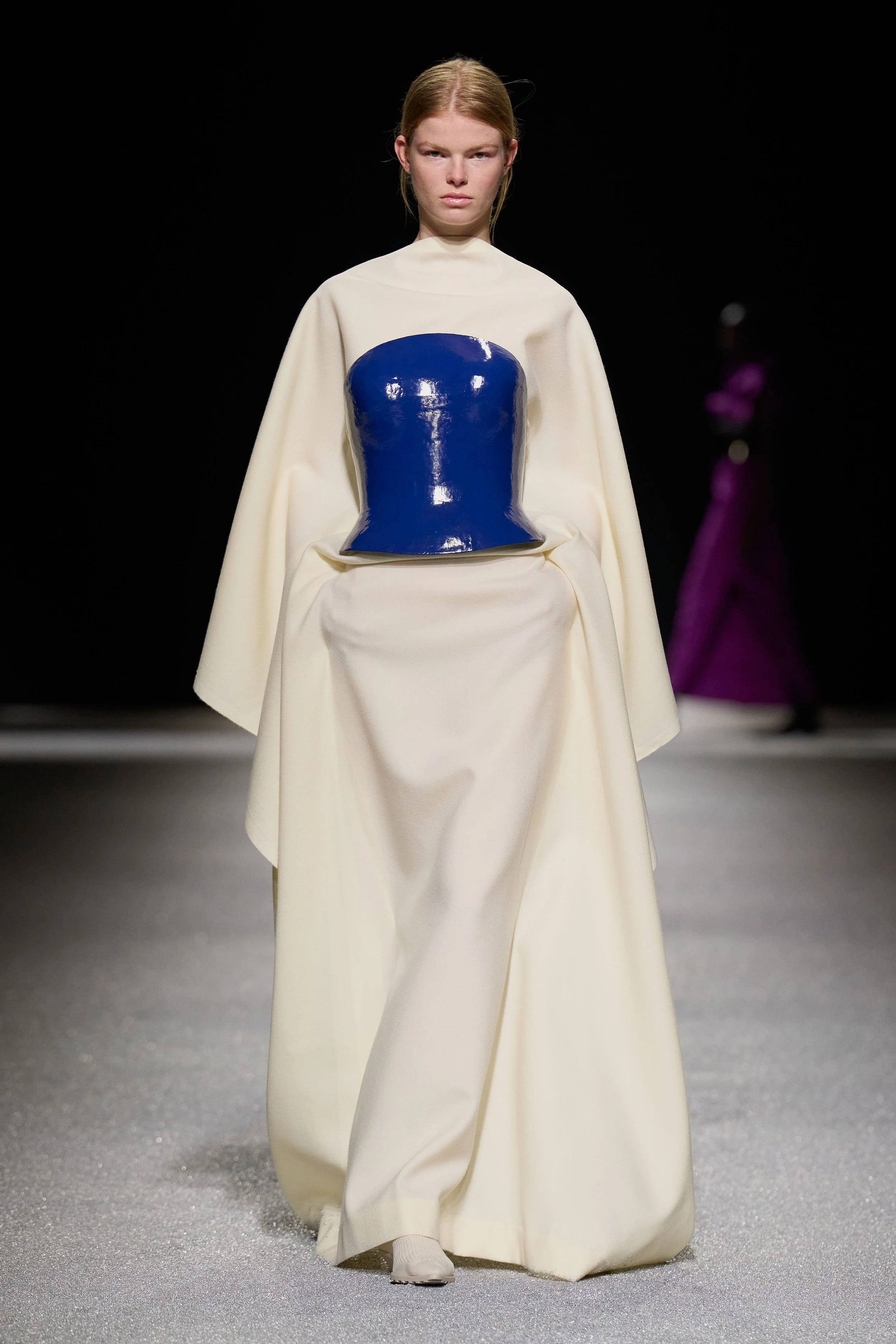 The collection also revisited the house’s signature pleating techniques, producing complex forms reminiscent of coral or fossil-like textures. Bright tones such as yellow, orange, and violet punctuated a more restrained palette, adding moments of energy within the contemplative atmosphere of the show.