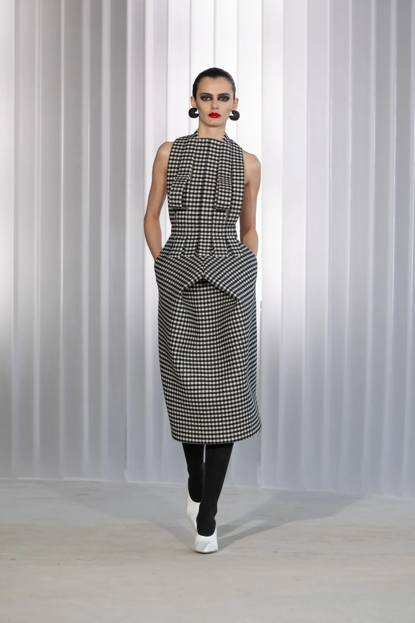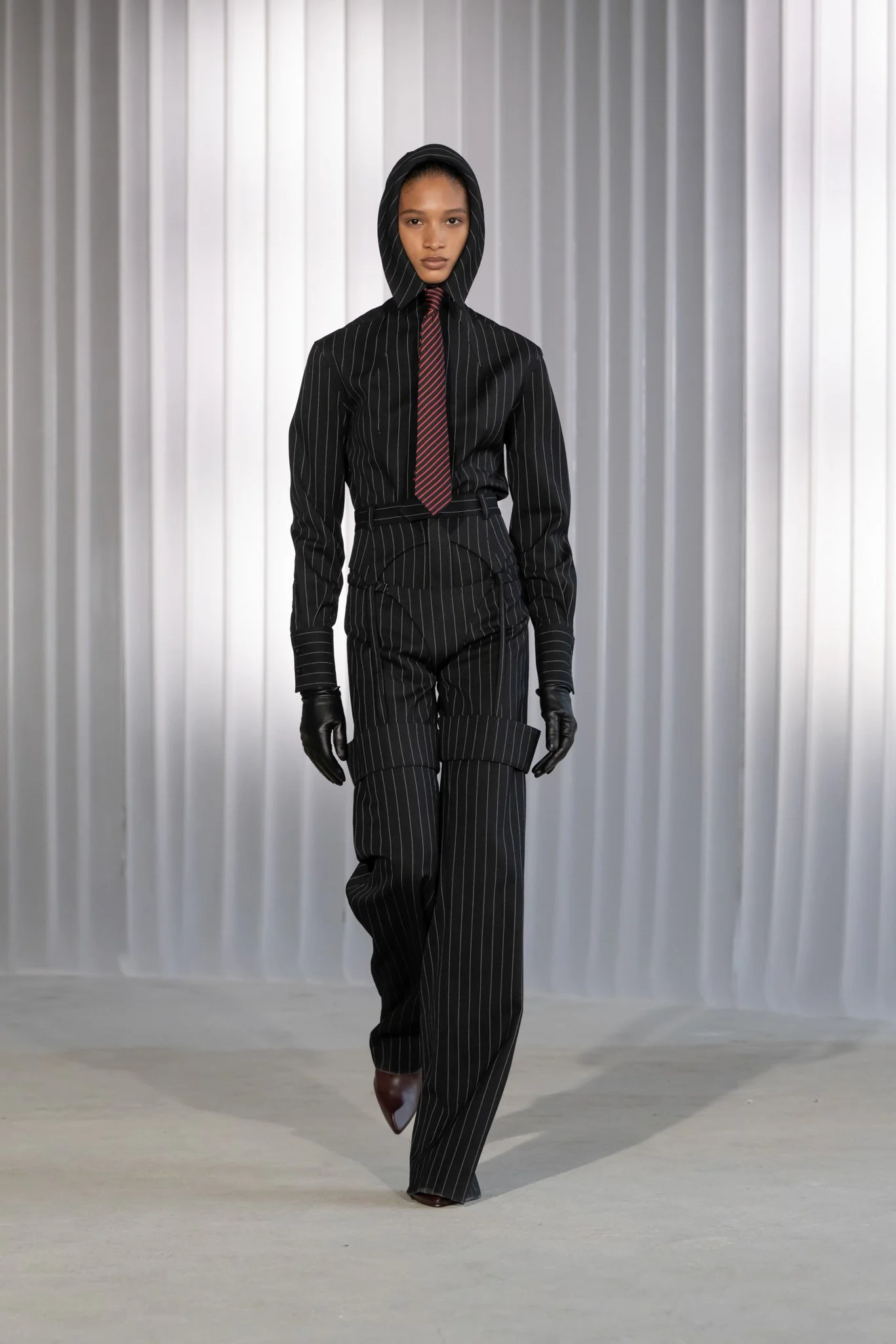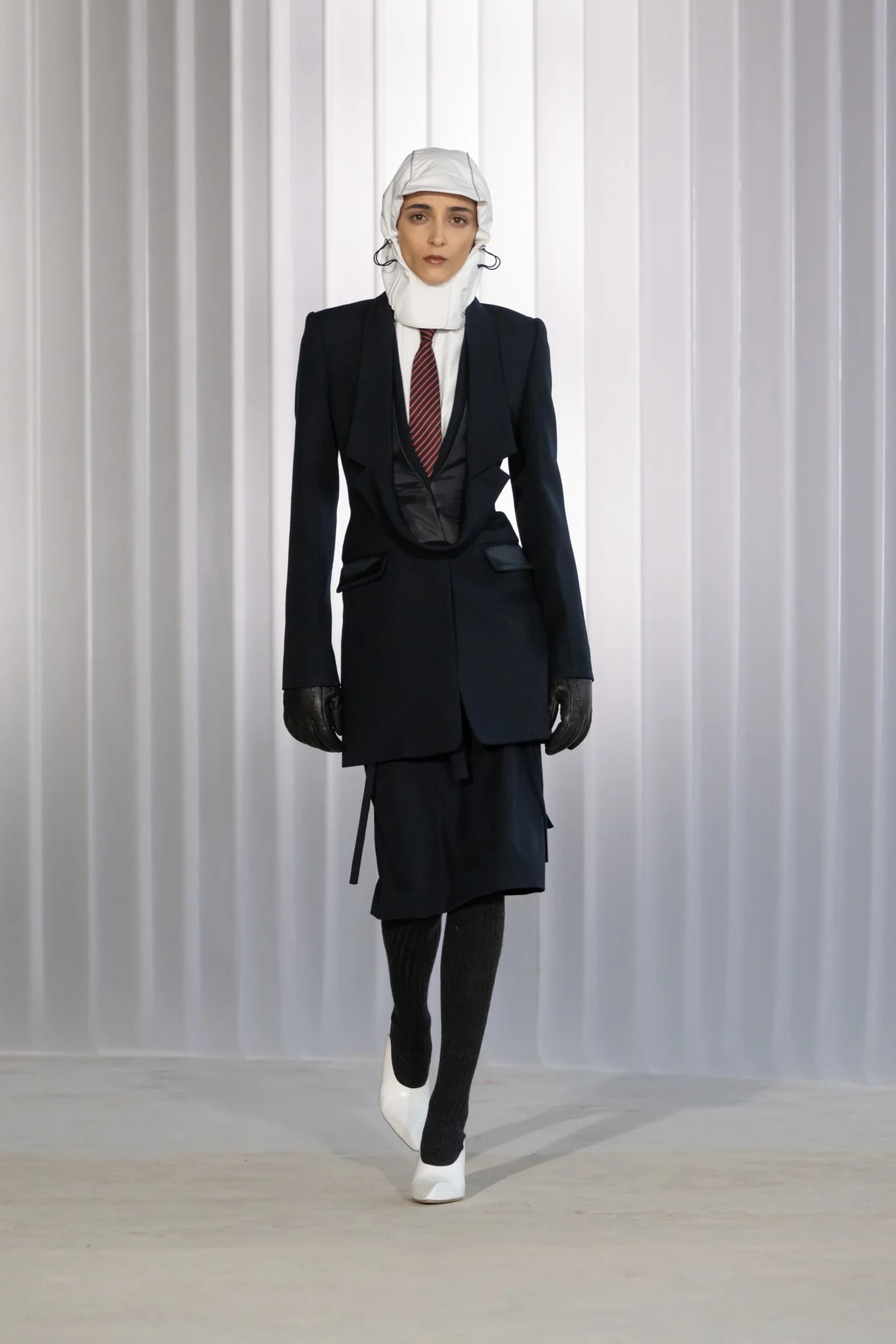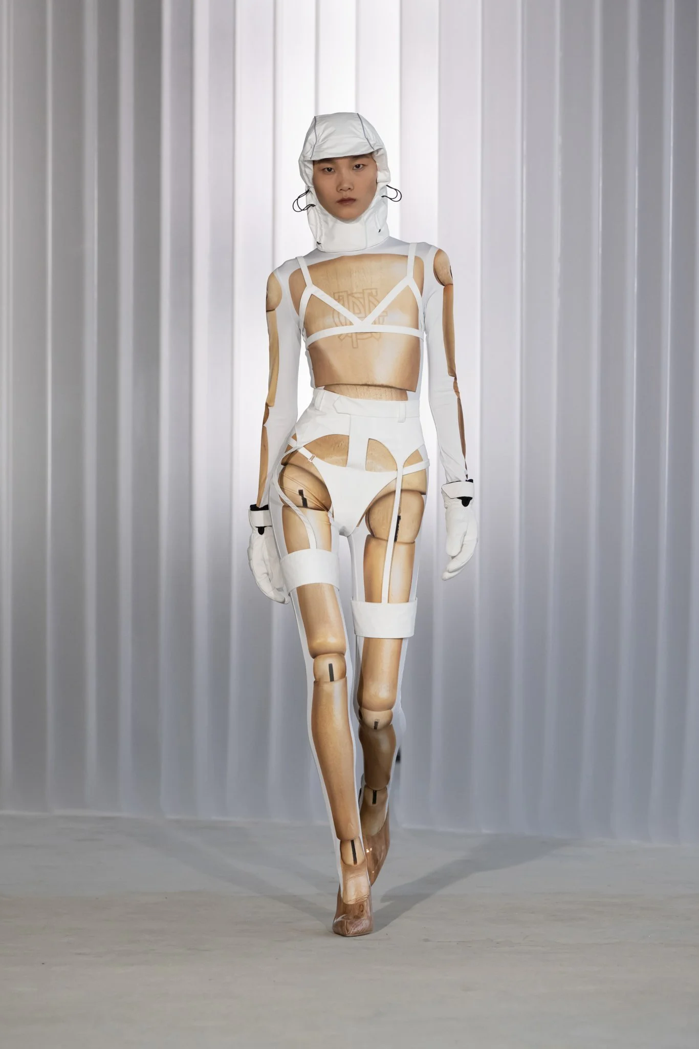 Corsetry, one of the maison’s most recognizable signatures, appeared in exaggerated and unexpected constructions, layered over oversized tailoring and hybrid garments that merged masculine and feminine silhouettes. Trompe-l’oeil prints and reworked denim pieces added a sense of irony, while voluminous shapes and reconstructed materials reflected Lantink’s interest in transformation and sustainability.
