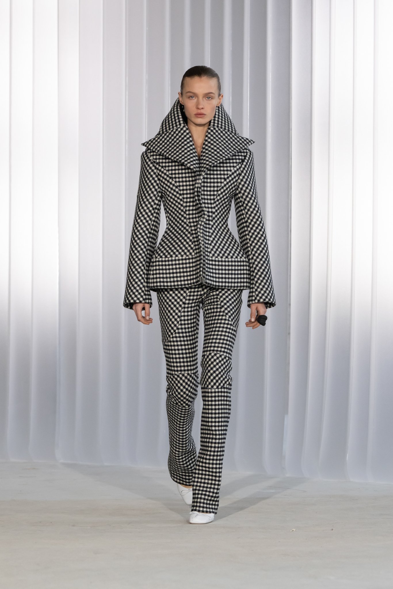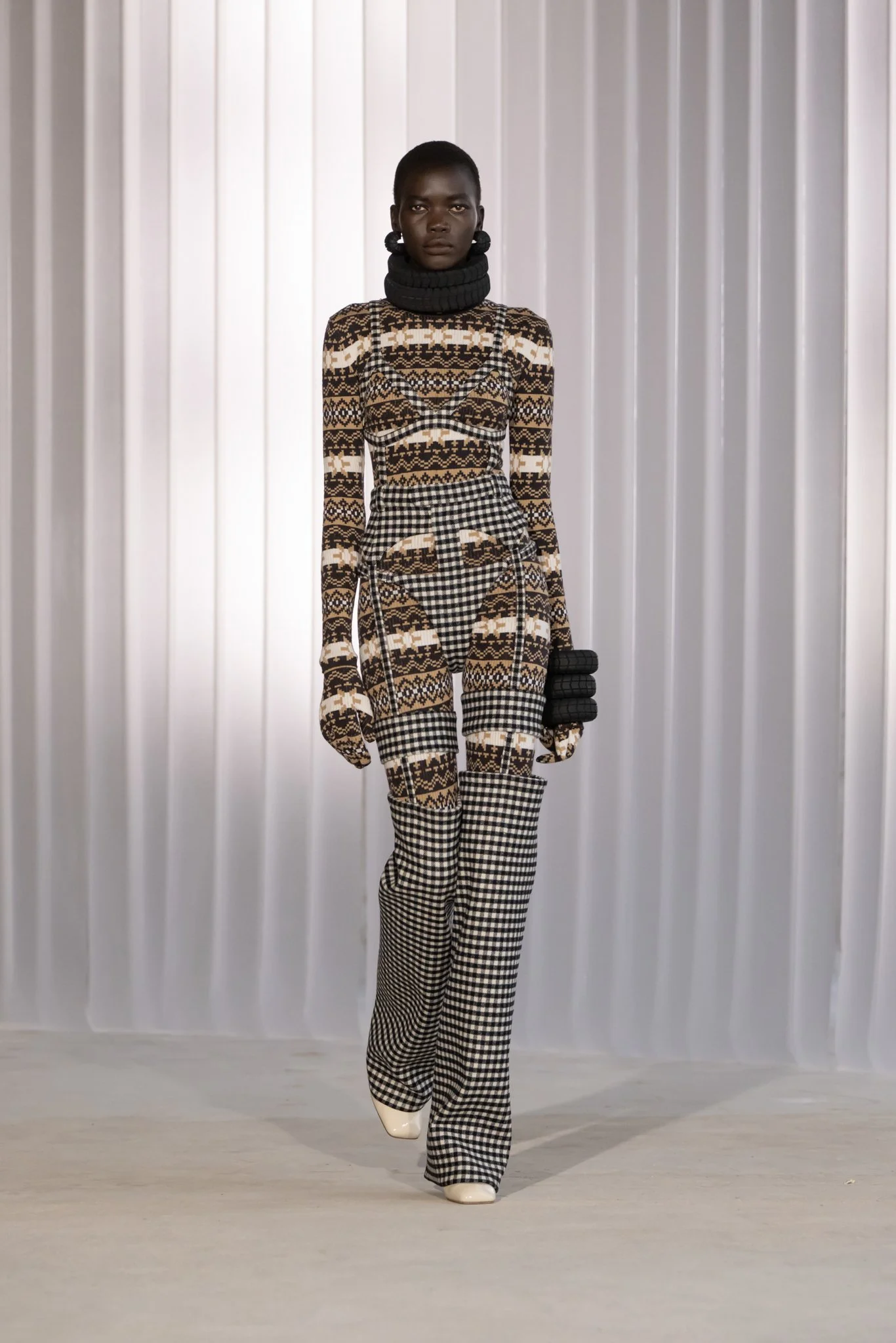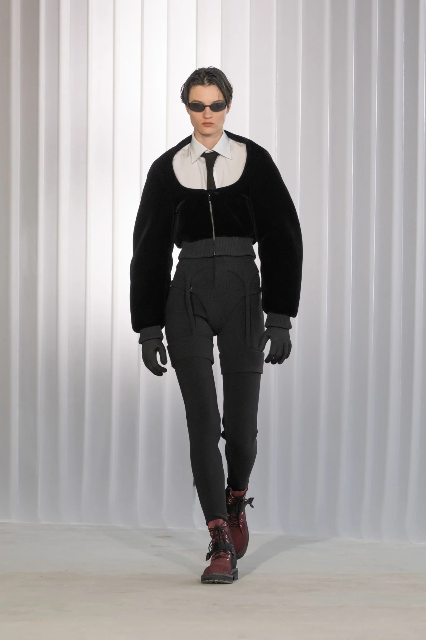 Corsetry, one of the maison’s most recognizable signatures, appeared in exaggerated and unexpected constructions, layered over oversized tailoring and hybrid garments that merged masculine and feminine silhouettes. Trompe-l’oeil prints and reworked denim pieces added a sense of irony, while voluminous shapes and reconstructed materials reflected Lantink’s interest in transformation and sustainability.