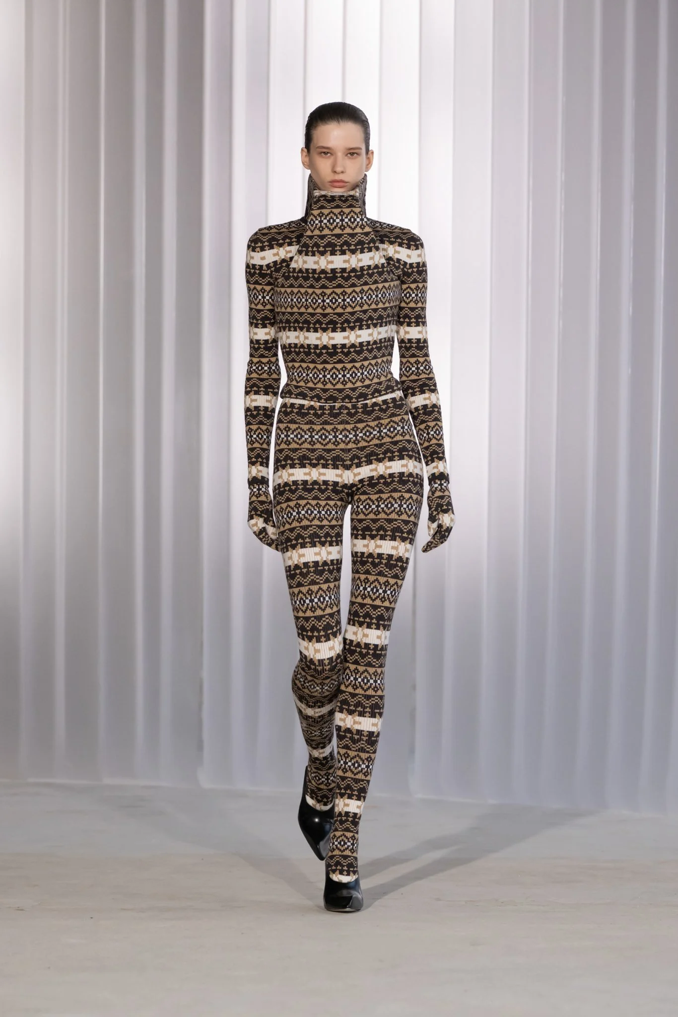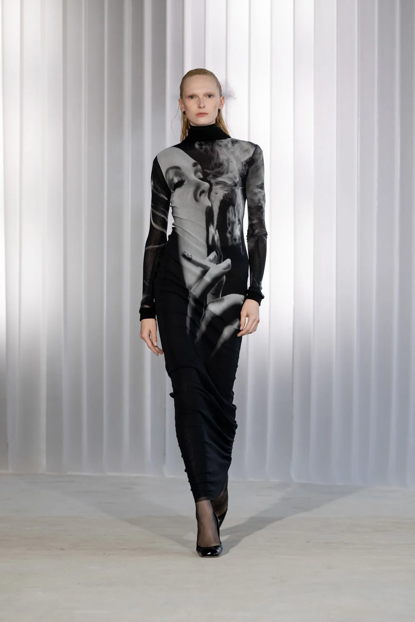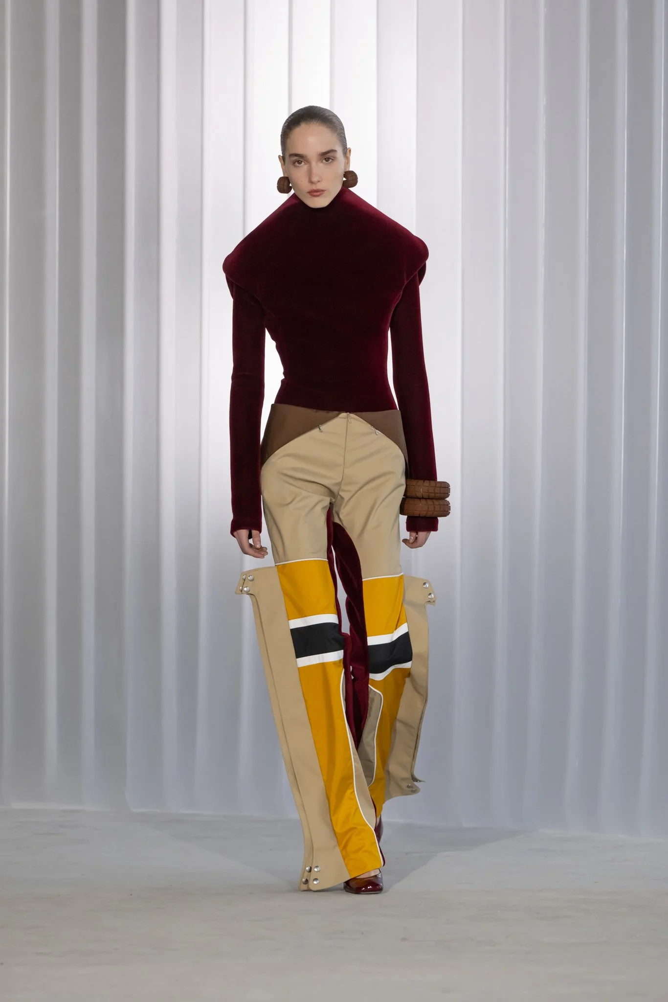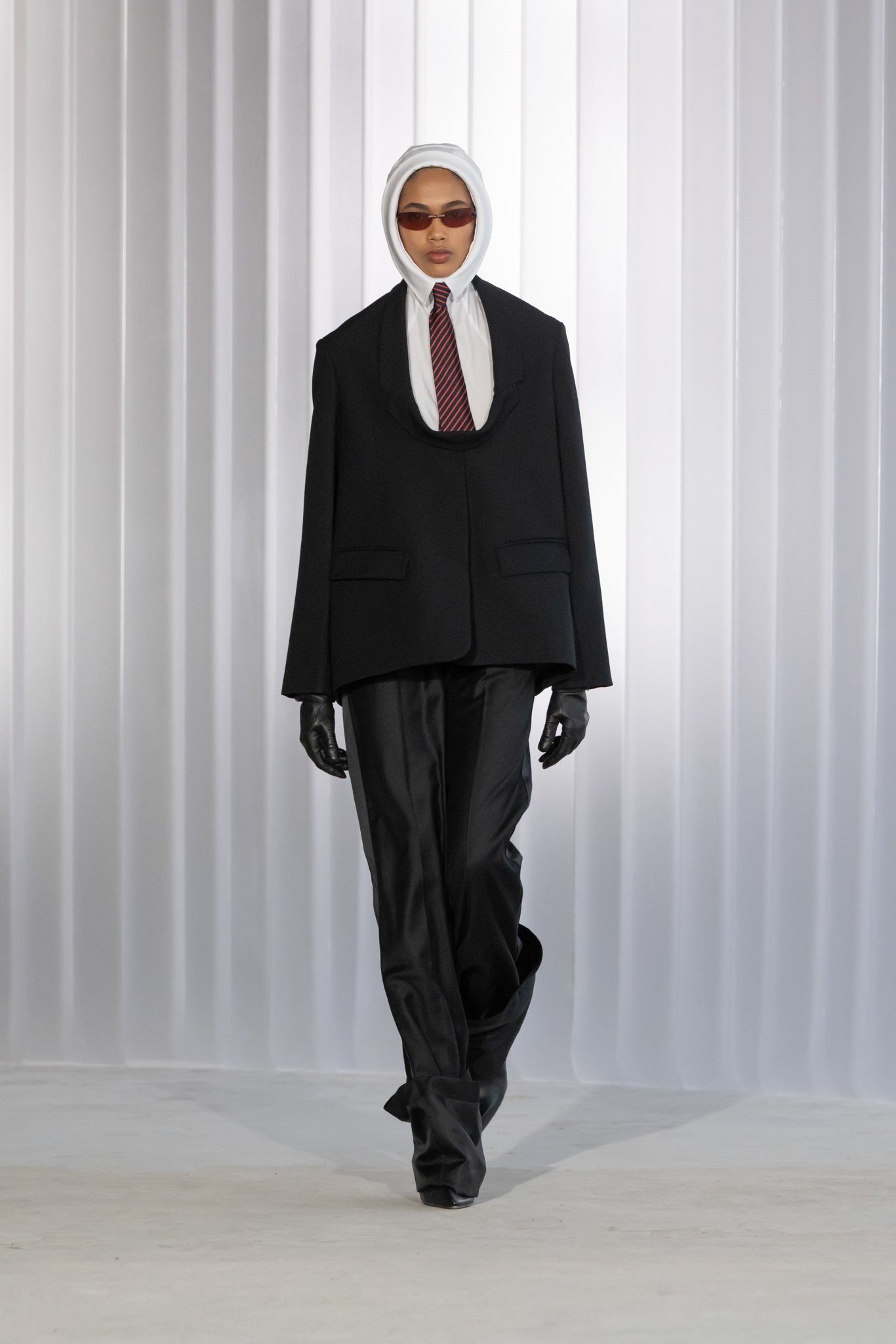 Corsetry, one of the maison’s most recognizable signatures, appeared in exaggerated and unexpected constructions, layered over oversized tailoring and hybrid garments that merged masculine and feminine silhouettes. Trompe-l’oeil prints and reworked denim pieces added a sense of irony, while voluminous shapes and reconstructed materials reflected Lantink’s interest in transformation and sustainability.