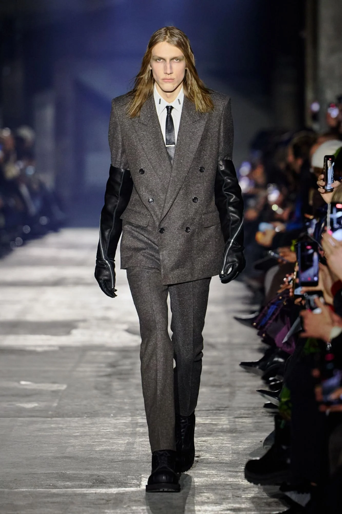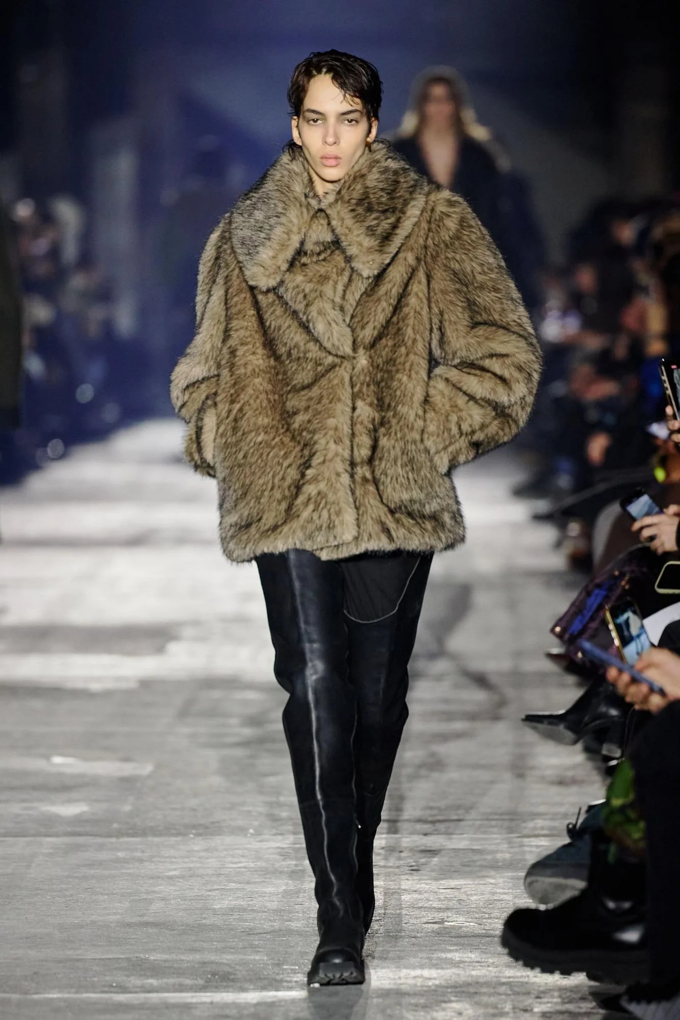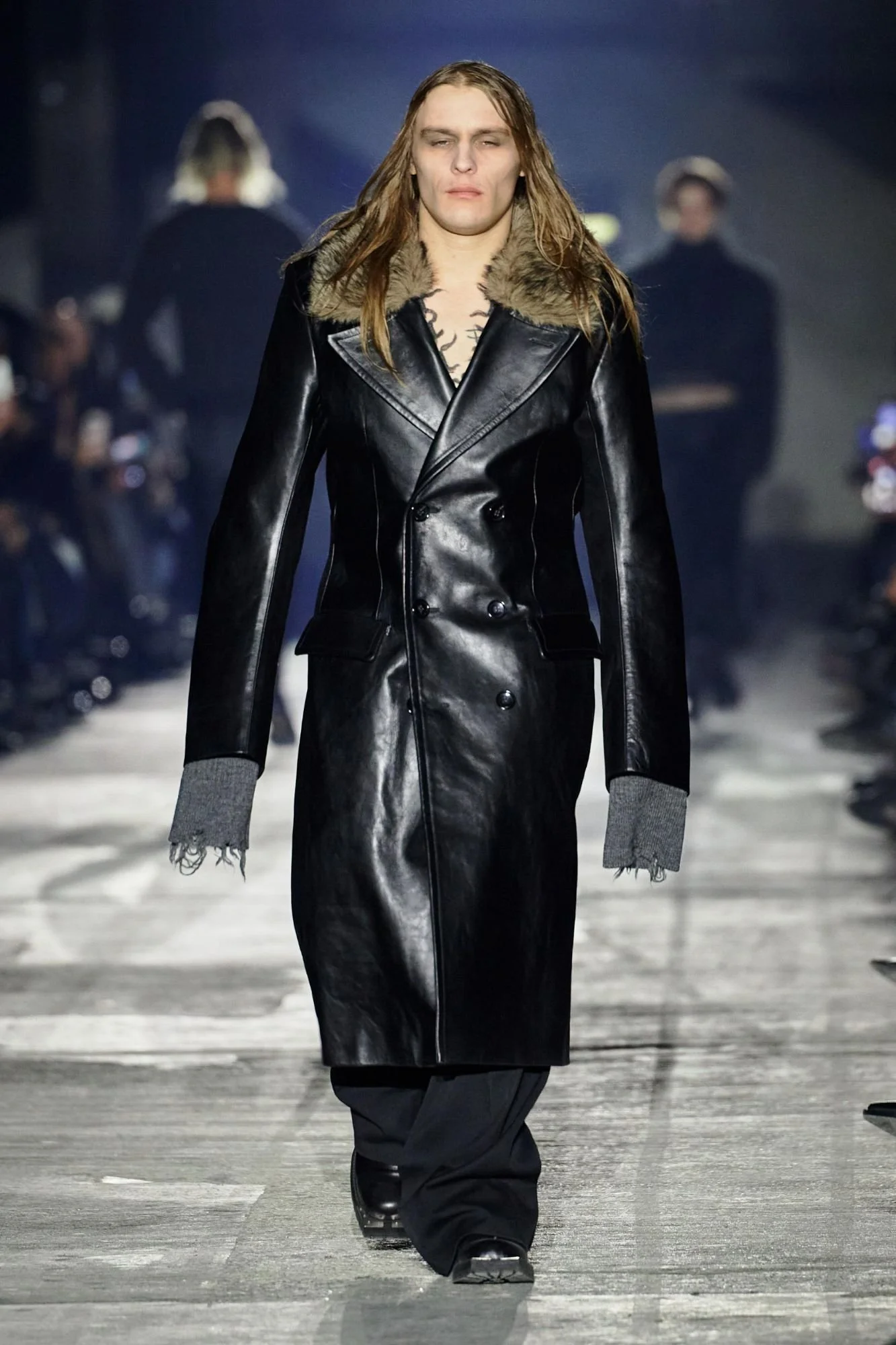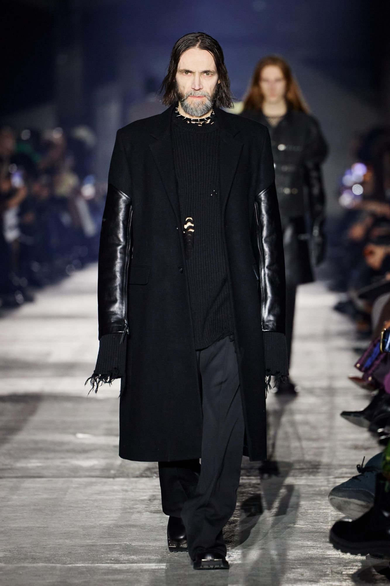 Shown at the industrial Kraftwerk venue, the setting amplified the collection’s urban and confrontational energy. Outerwear led the narrative, with long leather coats, sharp tailored jackets, biker silhouettes, and over-the-knee boots forming a dominant visual language. The palette remained stark and restrained, moving through deep black, icy silver, white, and touches of camouflage.