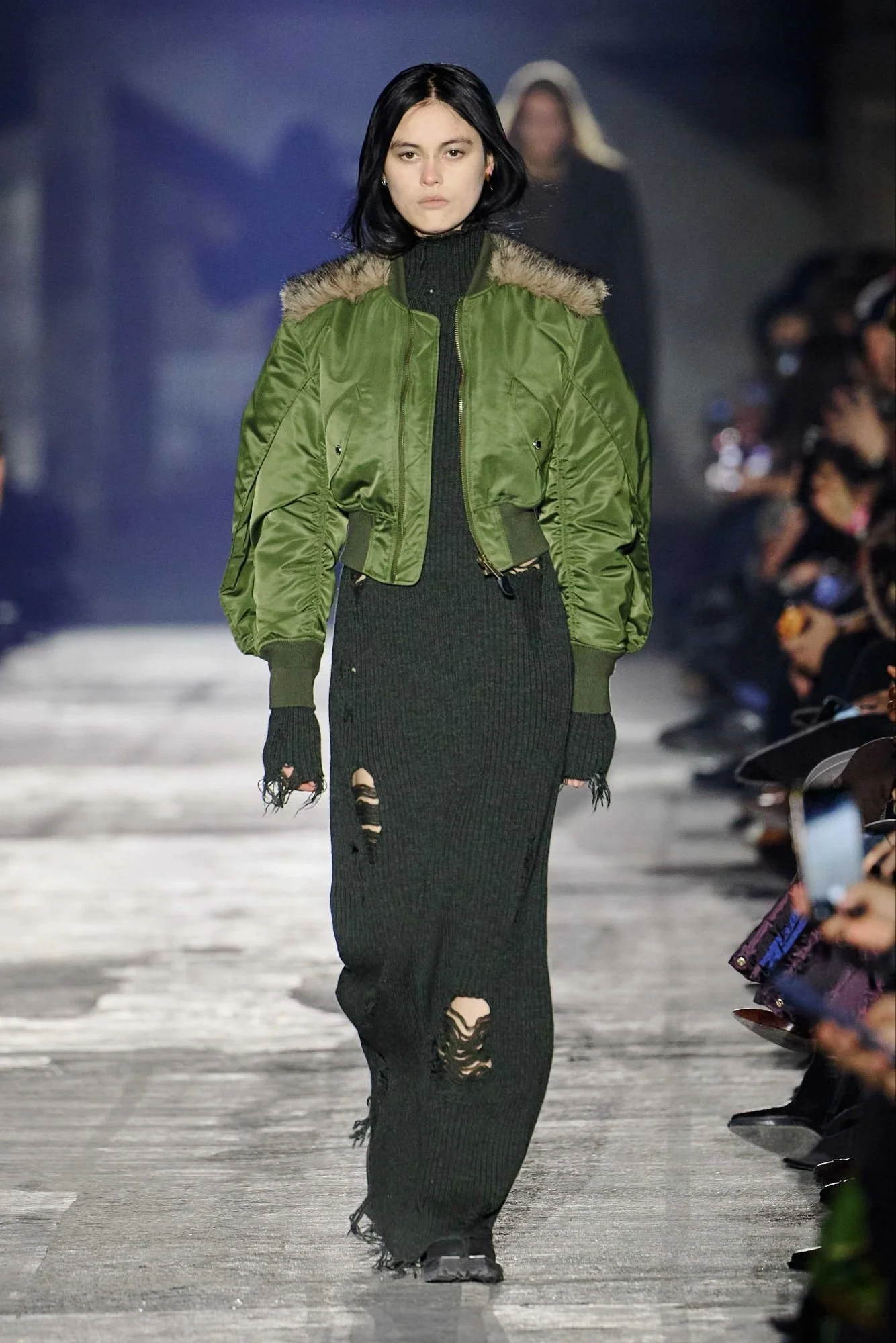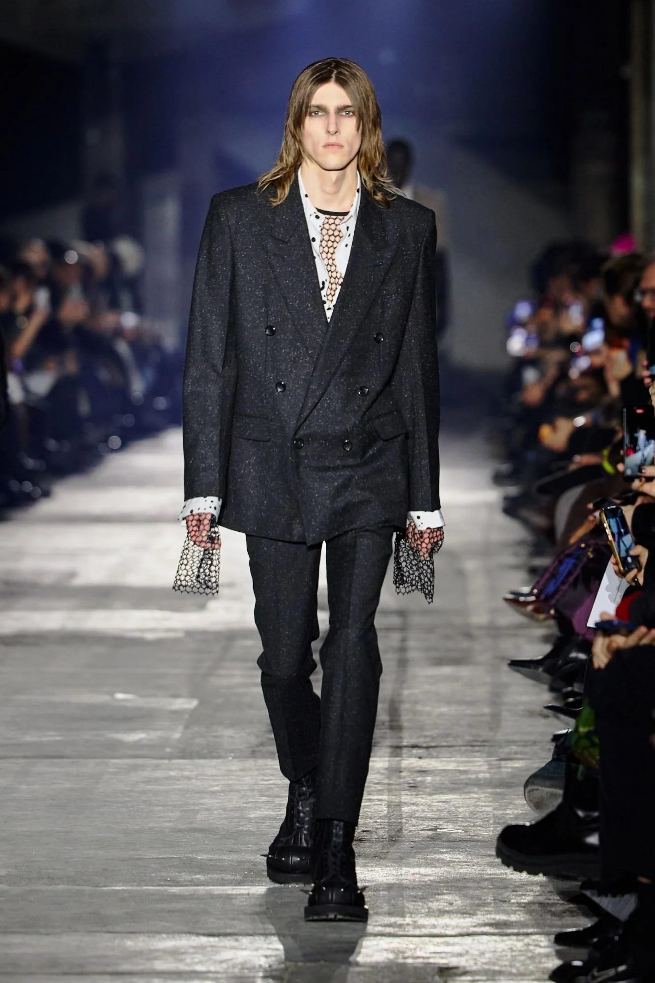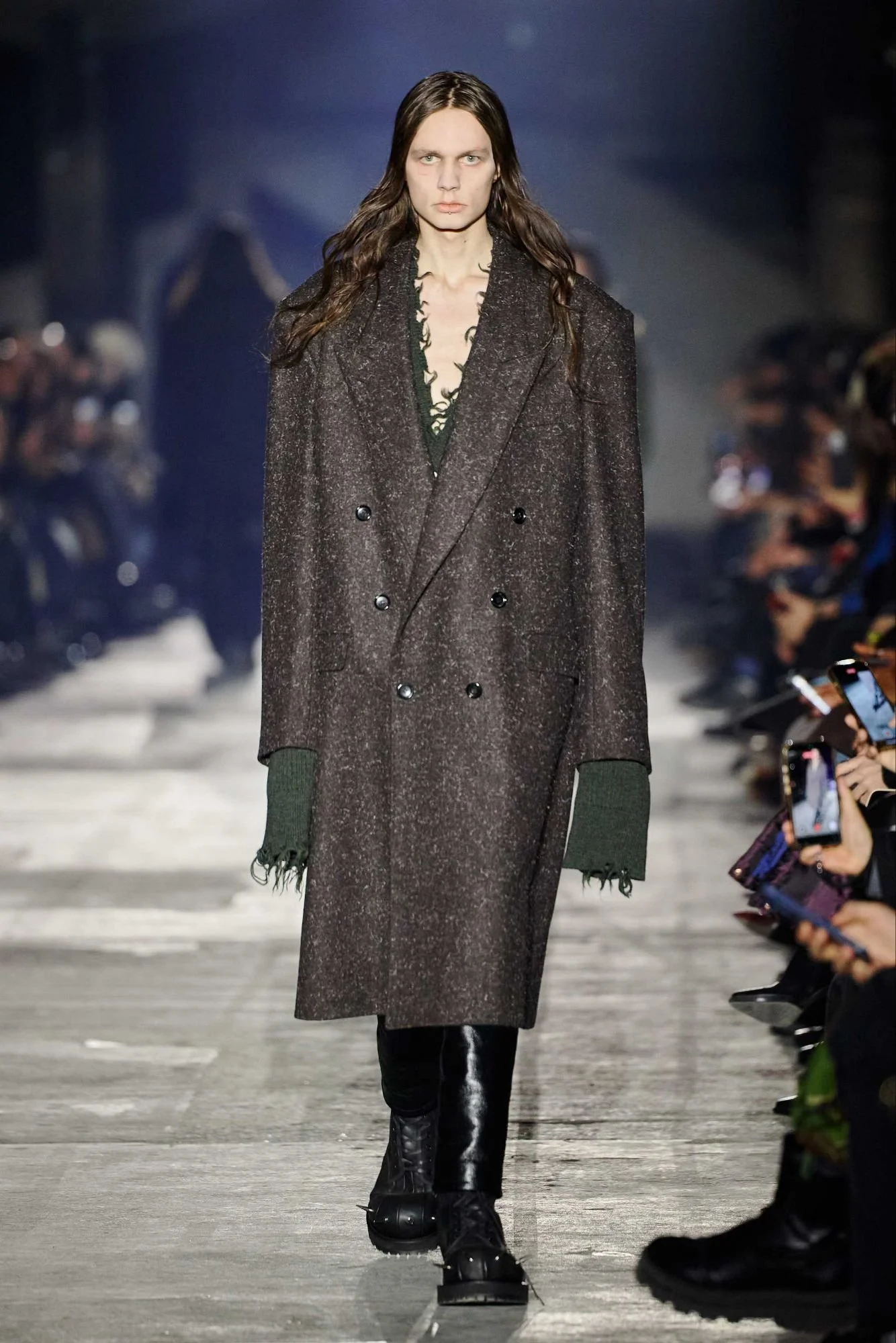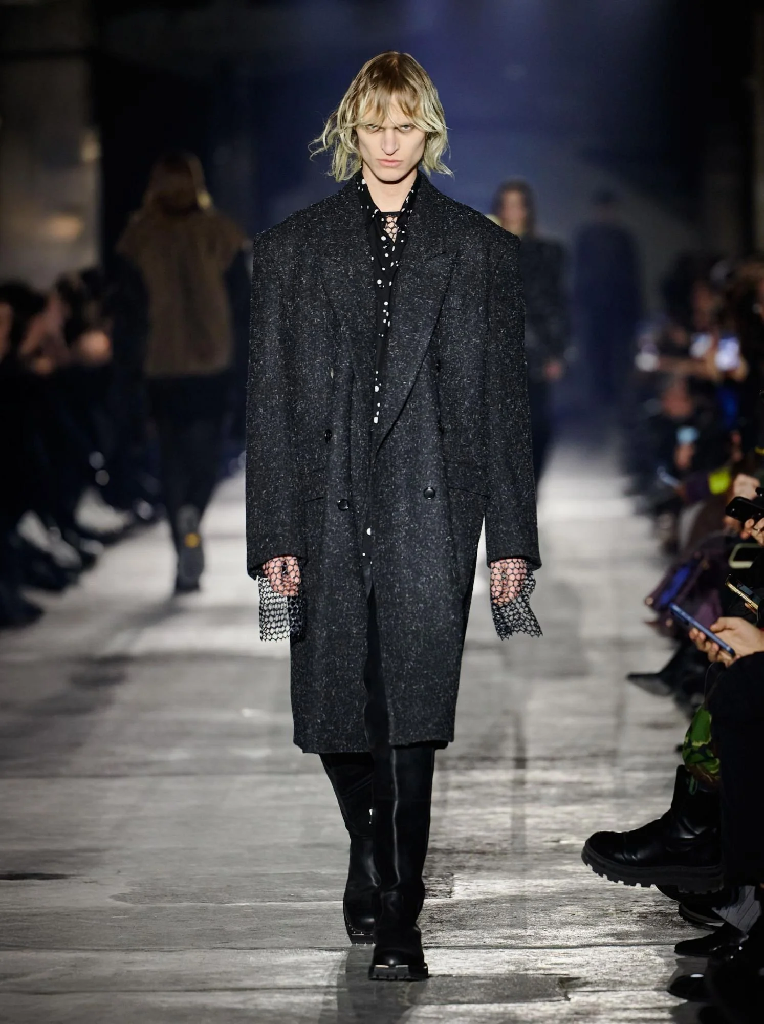 Shown at the industrial Kraftwerk venue, the setting amplified the collection’s urban and confrontational energy. Outerwear led the narrative, with long leather coats, sharp tailored jackets, biker silhouettes, and over-the-knee boots forming a dominant visual language. The palette remained stark and restrained, moving through deep black, icy silver, white, and touches of camouflage.
