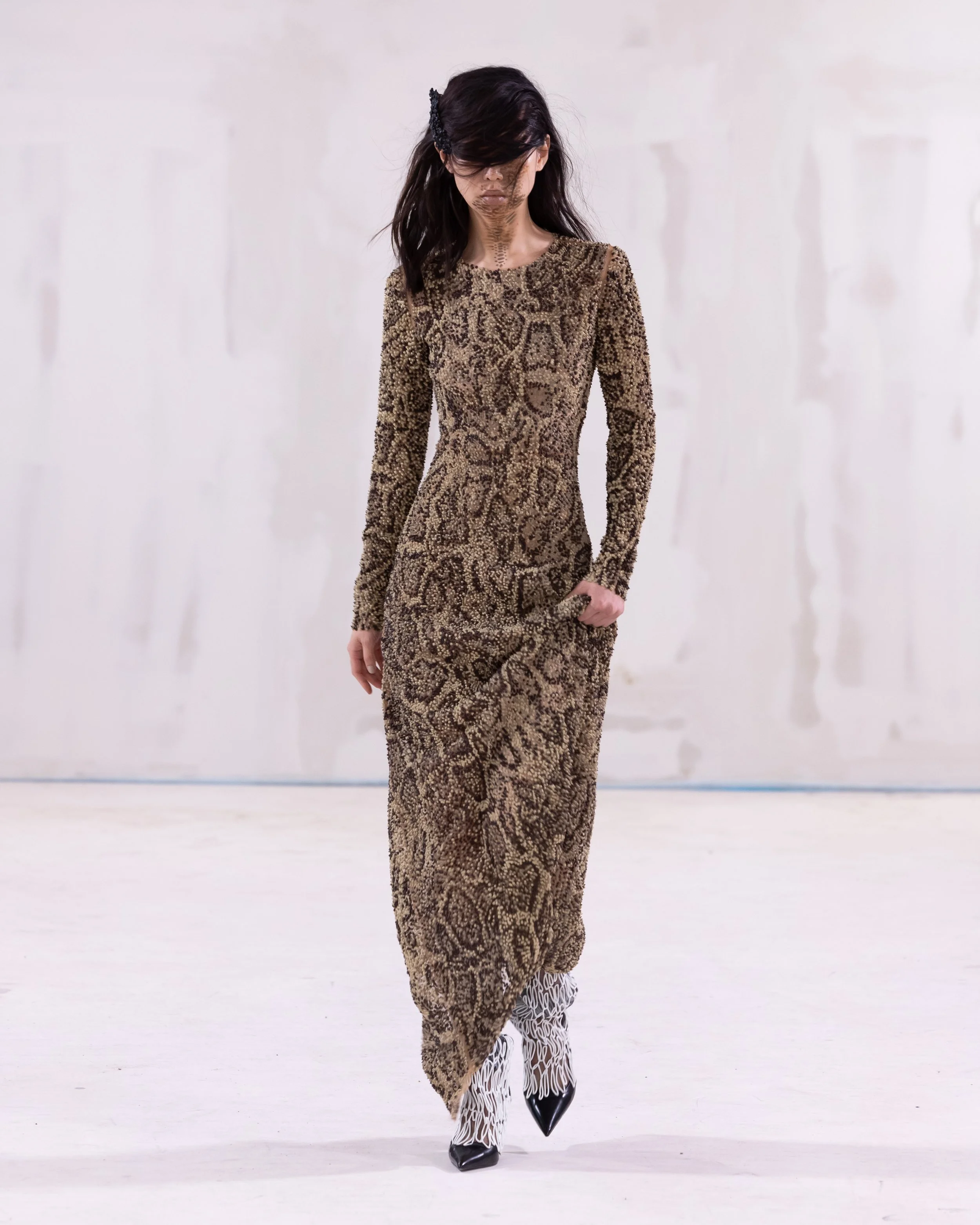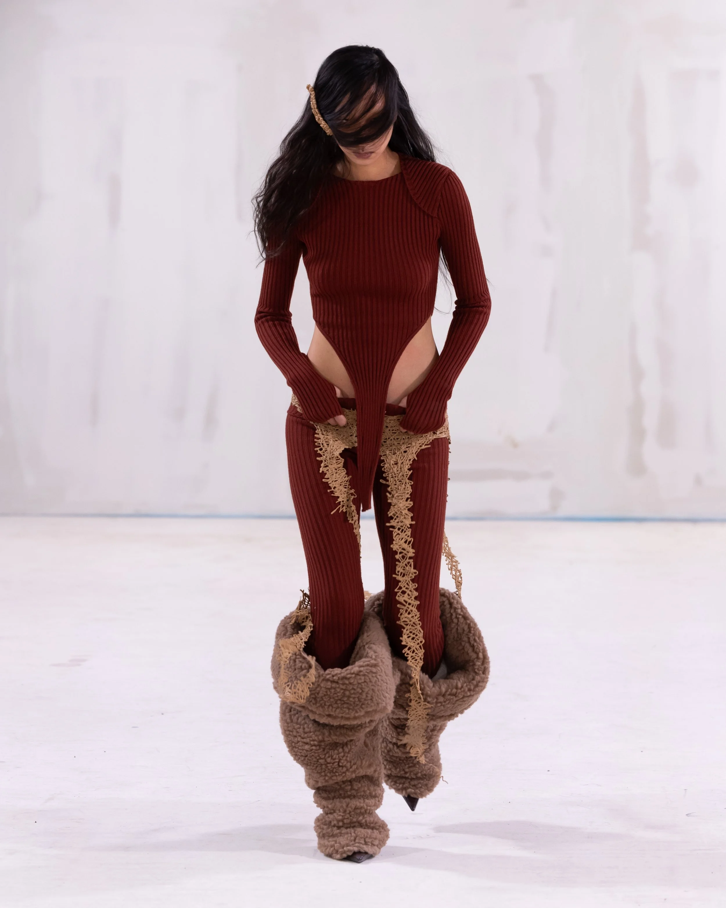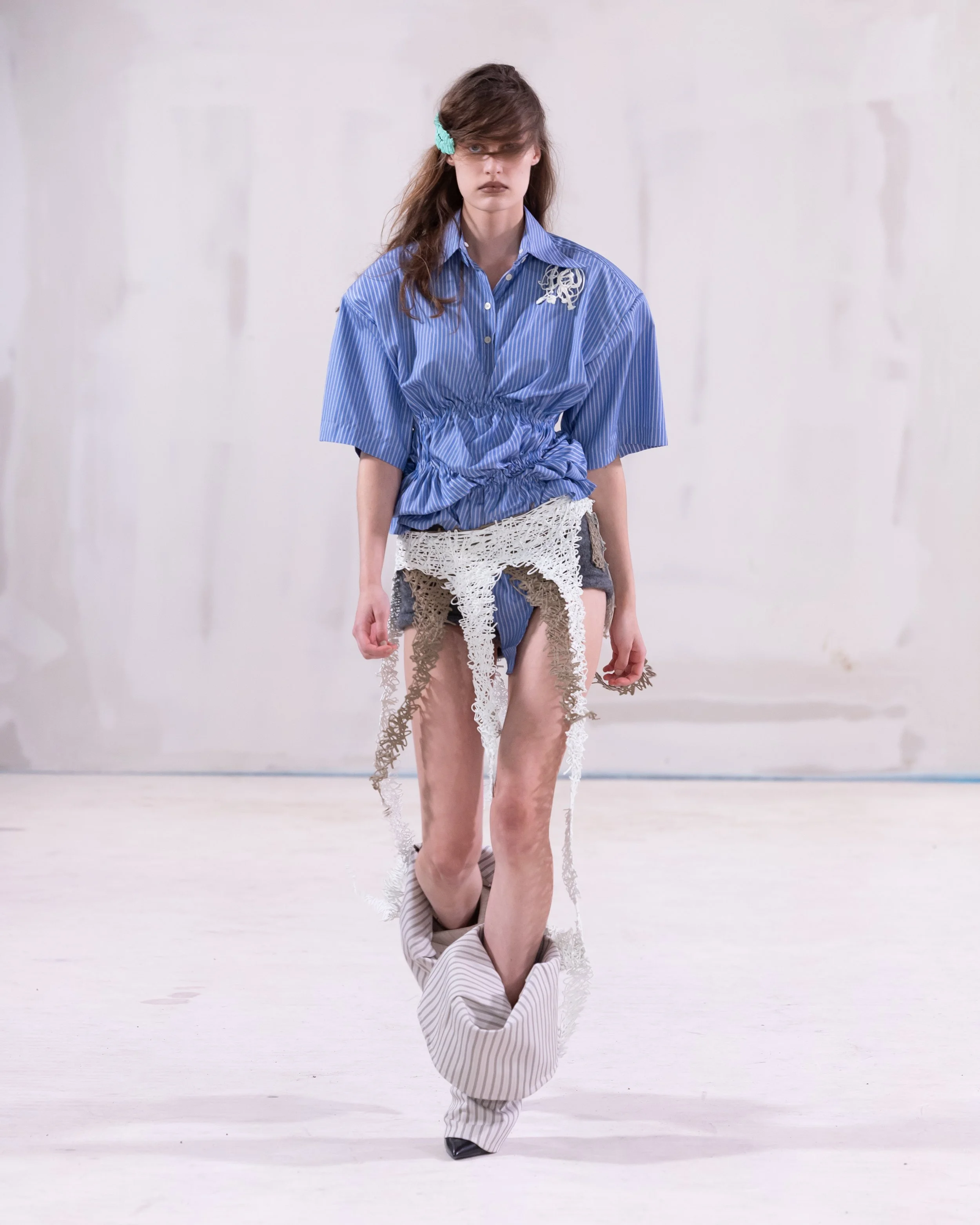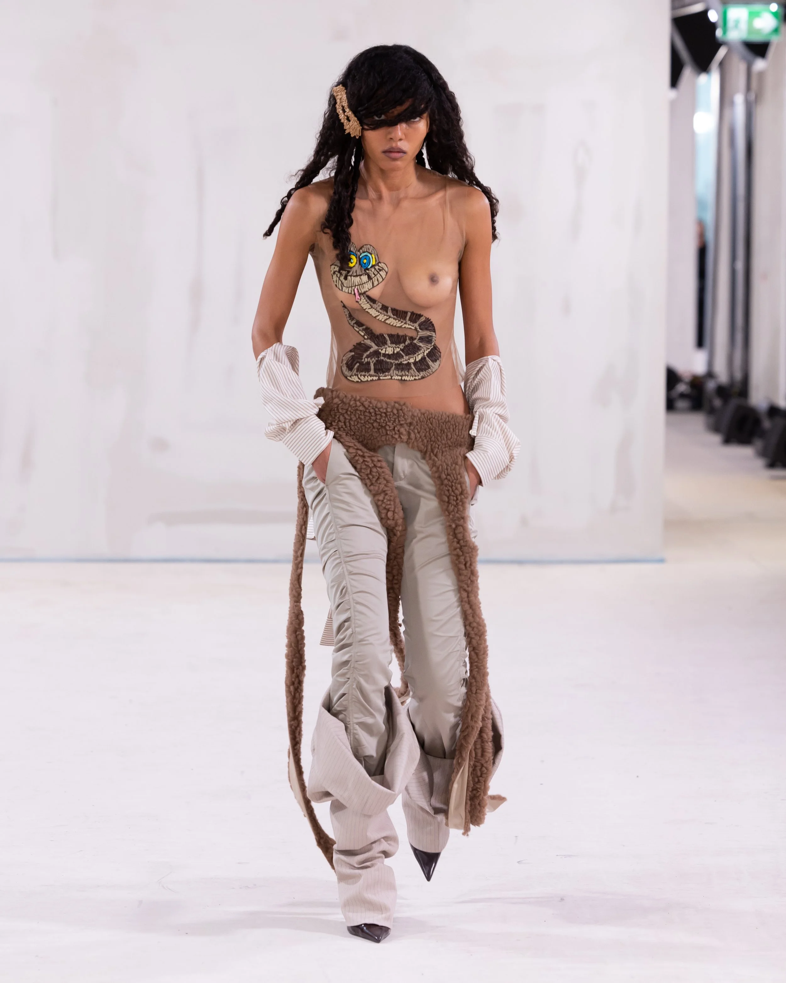 Recurring shirting appears deconstructed into modular, tieable forms that replace formality with adaptability. Autumn Winter 2026 reframes ambivalence and multitasking not as weaknesses, but as powerful expressions of contemporary female identity.