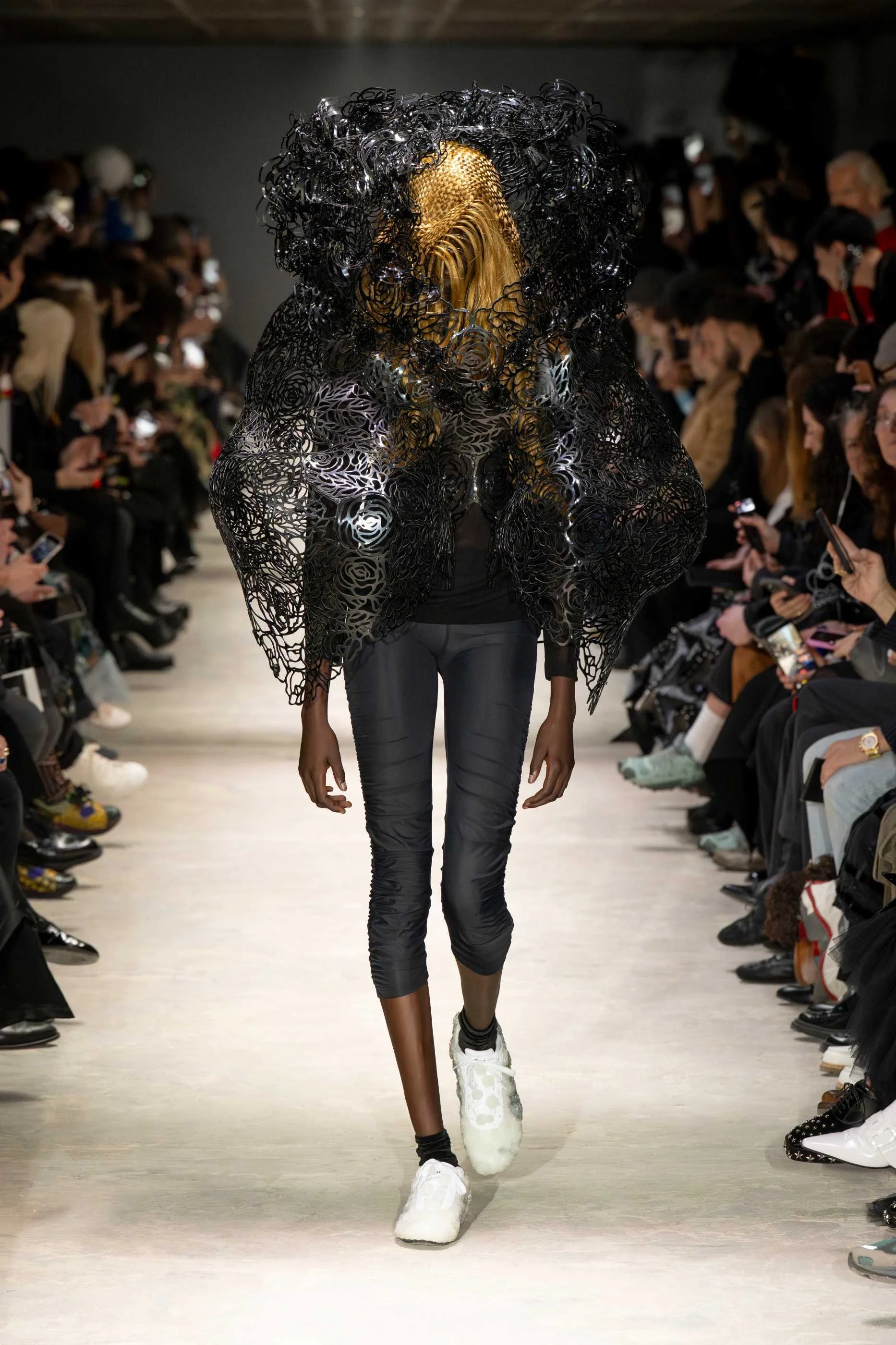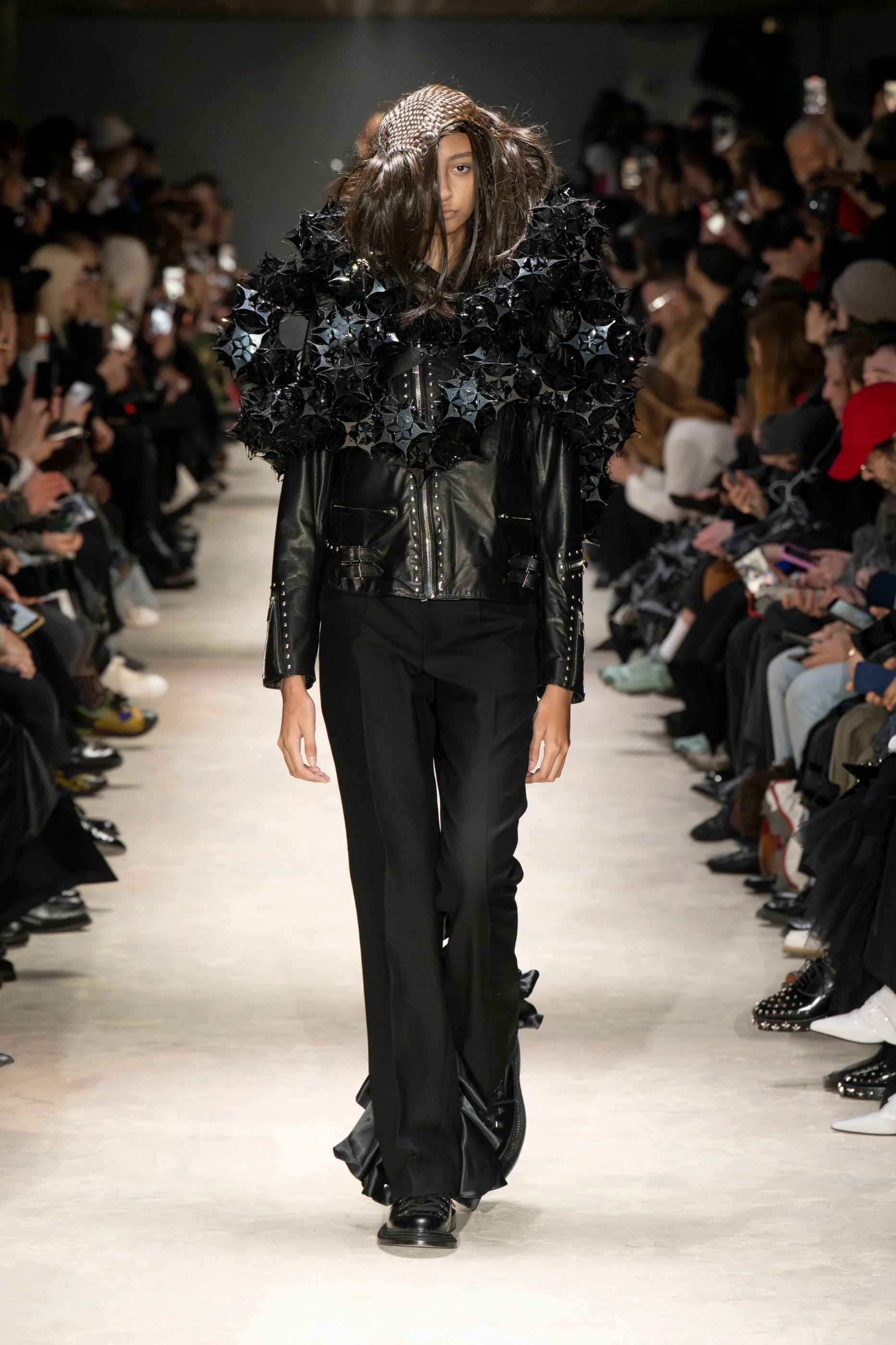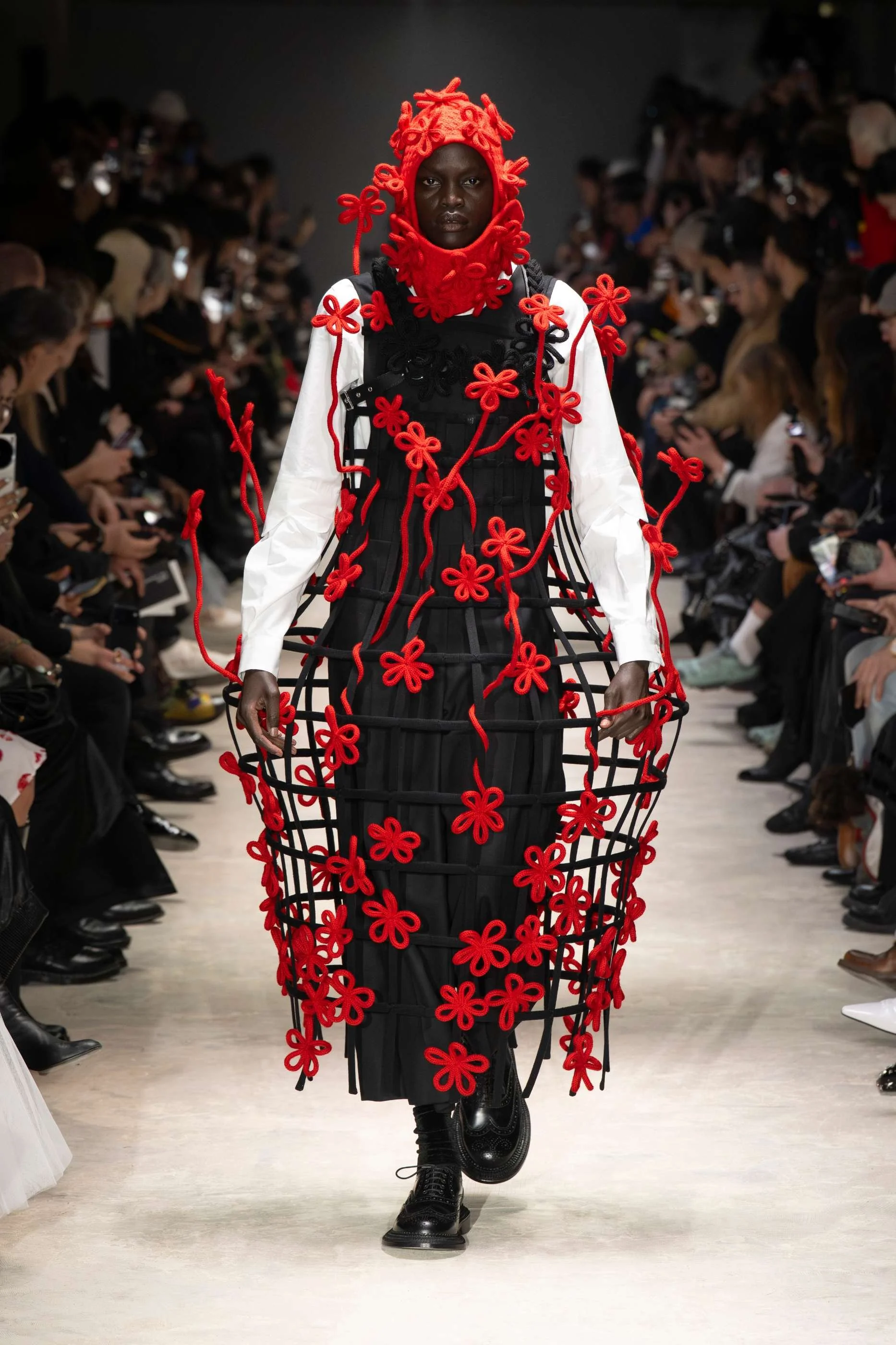 Kei Ninomiya called his FW26 collection "Dark Blooming," and the title did its job with unusual precision. The show opened in the territory most familiar to the house: sculptural, thorn-like constructions and ribcage forms that conveyed confinement, heightened by Shinji Konishi's intricate headpieces. Black dominated. Spiny exoskeletons and metallic hardware gave the opening looks a quality of armour, or perhaps of something still trapped inside itself. Then the blooms arrived. Tiny calla lilies burst from the tip of a spiky flurry. Woven garlands threaded through sharp-looking snarls. Naive bubbly doodles rendered in metal dangled from harnesses. The shift was not gentle. It was, rather, the visual equivalent of Ninomiya's own words after the show: "There is this sadness in the world in this new century. But we should make it positive."