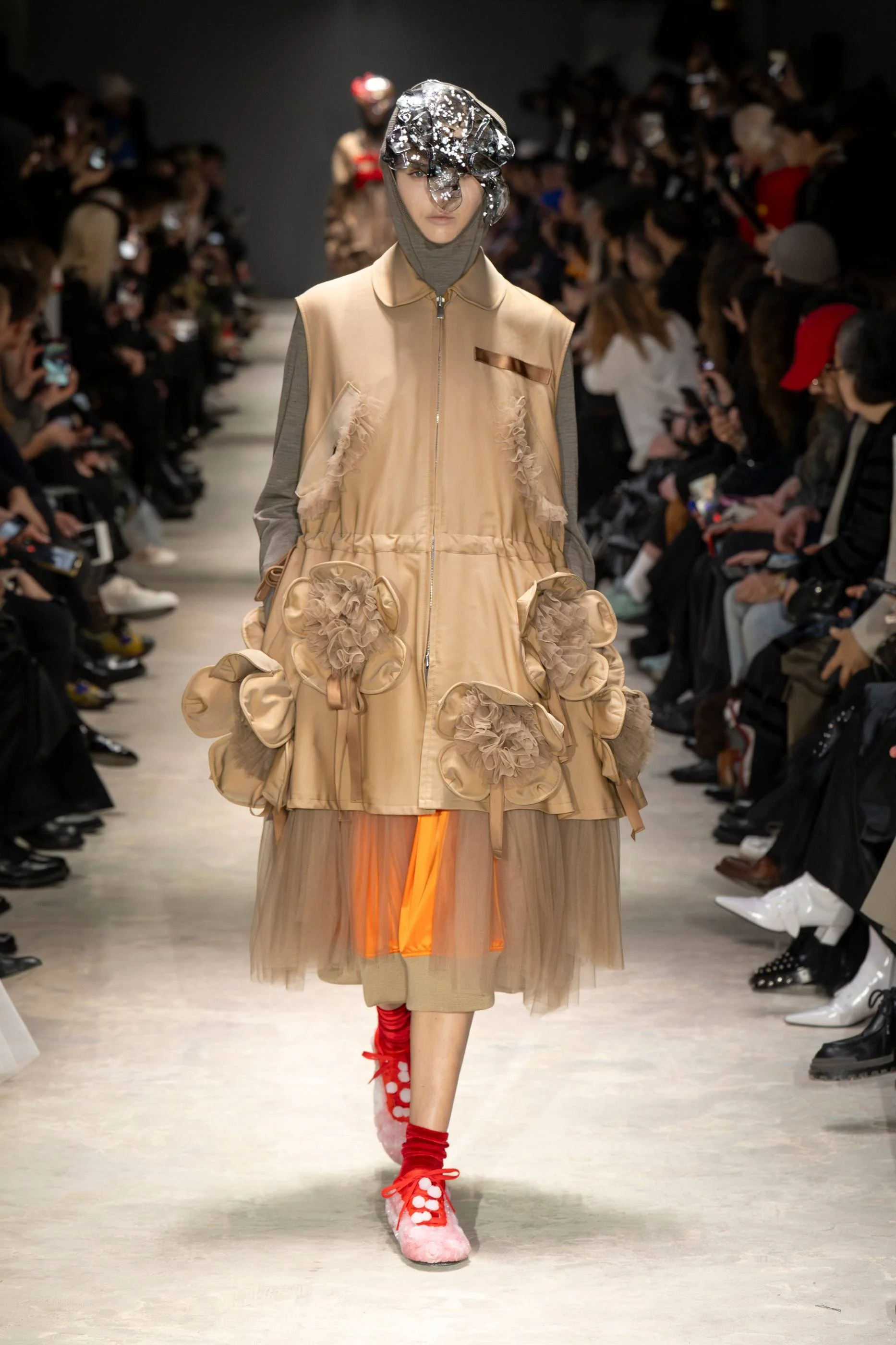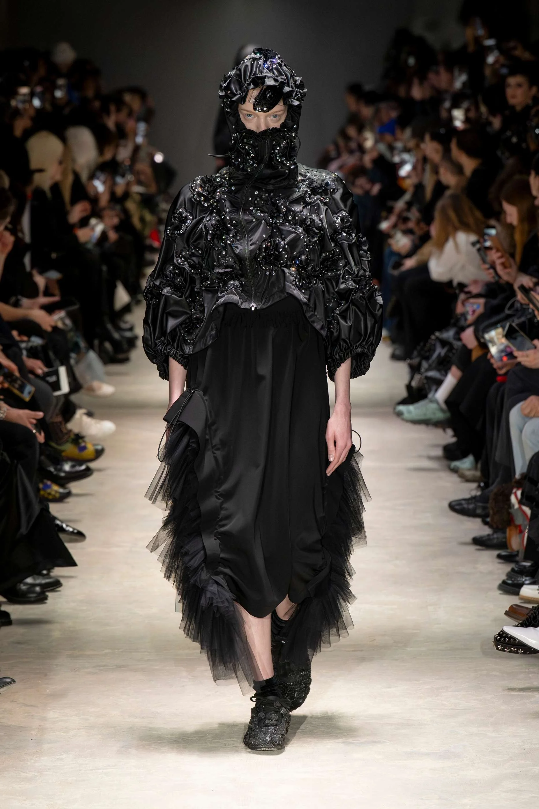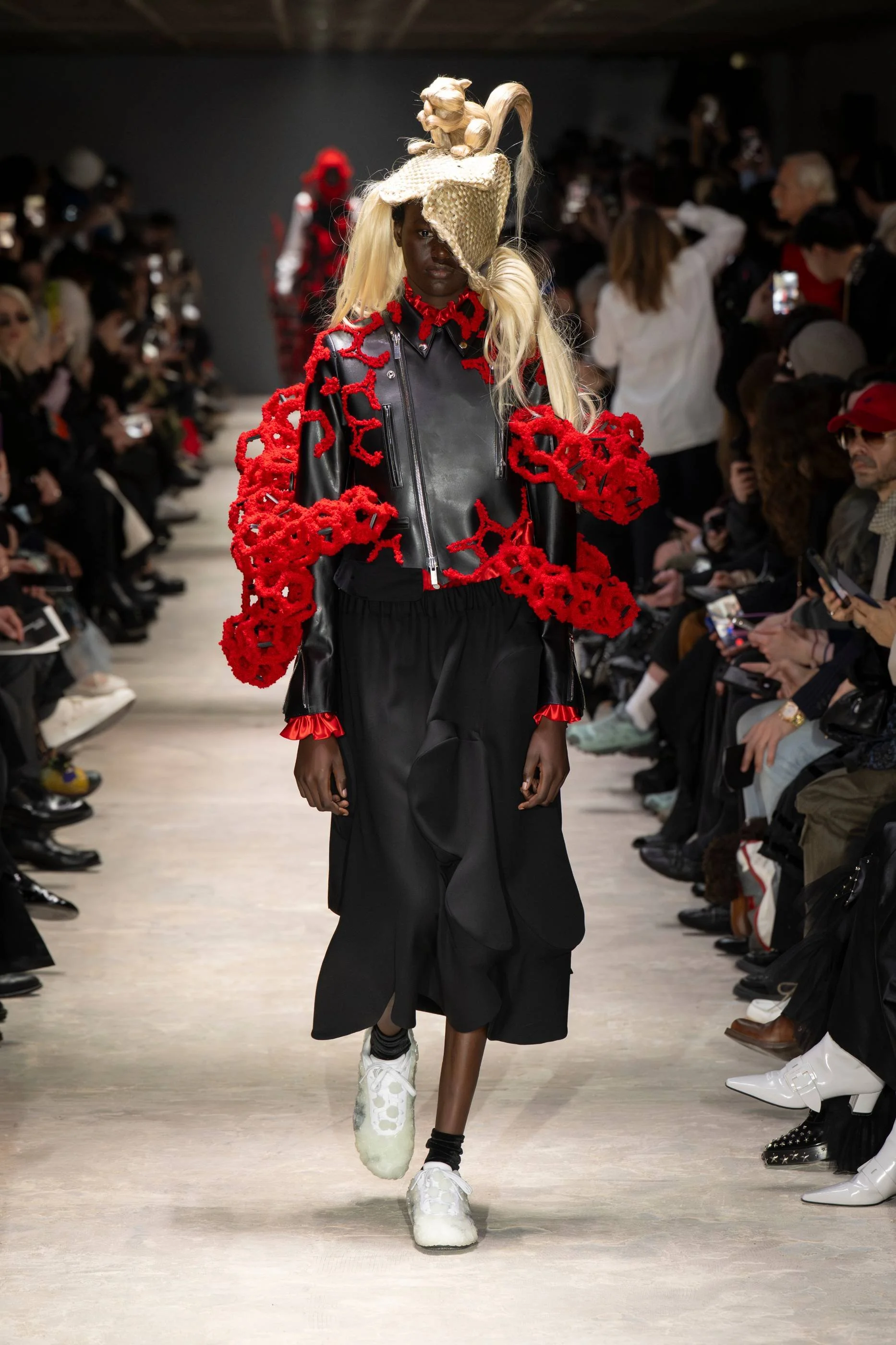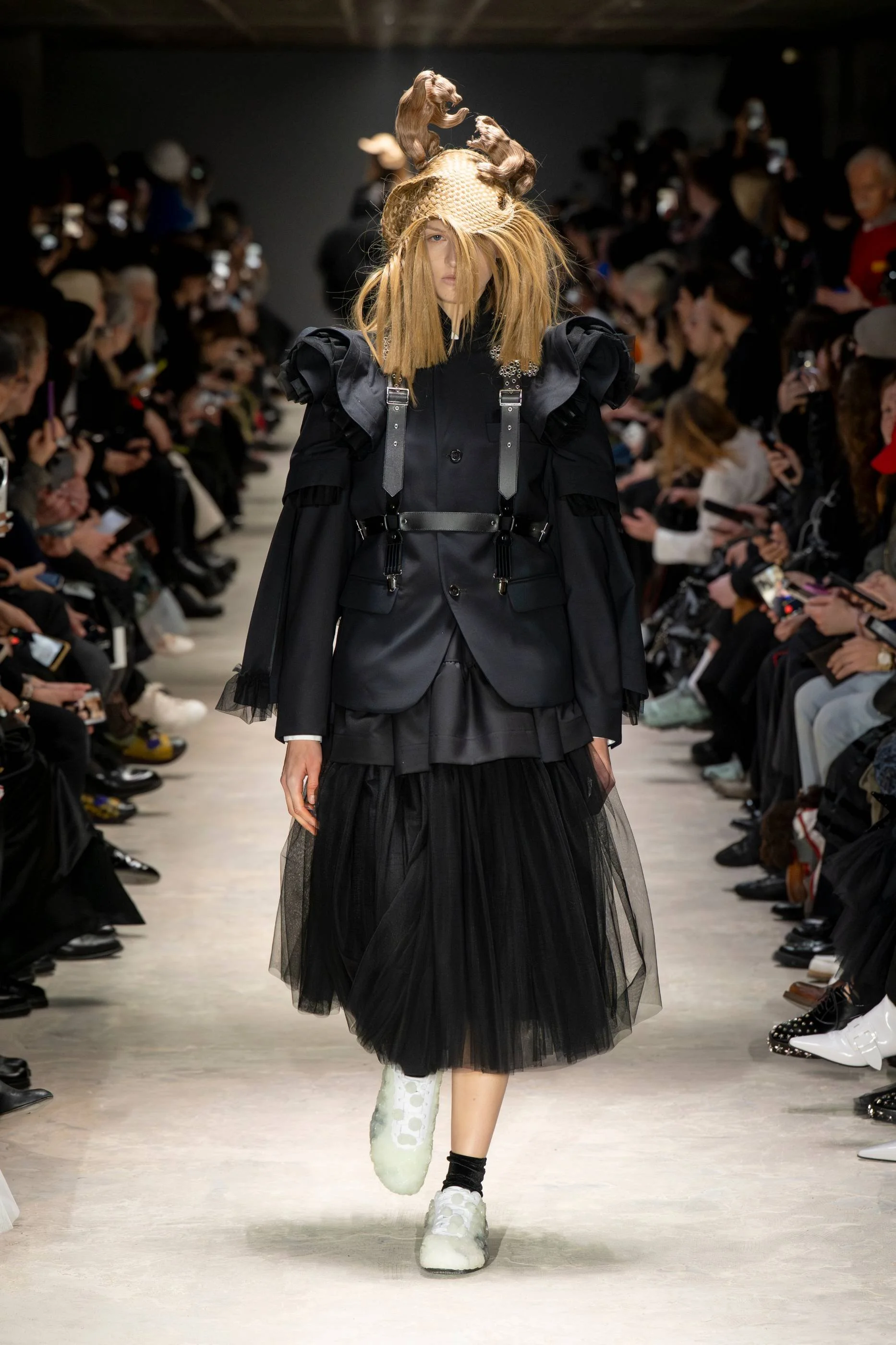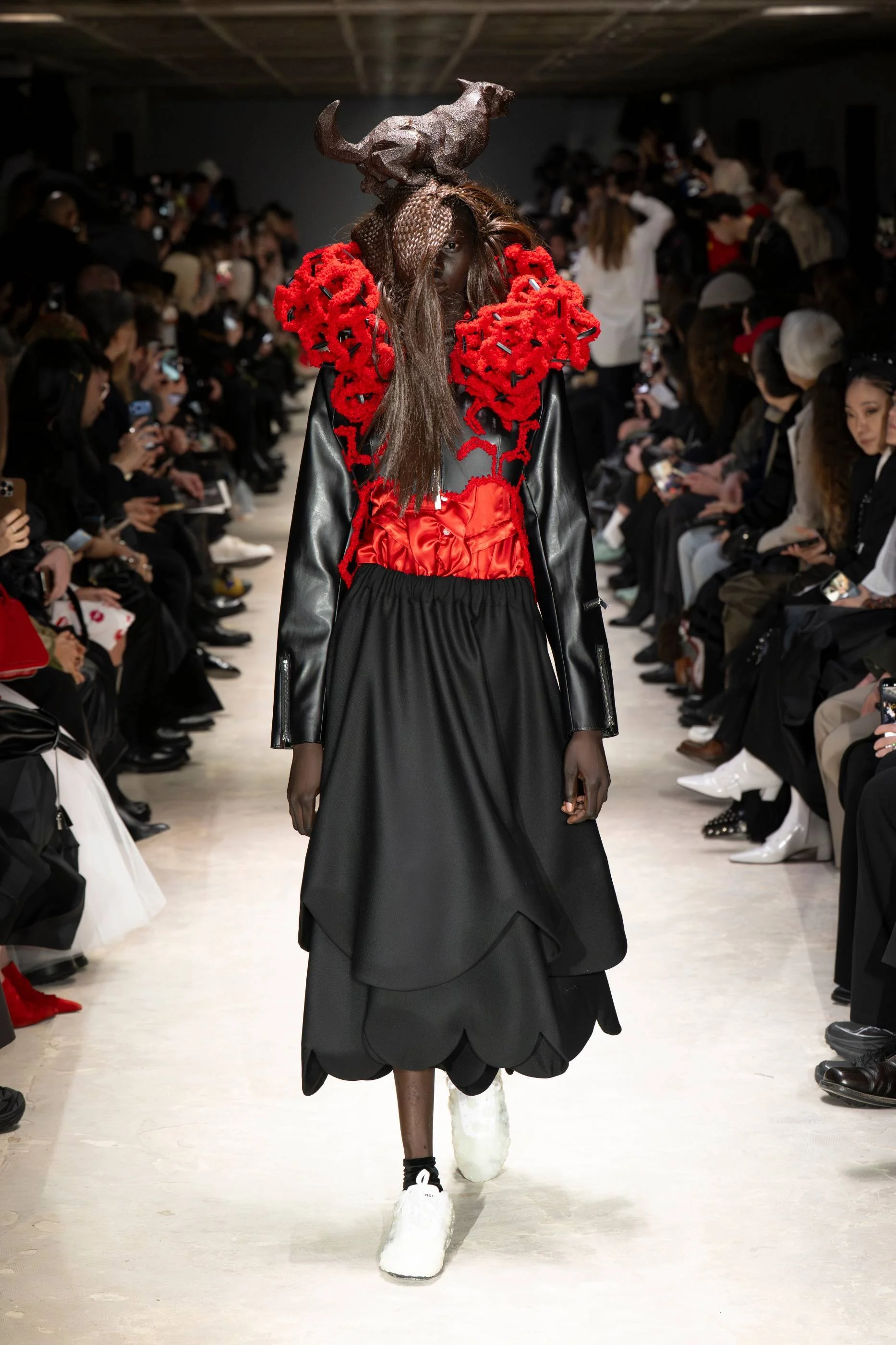 Flight jackets and MA-1 bomber jackets elongated into dresses and skirts, losing their martial character and taking a turn for the romantic when executed in blush tones, with matching tulle skirts. The palette's movement from black to crimson to blush traced the collection's emotional arc with the logic of a well-constructed argument. Even a ribcage worn as a plastron did nothing to diminish Ninomiya's considerable tailoring skills; beneath it sat a cropped tuxedo jacket, comprised mainly of lapels, shoulders, and sleeves, held immaculately in place by buttoned strips running down the back. The headpieces, produced by Shinji Konishi and featuring angry animals in poses so exaggerated they read as meme-worthy, supplied the show's final, deliberate tonal note. The gothic vocabulary was entirely present, but the atmosphere it generated was closer to theatrical teenage angst than genuine despair. Heavy in the moment, and capable of lifting. A collaboration with PUMA produced a reworked Speedcat with a translucent 3D floral shell in black, crimson, and blush. The sneaker extended the collection's argument onto the feet with commitment and a certain wit.