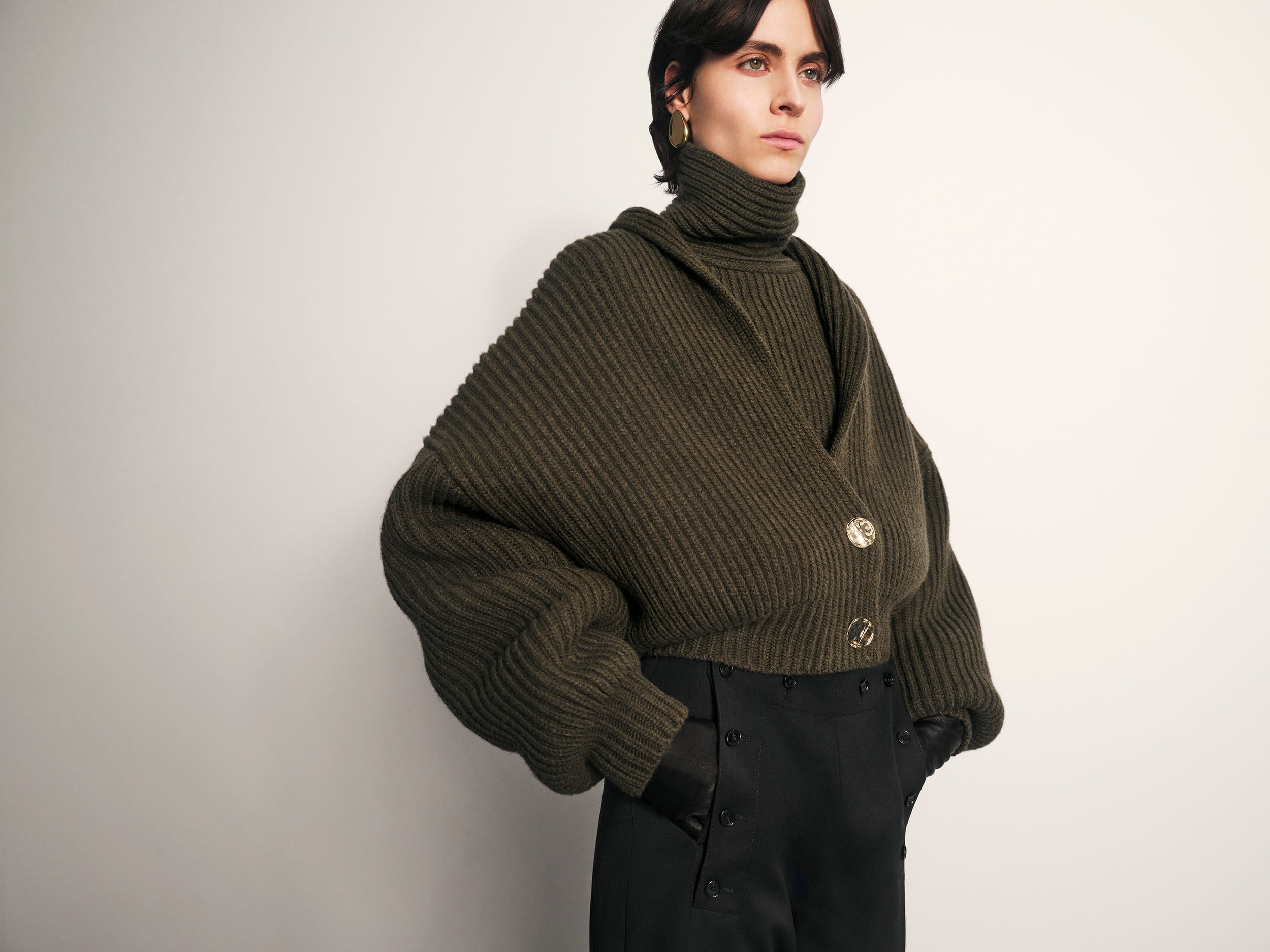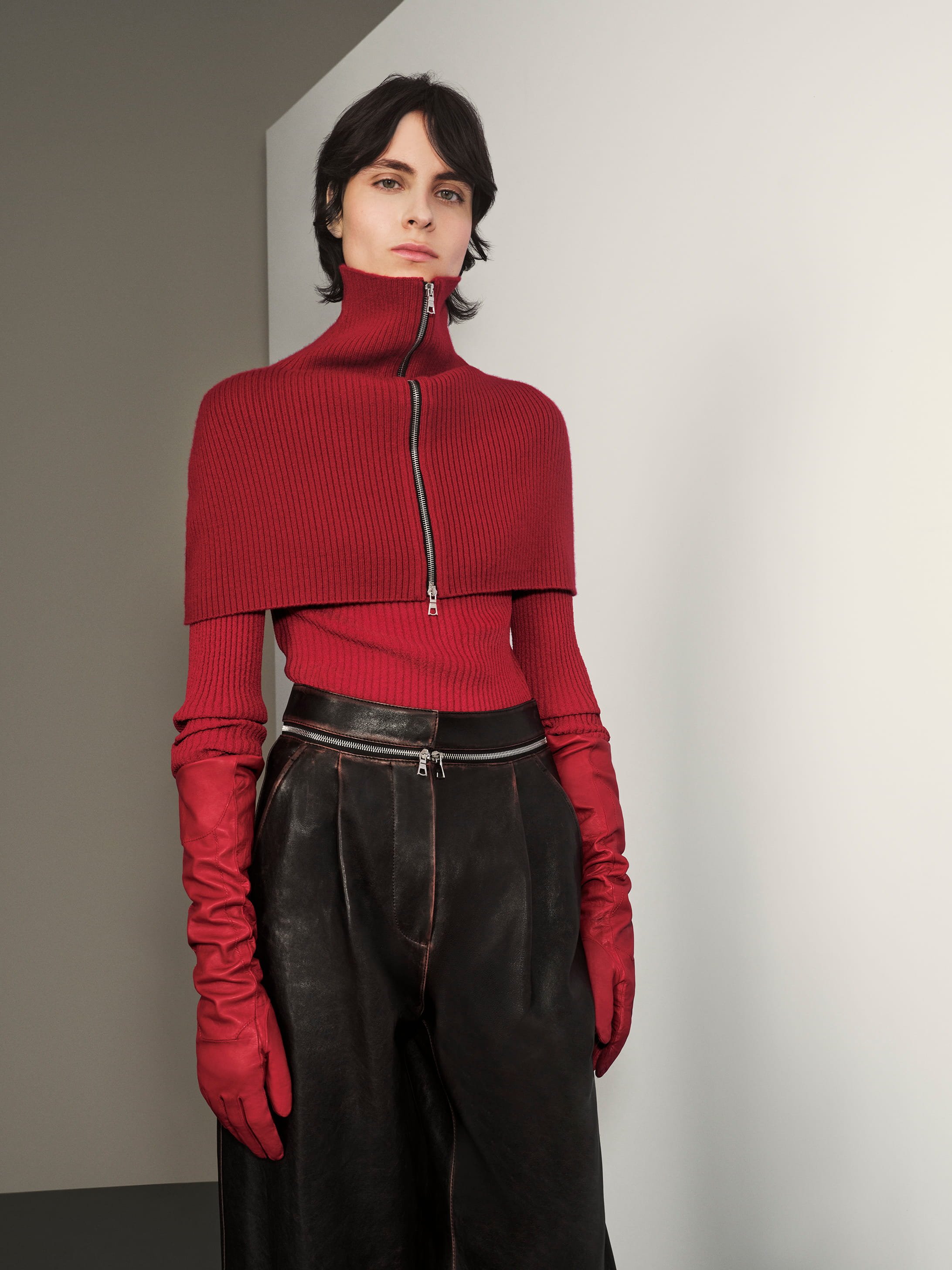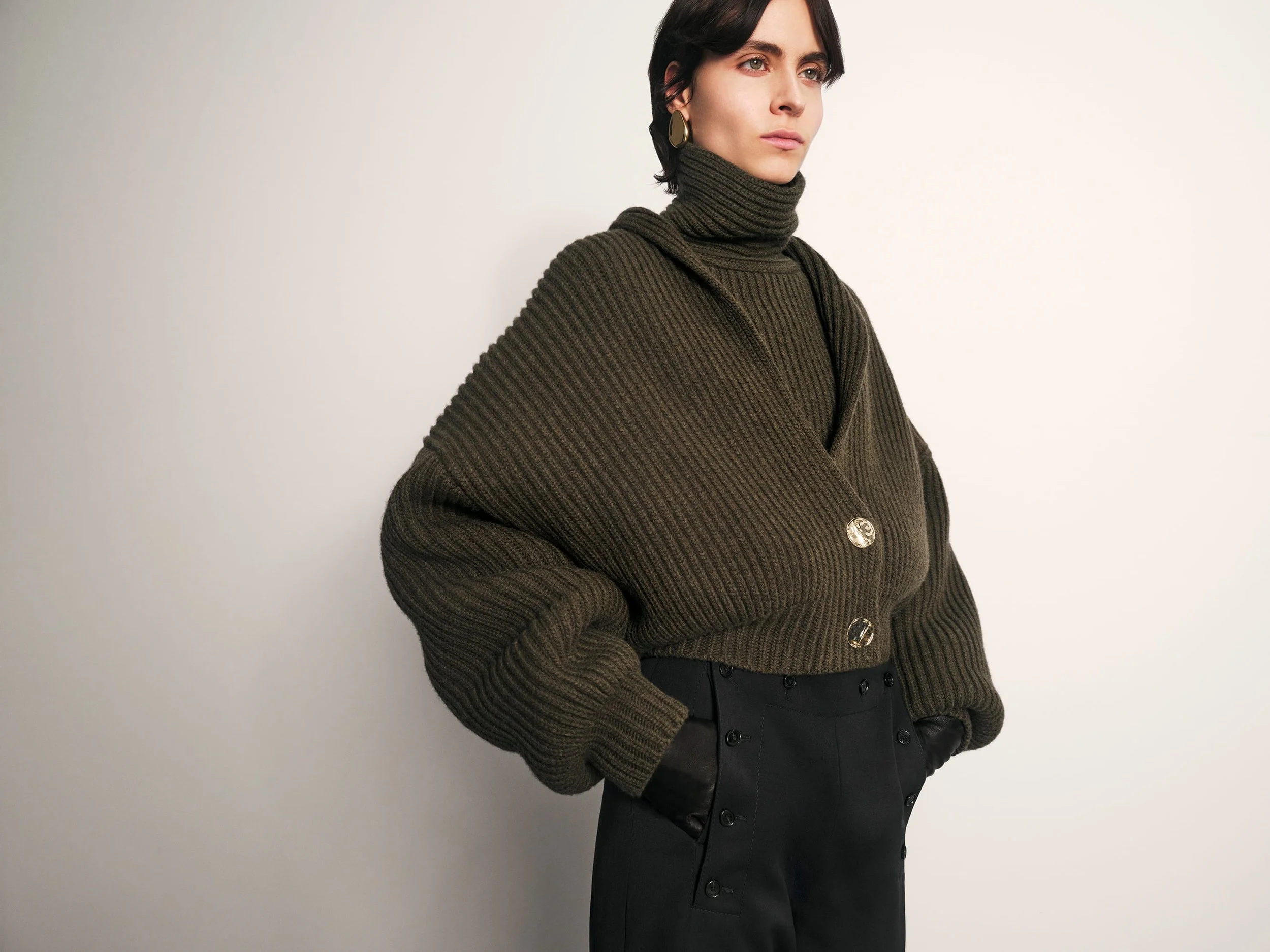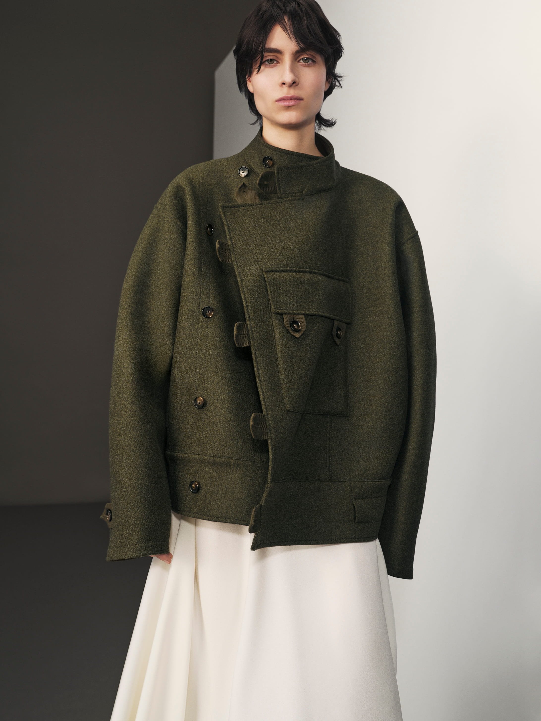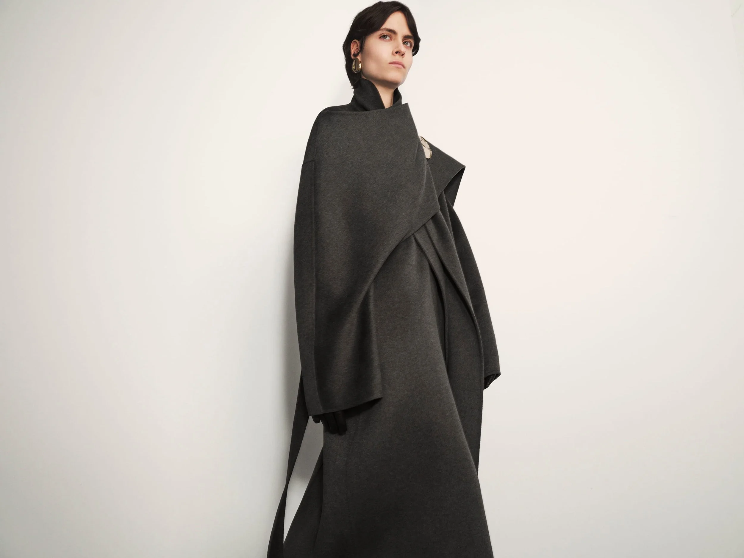 A restrained palette of black, navy, charcoal, ivory, and camel is punctuated by military green, pink, red, and brown. Knotted details appear throughout as sculptural closures and draped elements, while prints inspired by Louise Bourgeois and Sonia Delaunay evoke maps and movement. Presented at Fondazione Sozzani in Milan, the collection reflects a woman navigating the world with elegance and confidence.