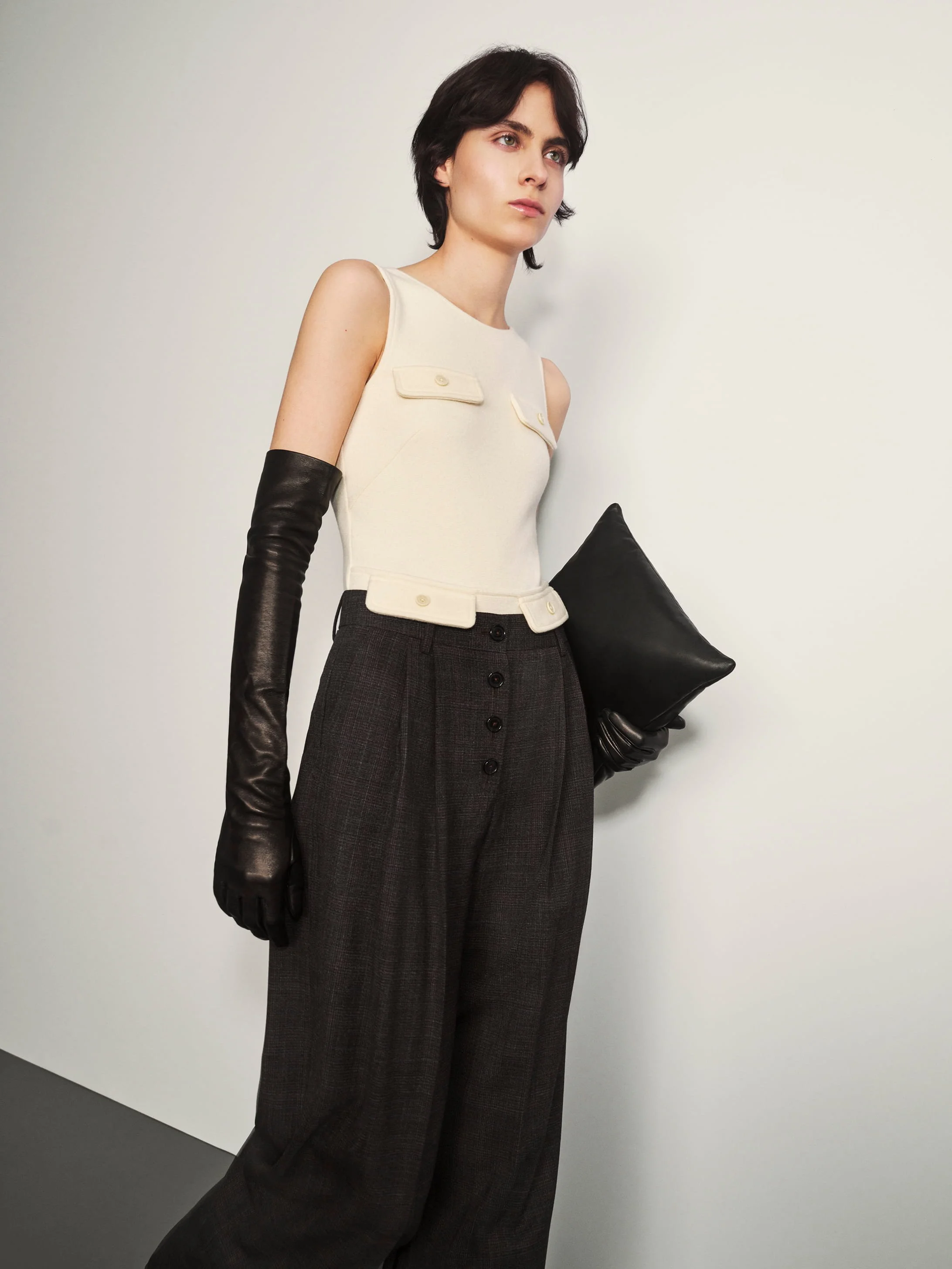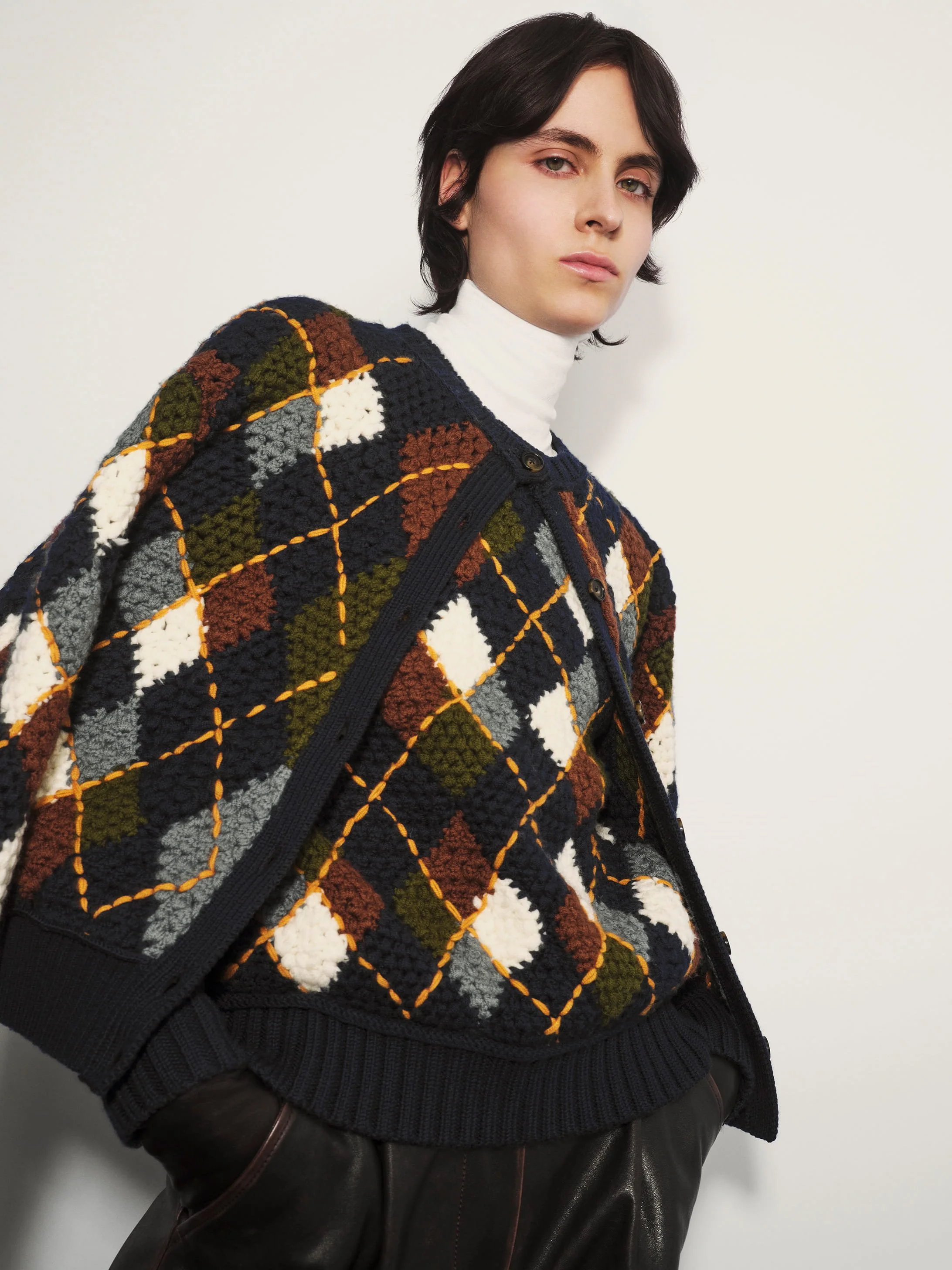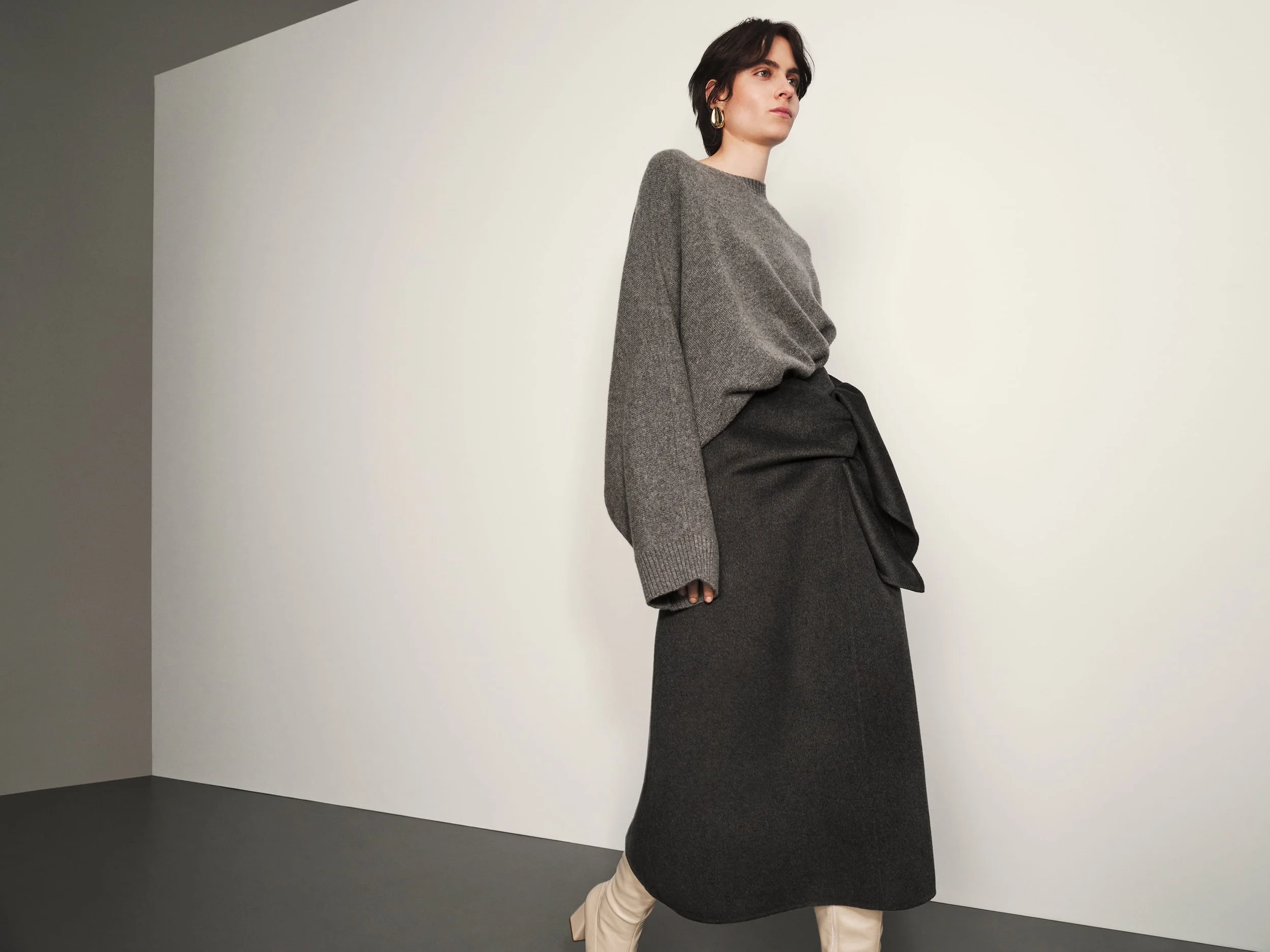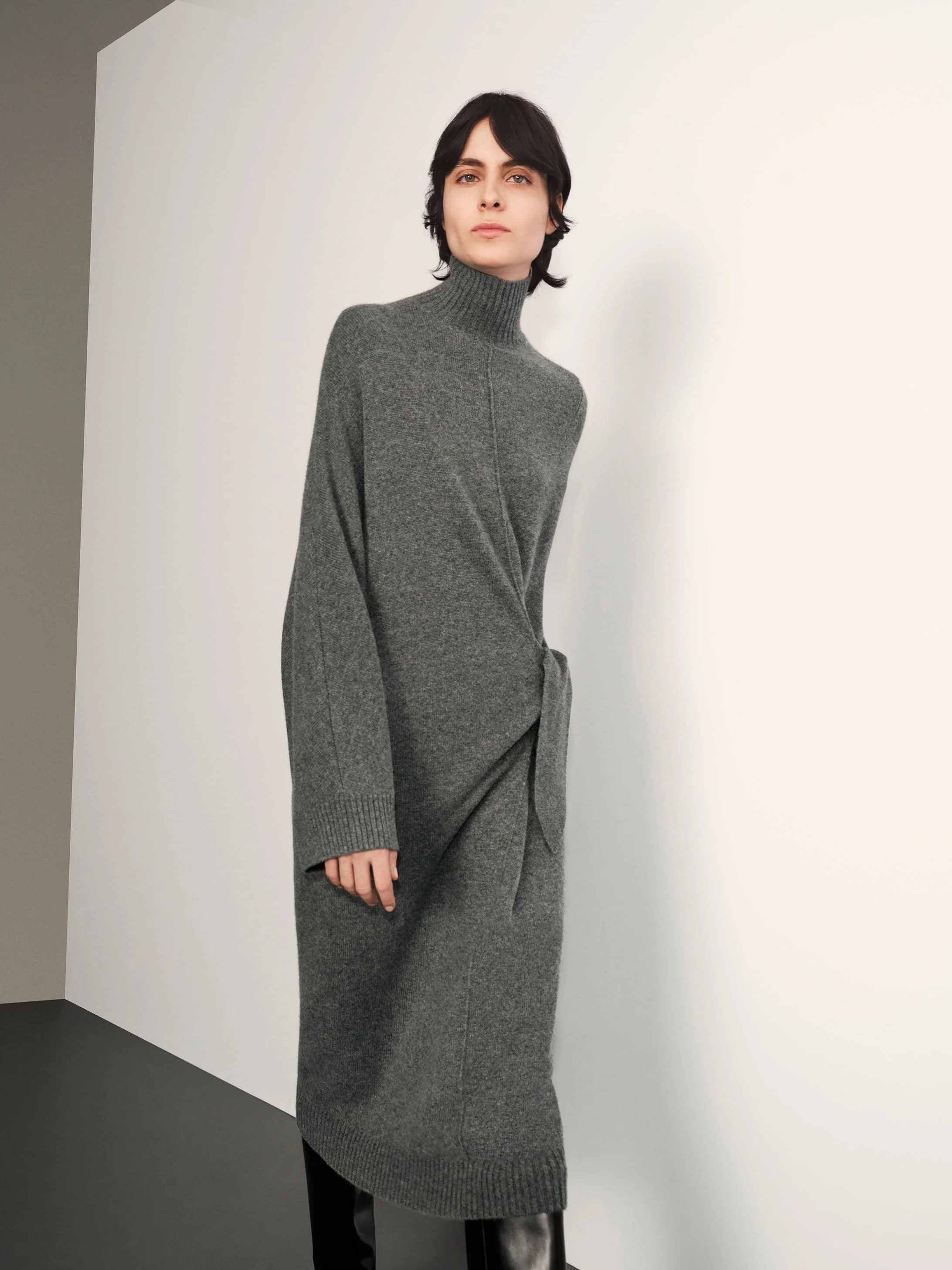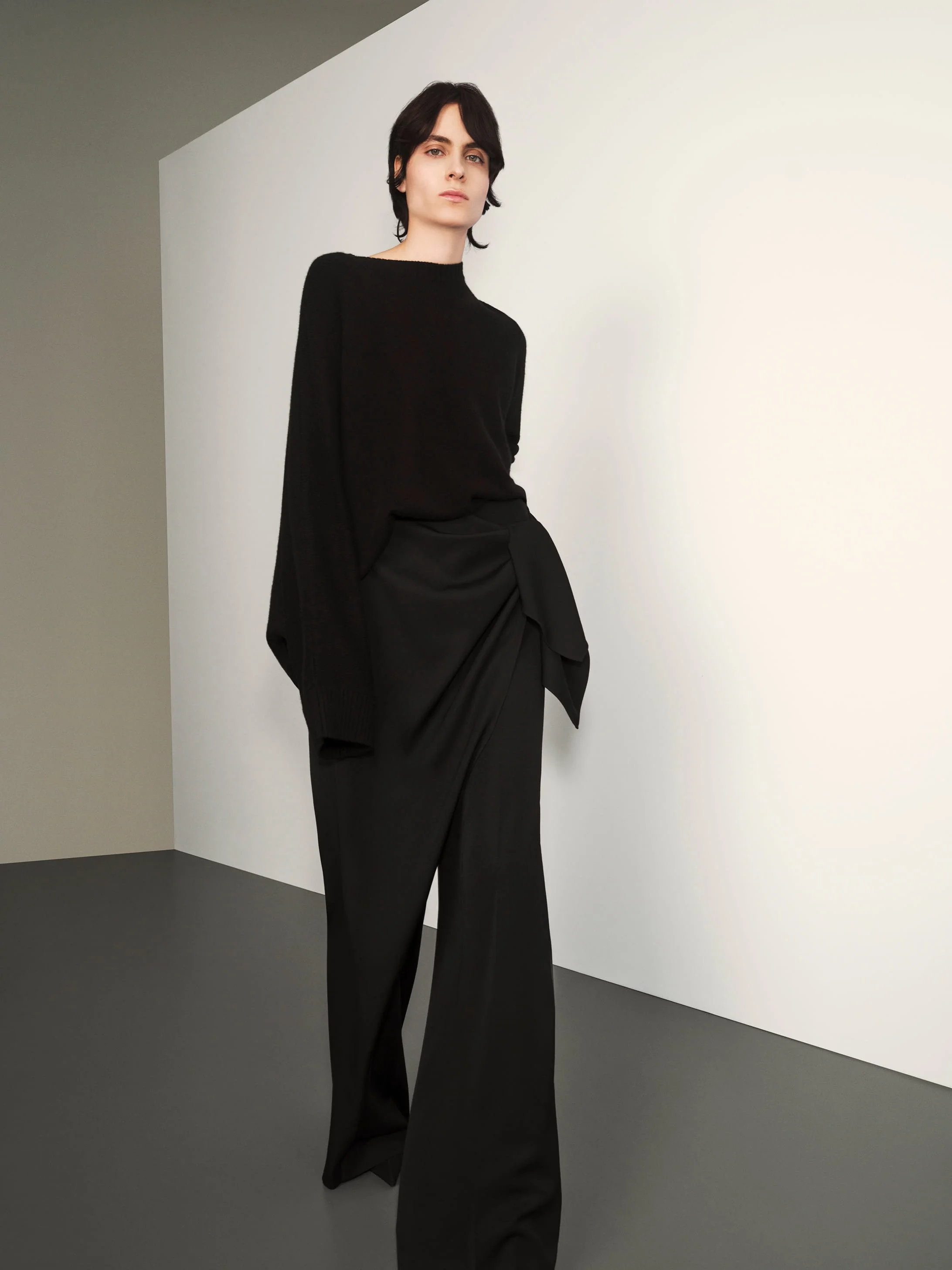 A restrained palette of black, navy, charcoal, ivory, and camel is punctuated by military green, pink, red, and brown. Knotted details appear throughout as sculptural closures and draped elements, while prints inspired by Louise Bourgeois and Sonia Delaunay evoke maps and movement. Presented at Fondazione Sozzani in Milan, the collection reflects a woman navigating the world with elegance and confidence.