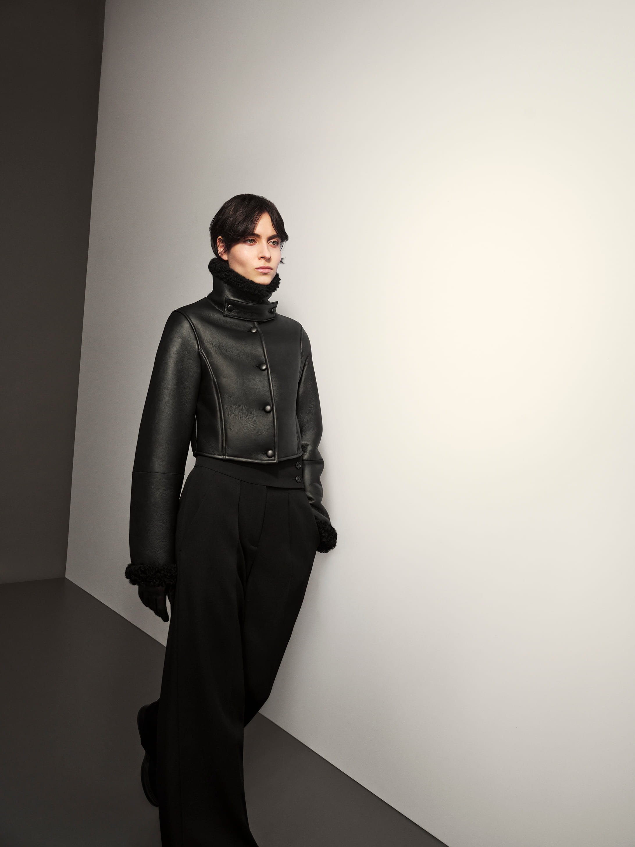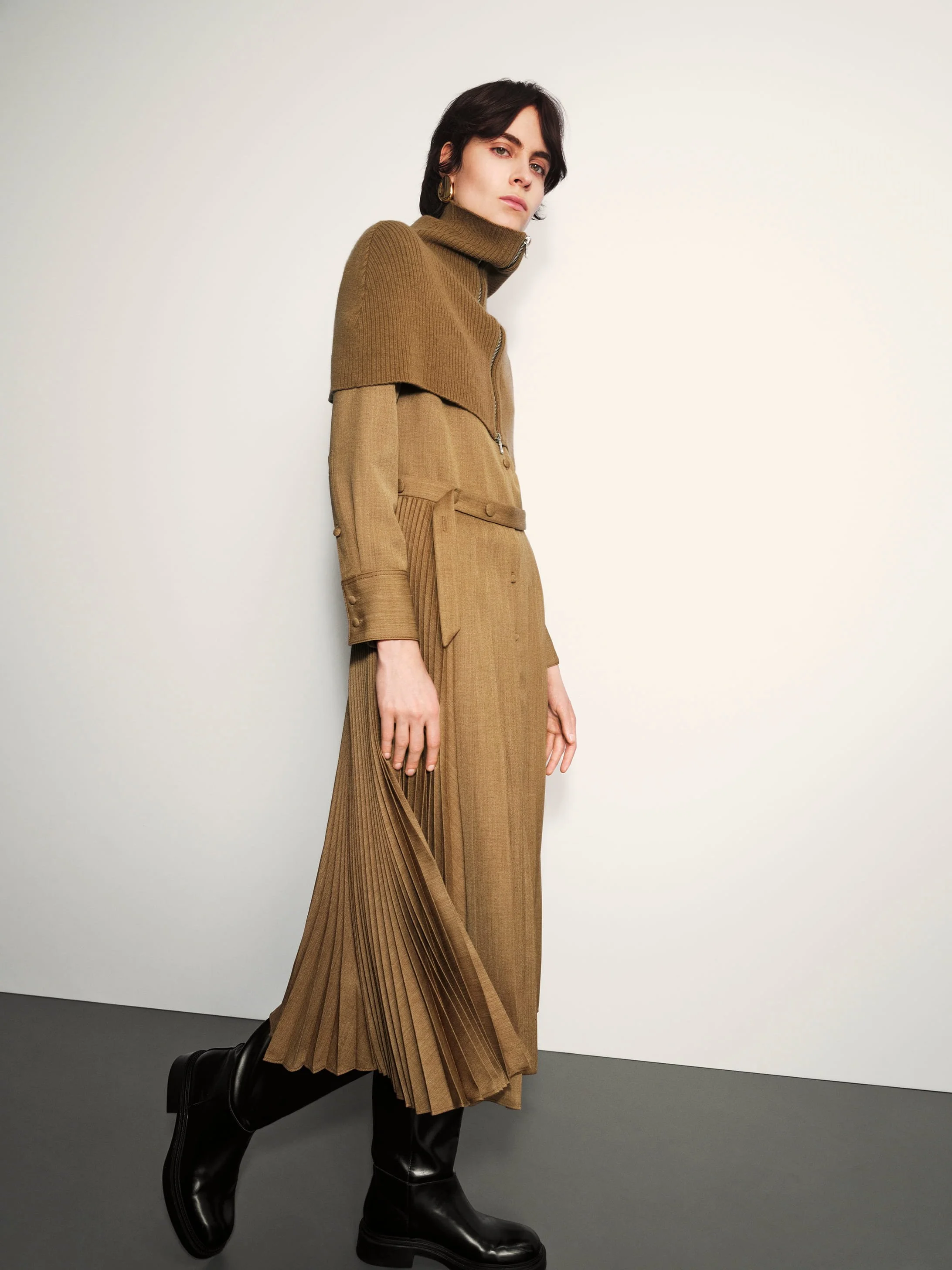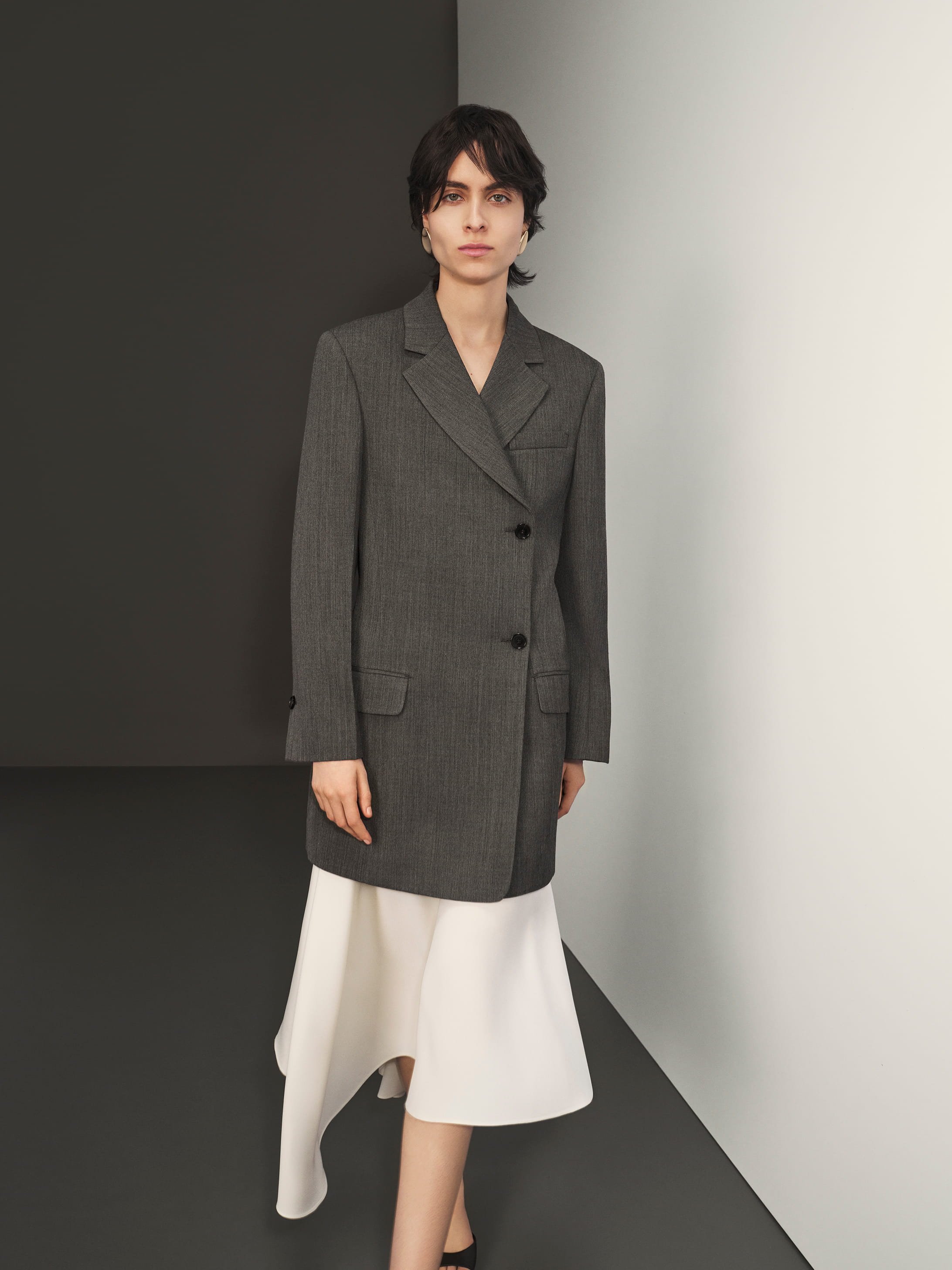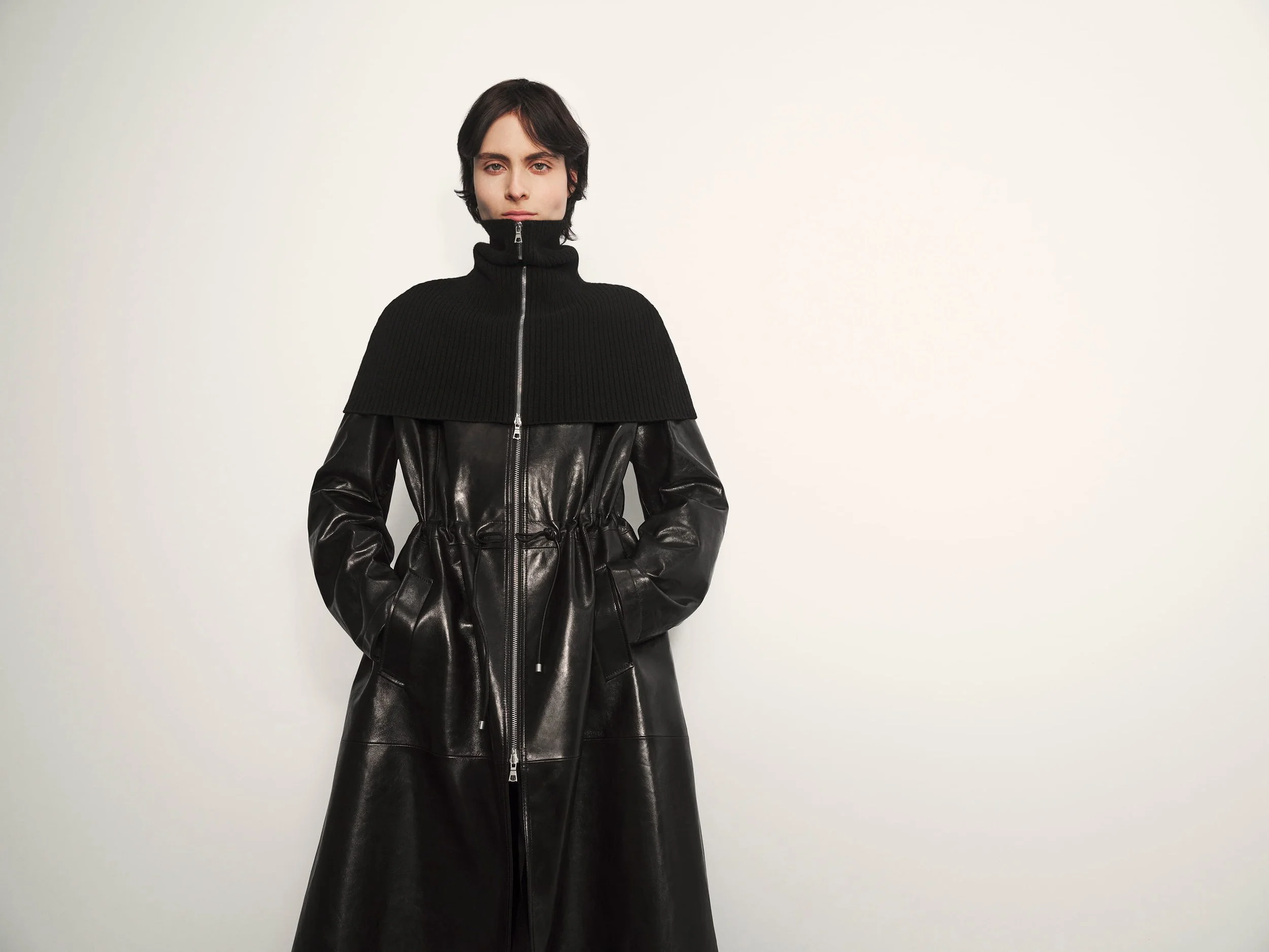 Structured outerwear forms the backbone of the season. Trench coats, tailored blazers, and overcoats in poplin, wool, and technical blends balance precision with ease. Cropped jackets with subtle nautical accents sit alongside wide trousers, pleated skirts, and relaxed draped dresses, creating silhouettes that move naturally with the body. Ribbed knitwear and lace inserts soften the collection’s architectural lines.