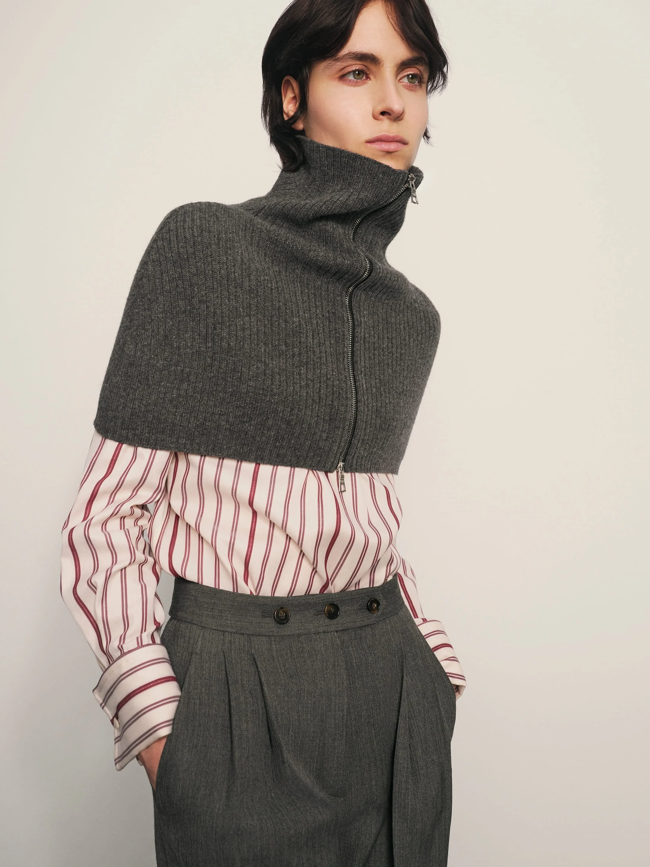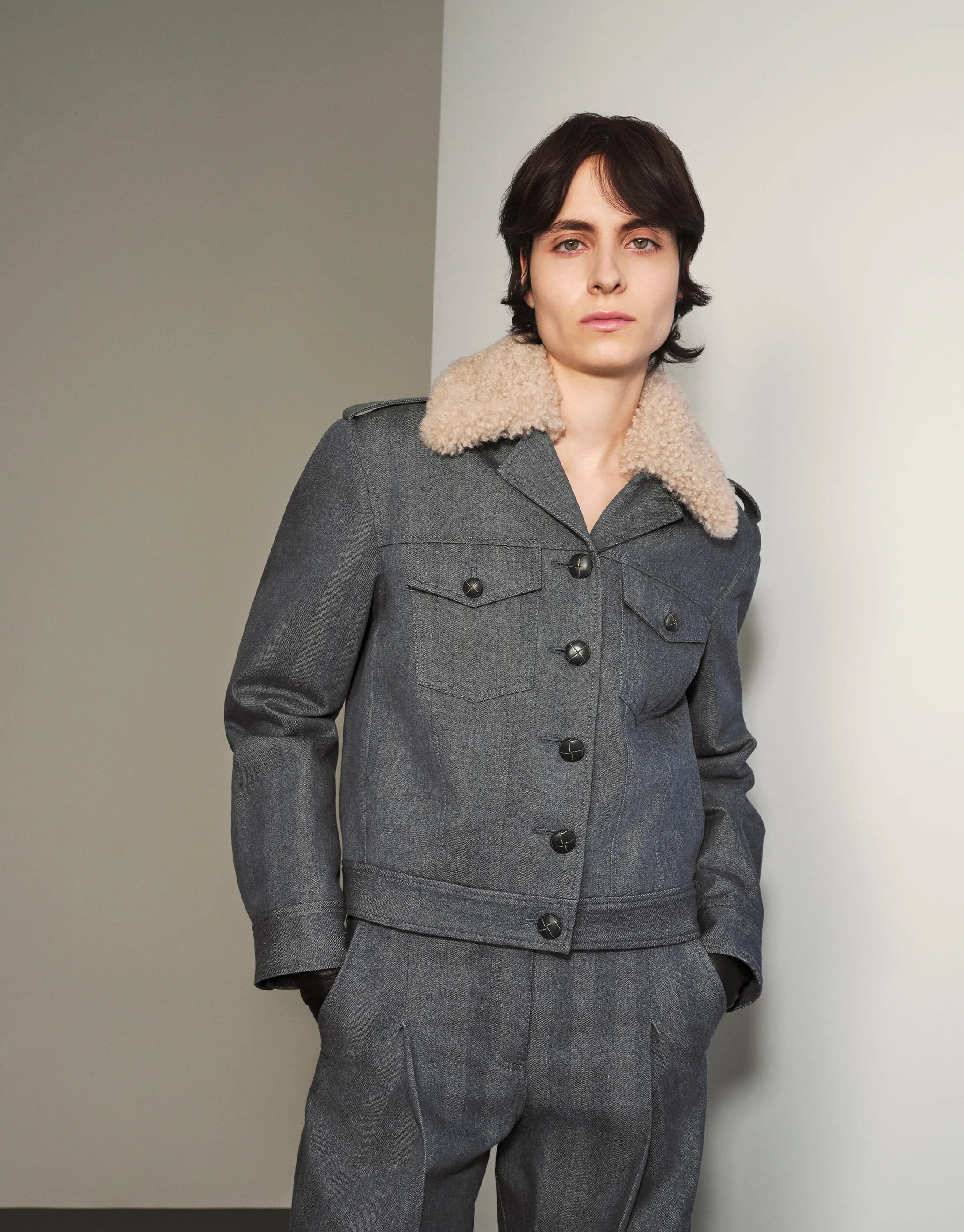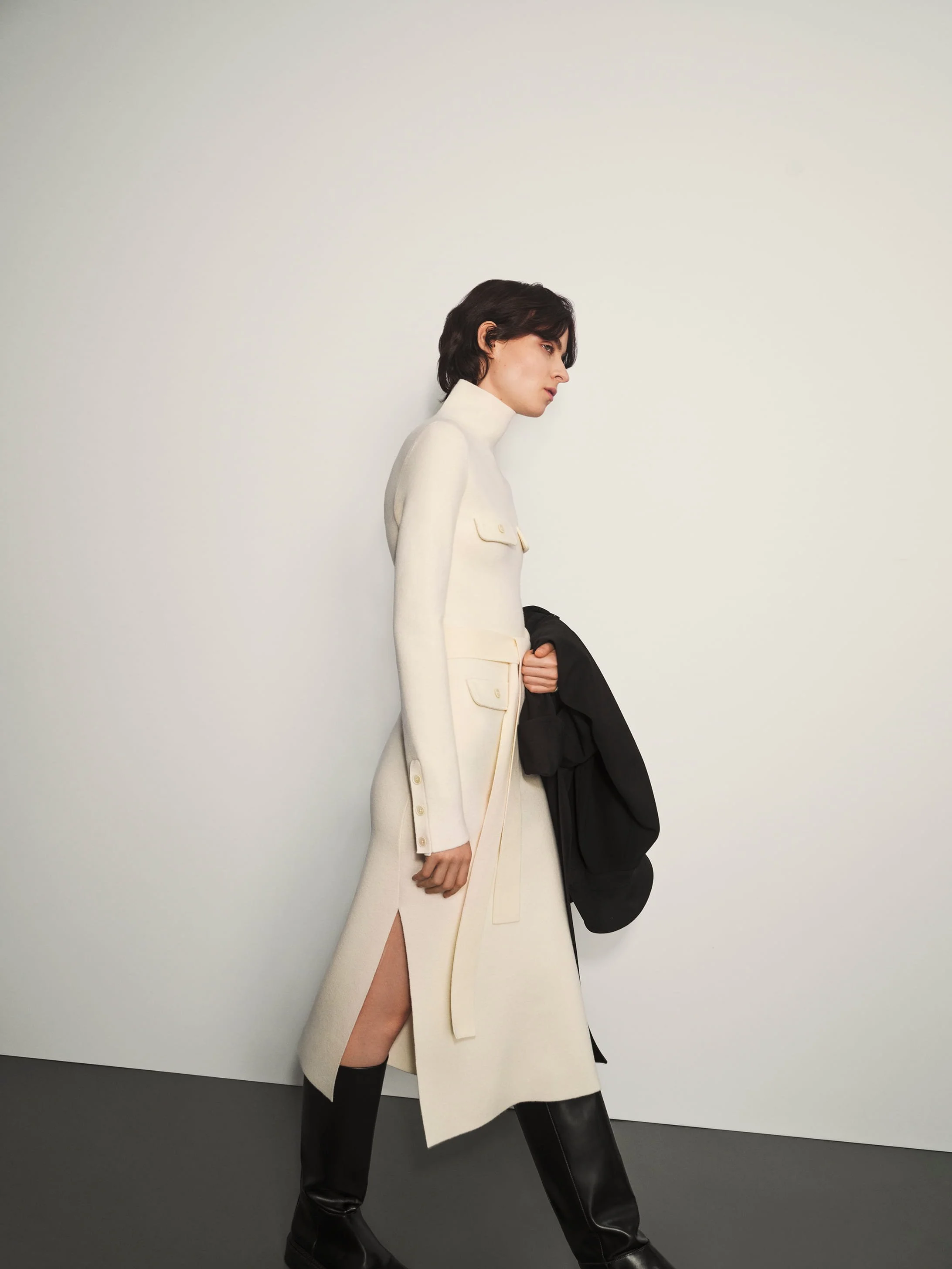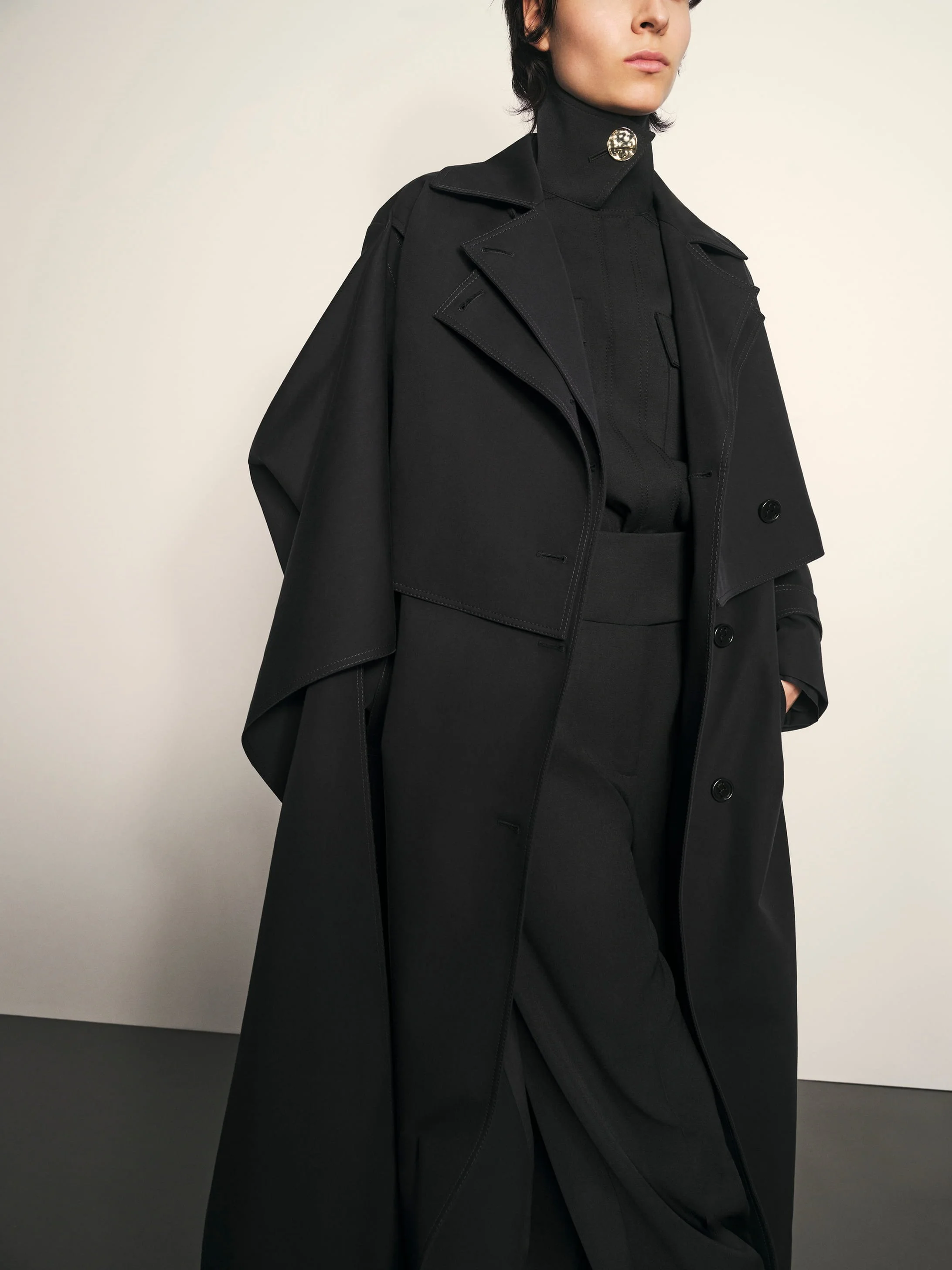 Structured outerwear forms the backbone of the season. Trench coats, tailored blazers, and overcoats in poplin, wool, and technical blends balance precision with ease. Cropped jackets with subtle nautical accents sit alongside wide trousers, pleated skirts, and relaxed draped dresses, creating silhouettes that move naturally with the body. Ribbed knitwear and lace inserts soften the collection’s architectural lines.