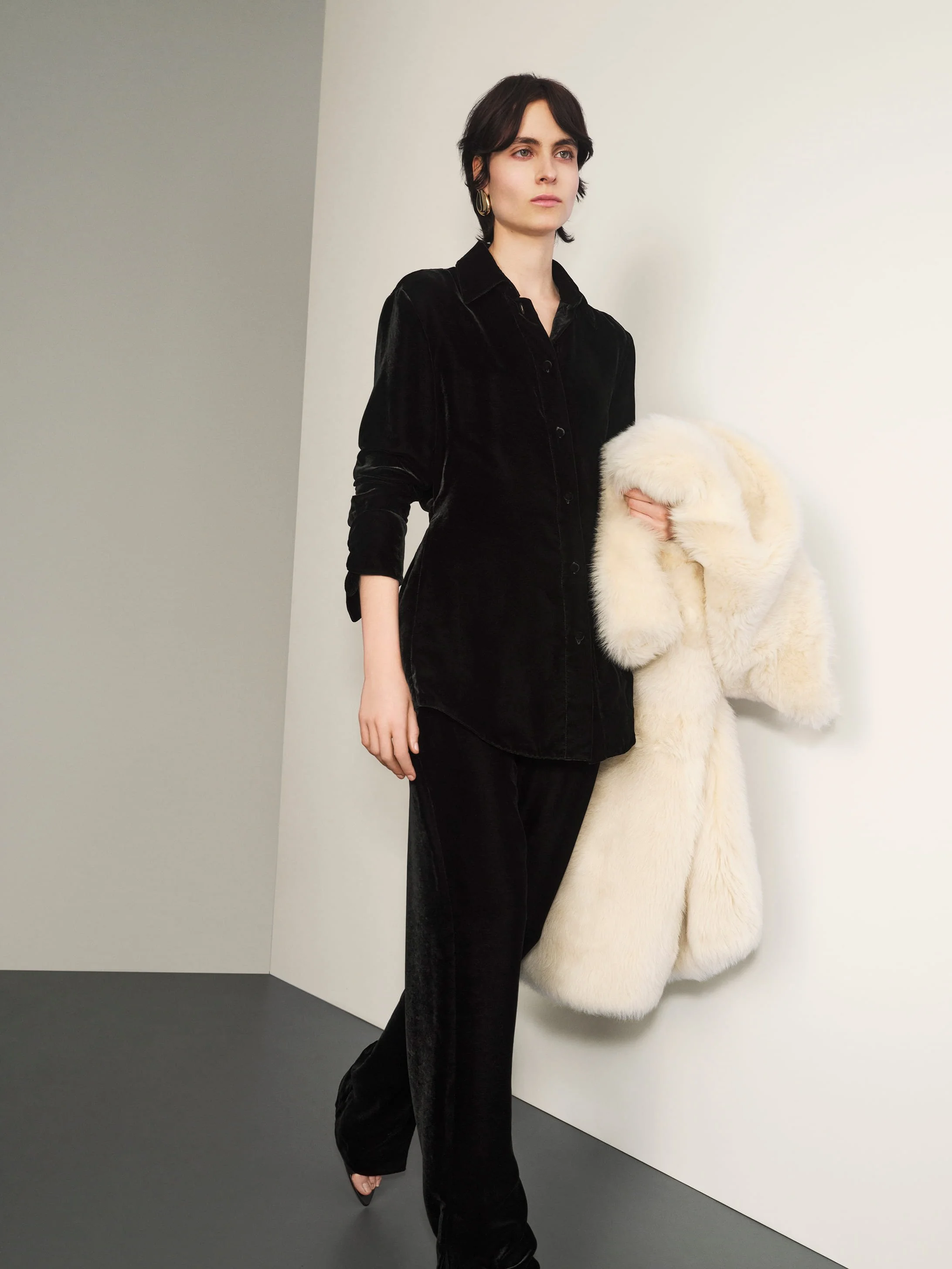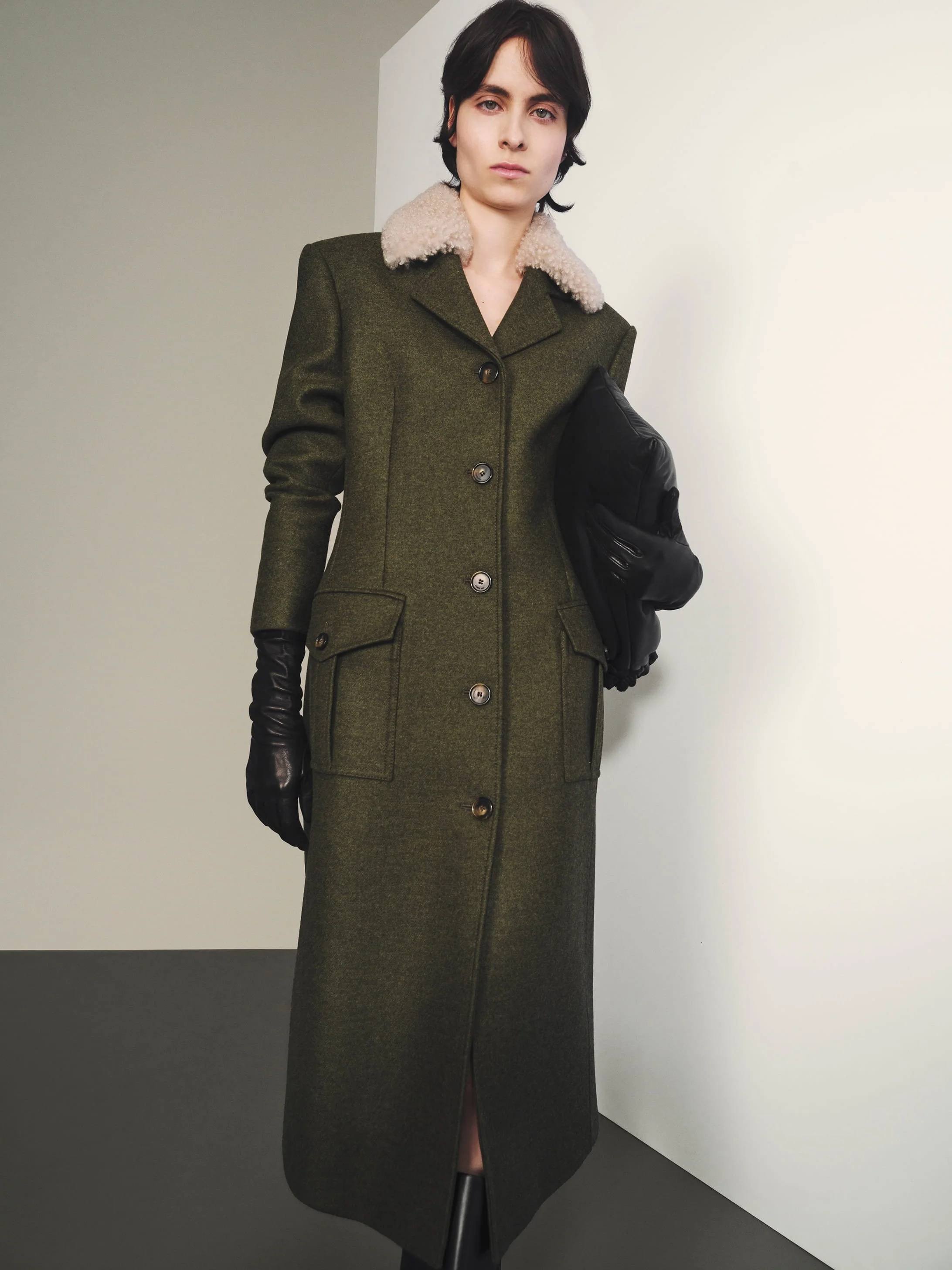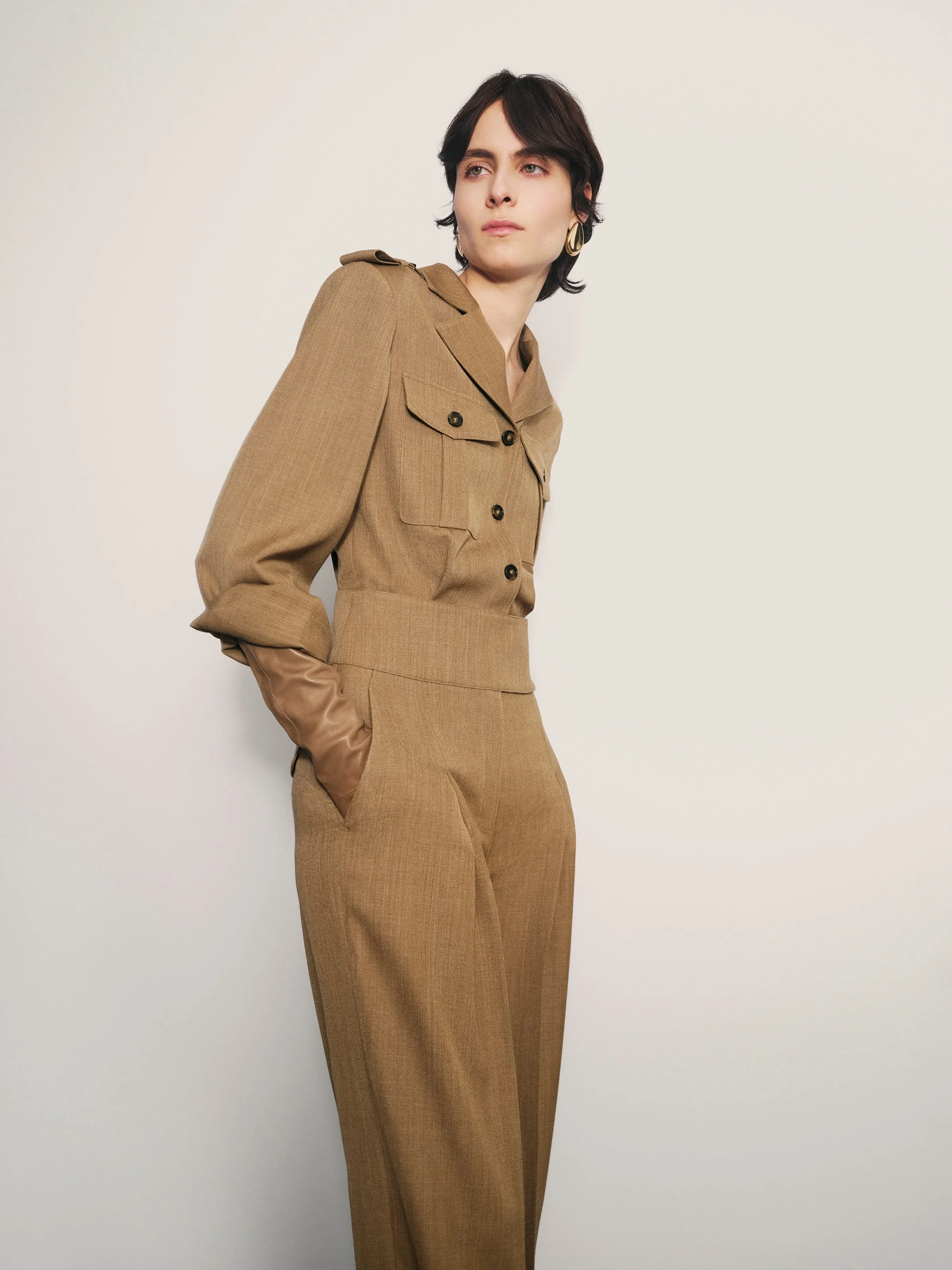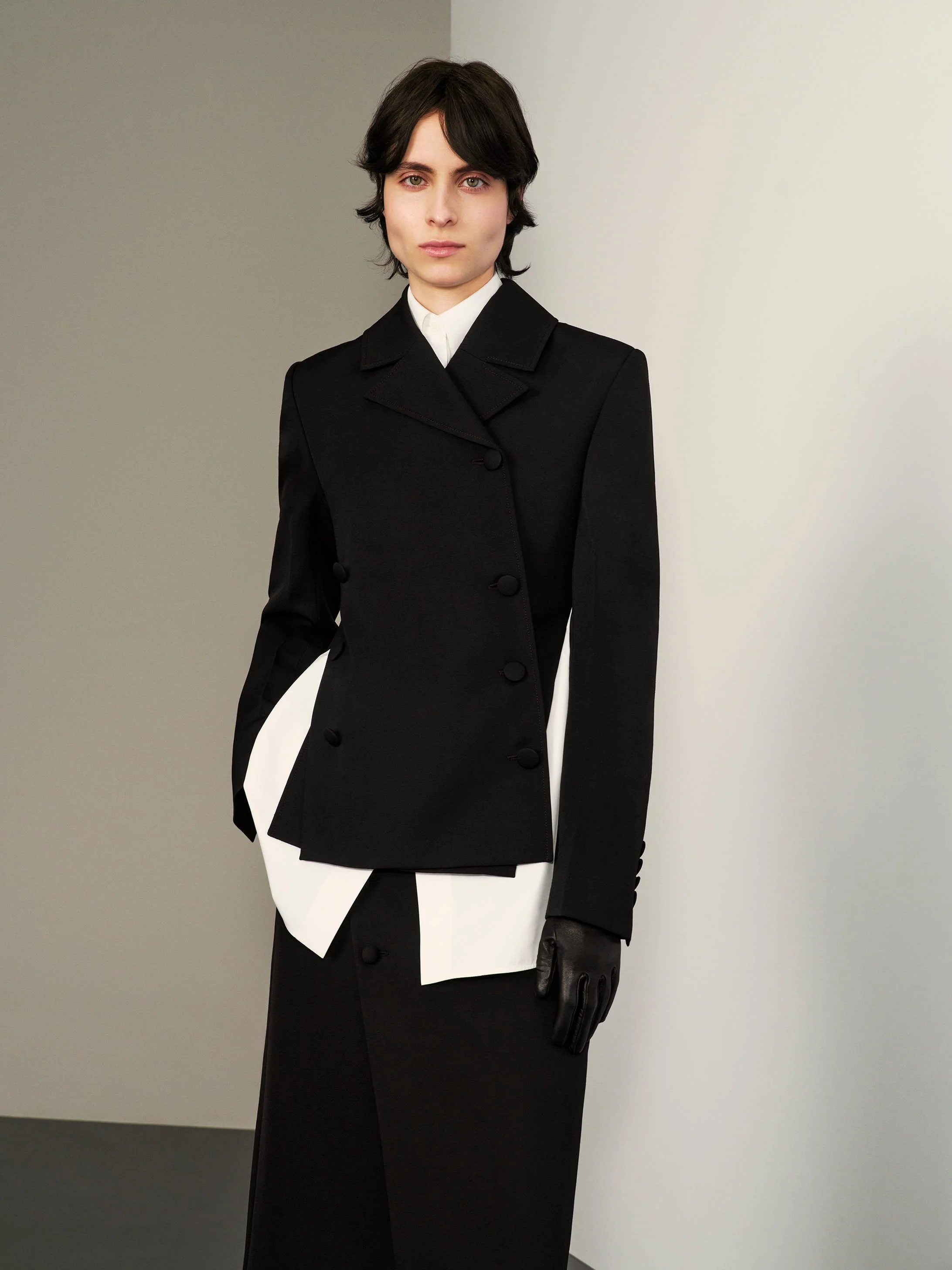 Structured outerwear forms the backbone of the season. Trench coats, tailored blazers, and overcoats in poplin, wool, and technical blends balance precision with ease. Cropped jackets with subtle nautical accents sit alongside wide trousers, pleated skirts, and relaxed draped dresses, creating silhouettes that move naturally with the body. Ribbed knitwear and lace inserts soften the collection’s architectural lines.