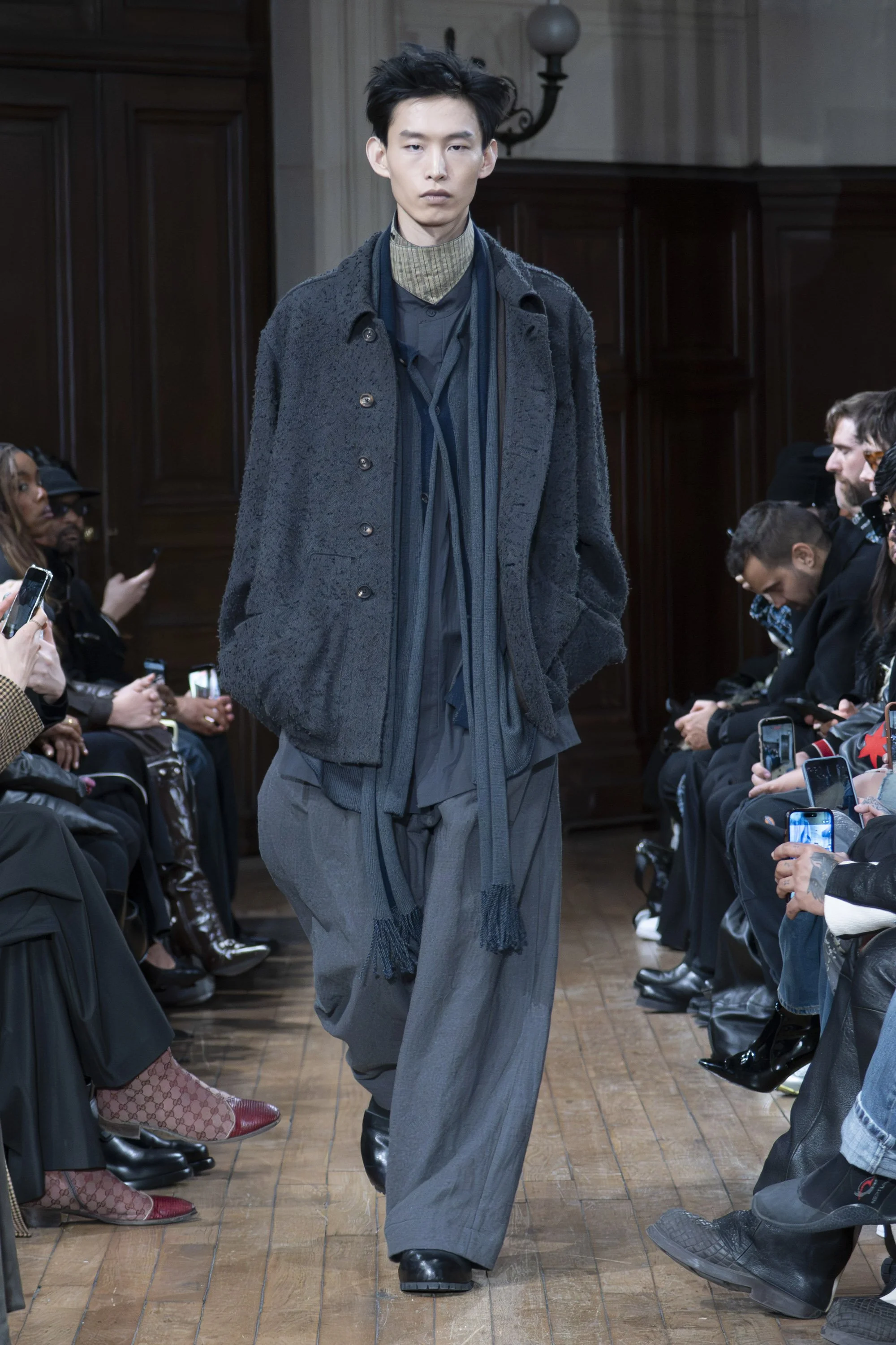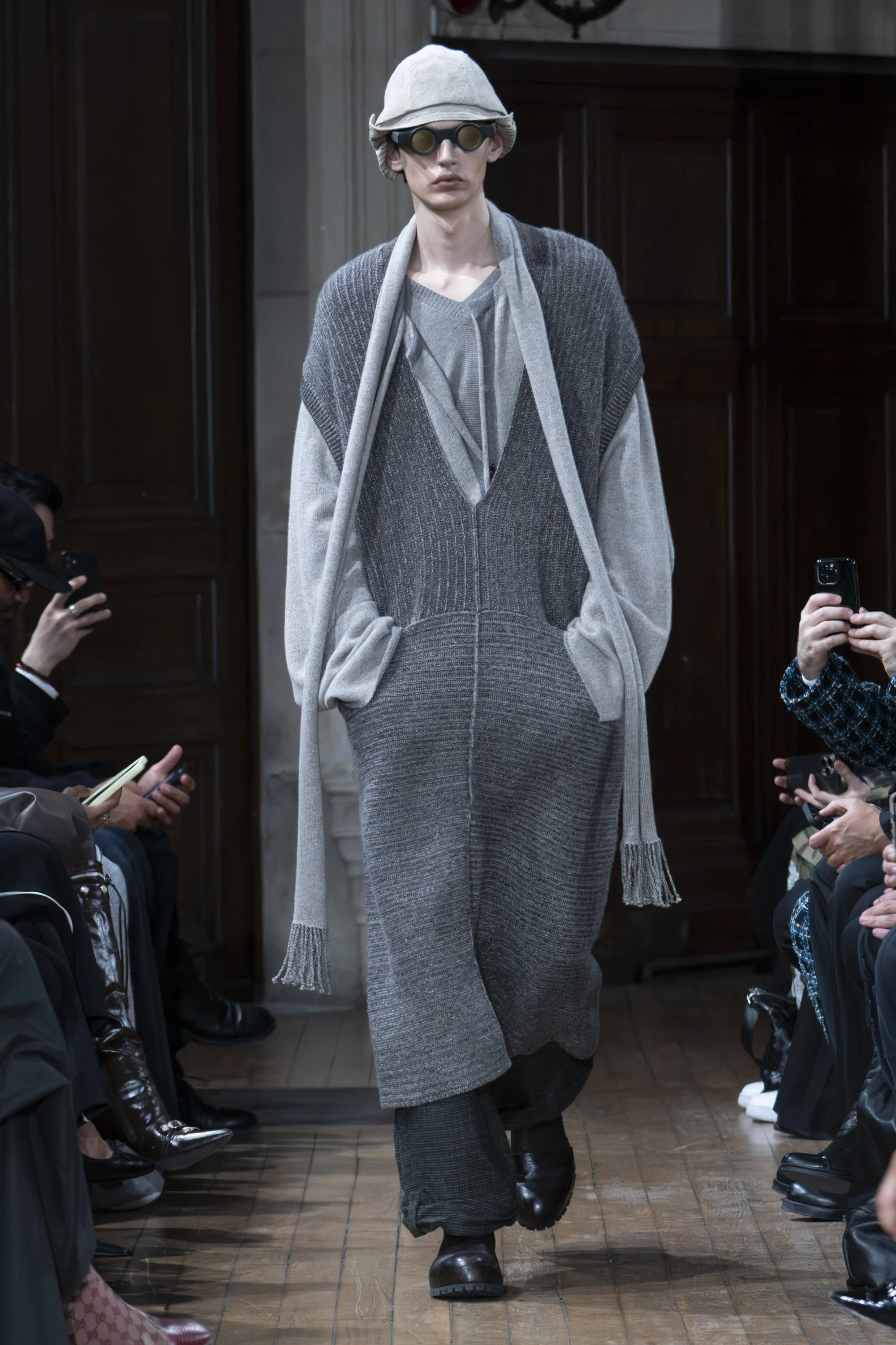 The color palette remains measured: warm browns, softened greys, deep blue-greys, black, and muted yellow tones. Layering adds depth without weight, supported by wool, cashmere, hemp, linen, and silk. Irregular yarns and bouclé retain traces of process, allowing imperfection to remain present.