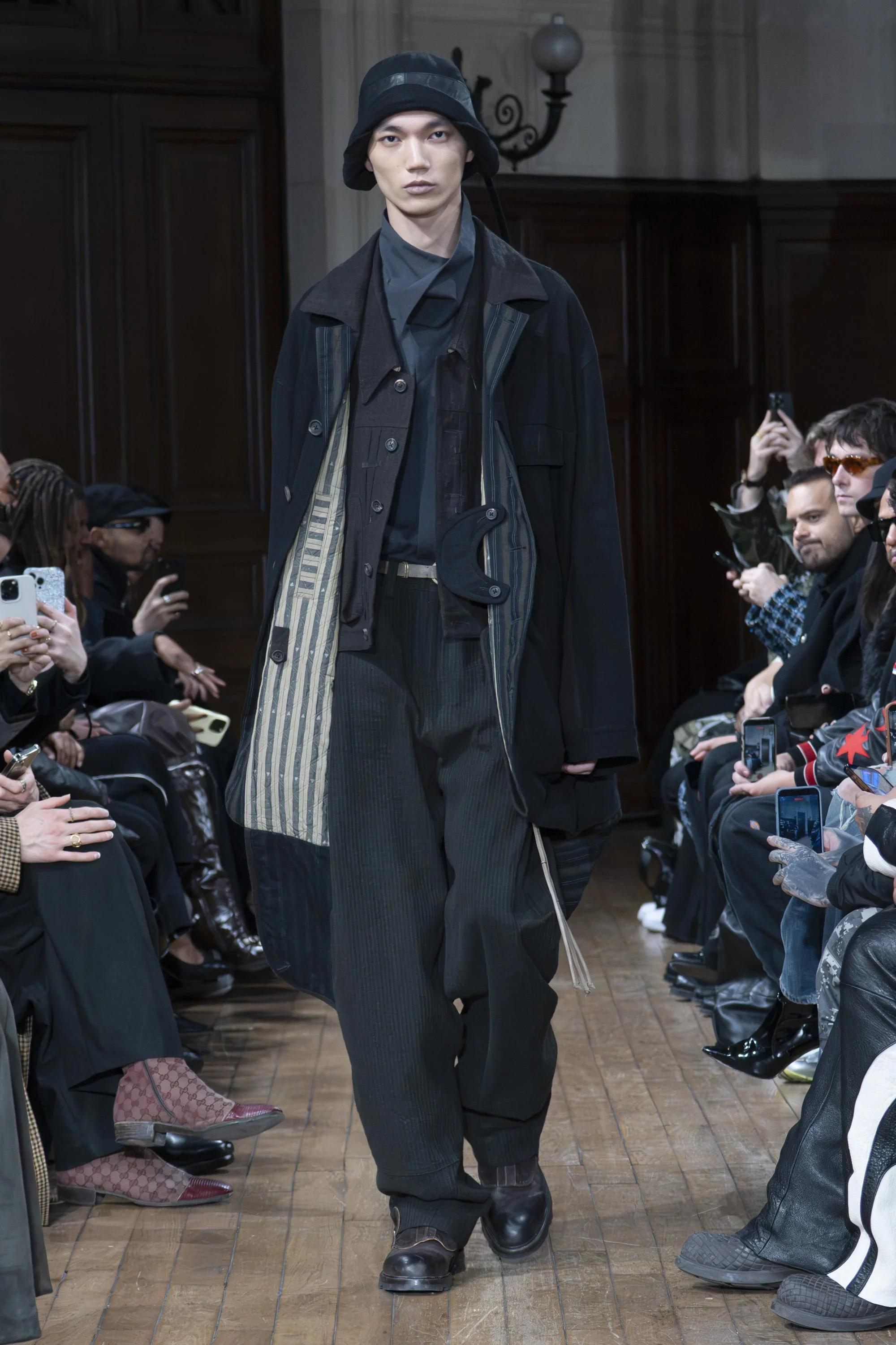Construction is deliberately visible. Linings appear on the exterior, and internal structures become part of the garment’s language. Patterns are drawn from hand-made marks and historical sources: stone surfaces, aged architecture and archival imagery translated into motifs that feel suspended between eras.